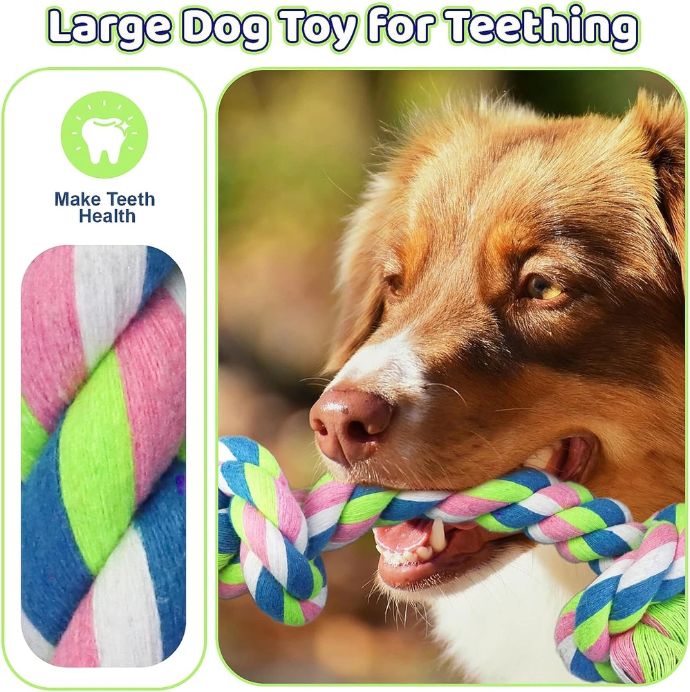 🐶【Most Complete and Value Dog Rope Toys Set】Designed for medium and large dogs.Larger, thicker, and more durable than other toys. Includes (20 inch) 4-knot long rope, (24 inch) 5-knot long rope, Two 19-inch heavy-duty tug-of-war dog toys, Two hand-held round rope ball dog toys, Two 2-KONT ropes, and One ball toy. The variety of styles and bright colors can stimulate the dog's senses and encourage the dog to play actively and be mentally engaged. 🐕【Dog Rope Toy For Aggressive Chewer 】Durable dog chew toy set is made of high-quality natural cotton, tightly woven, wear-resistant, and sturdy construction allowing the dog toy to withstand rough play and aggressive chewing. Say goodbye to flimsy toys that easily fall apart. 🐶【9 PCS Multi-Style Design 】Multiple styles and colors for dogs to choose from. Whether your dog likes to chew, chase or tug, our rope toys have it covered. Its versatile design allows for a variety of play styles. And is suitable for dogs of all sizes and great for playing outdoors or indoors. Allow your dog to find fun in interactions, reduce your dog's boredom, and improve your relationship with him. 🐕【Safe and Protect Dental Health】GASAPET Dog toys are woven from 100% high-quality washable cotton material. Safe, non-toxic, and free of harmful chemicals. It can keep your dog's teeth clean and healthy with our rope toy. The textured surface helps to massage gums and remove plaque and tartar buildup as your dog chews and plays, promoting better dental hygiene and fresher breath. 🐶【Best Gifts for Dogs】Colorful and multi-style design, is perfect as a birthday and holiday gift for your dogs. It's more than just entertainment, it's also a means of exercise that helps keep our canine companions healthy. Dog rope toys are consumable and not truly indestructible. If your dog is a very aggressive chewer, we recommend play with supervision. If you are not satisfied with the use, you can contact us at any time and we will respond within 12 hours. Product Description Most Complete and Value Dog Rope Toys Set Designed for medium and large dogs , also suitable for aggressive chewer s. Multiple styles and colors for dog to choose from. Whether your dog likes to chew, chase or tug , our rope toys have it covered. Its versatile design allows for a variety of play styles . And is suitable for dogs of all sizes and great for playing outdoors or indoors Includes and dimensions: One 5-knot long ropes (24 inch) One 4-knot long ropes (20 inch) Two heavy-duty 3-kont double ropes(19 inch) One hand-held round rope ball(15.7 inch) One round rope ball(7.8 inch) One ball toys (3.2 inch) Two 2-kont chew ropes (11.8 inch) .