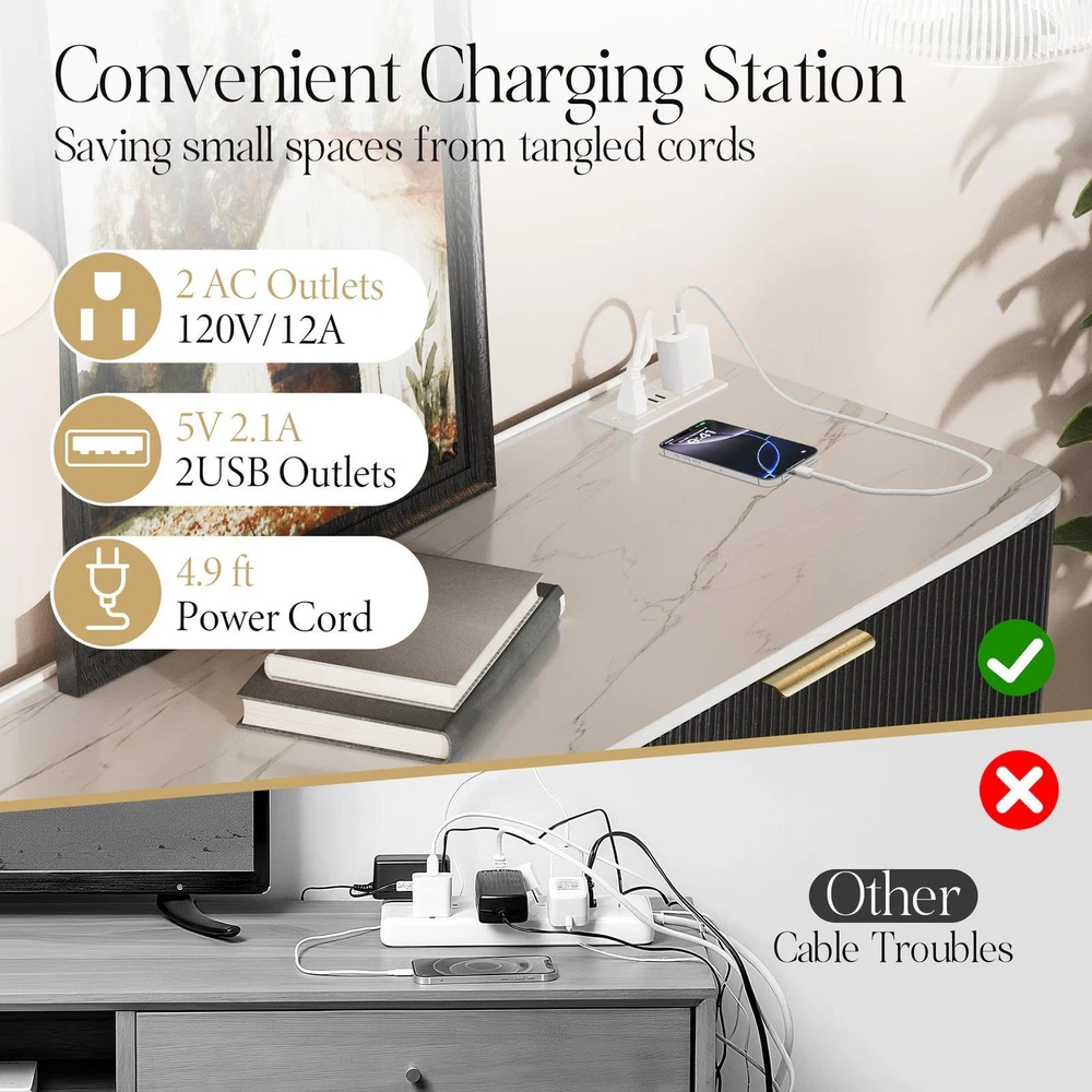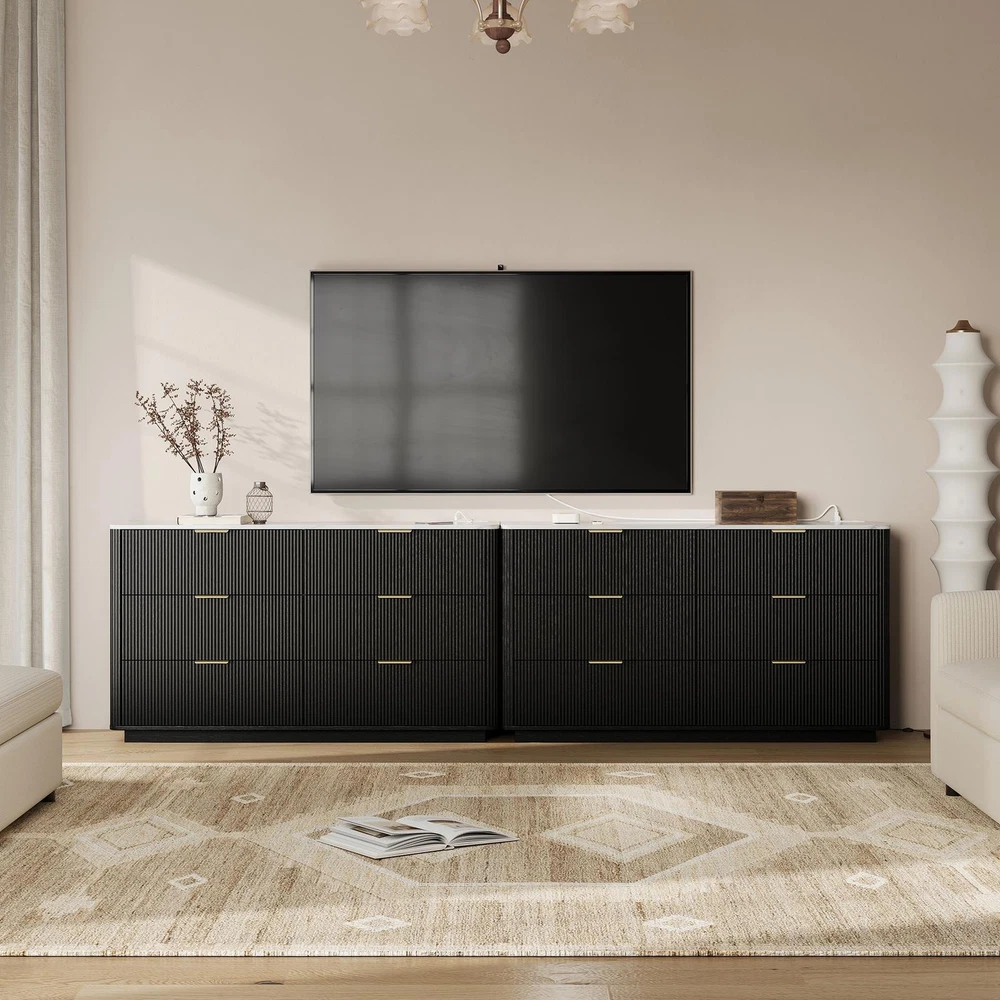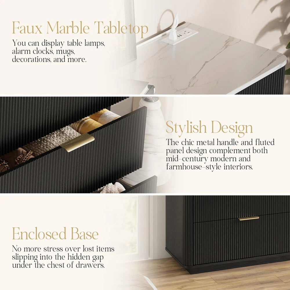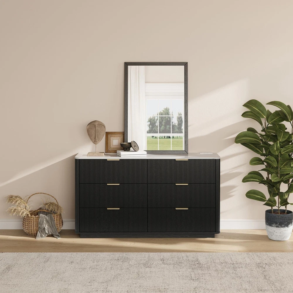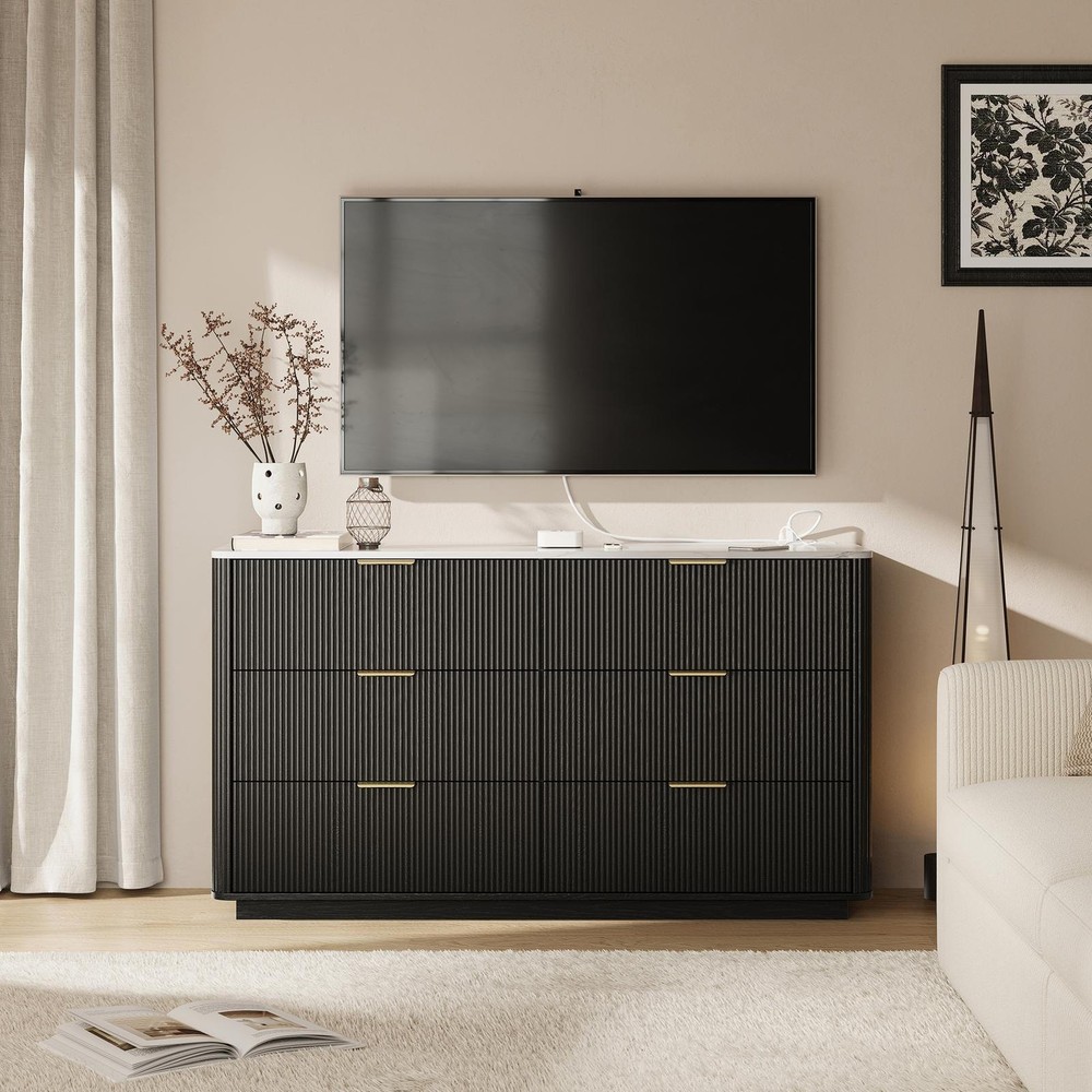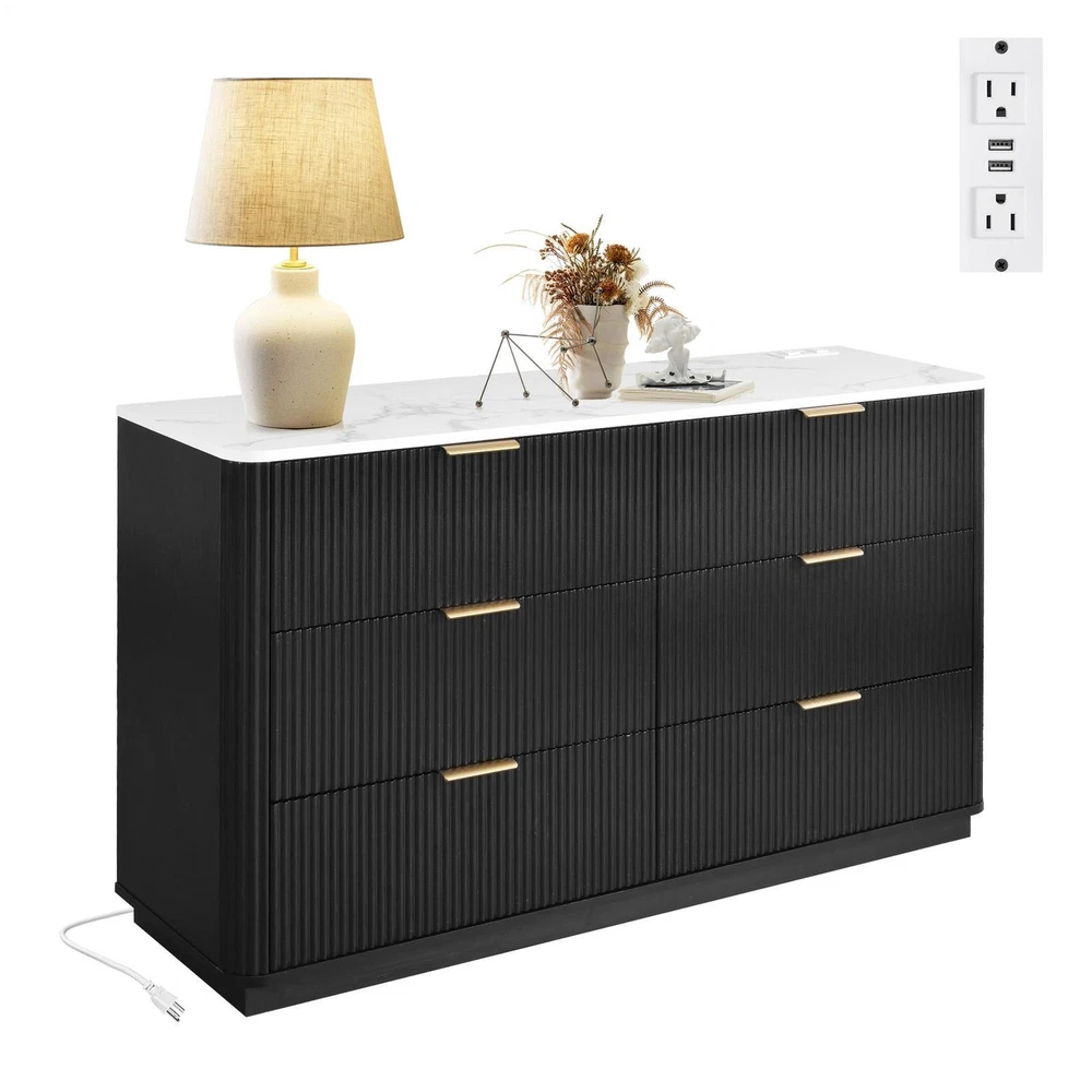 Large Dresser 6 Drawer Dressers TV Stand with Power Outlet & Faux Marble Top New