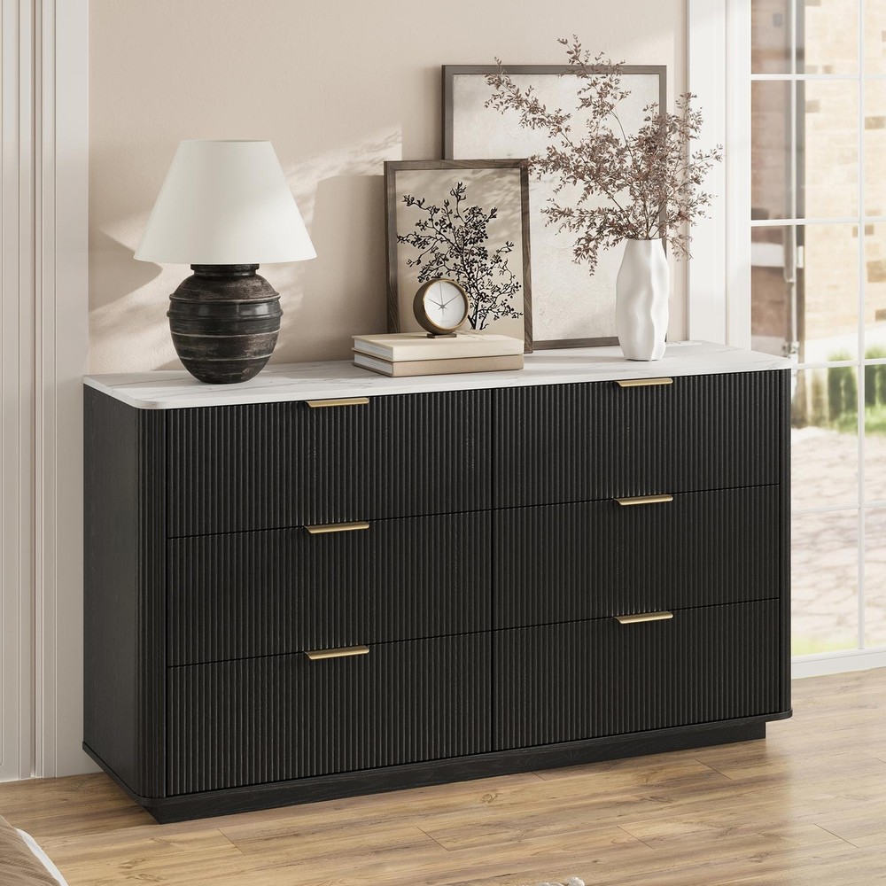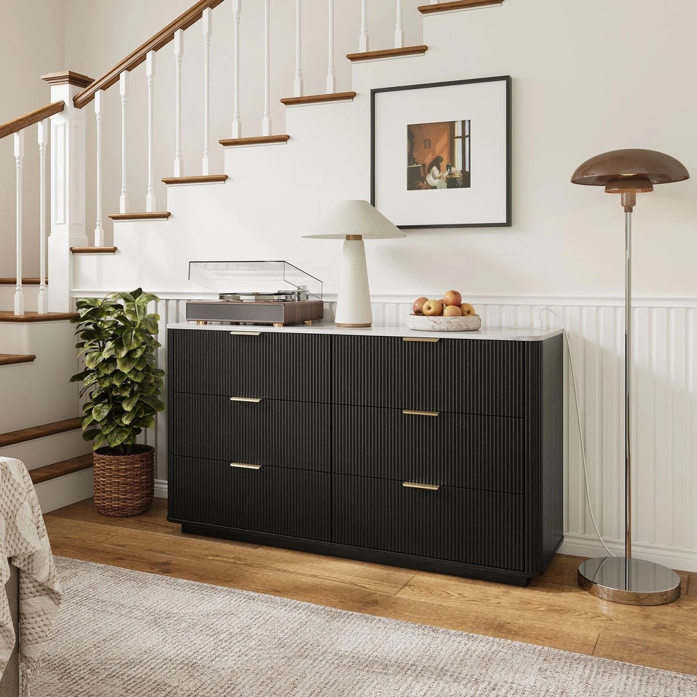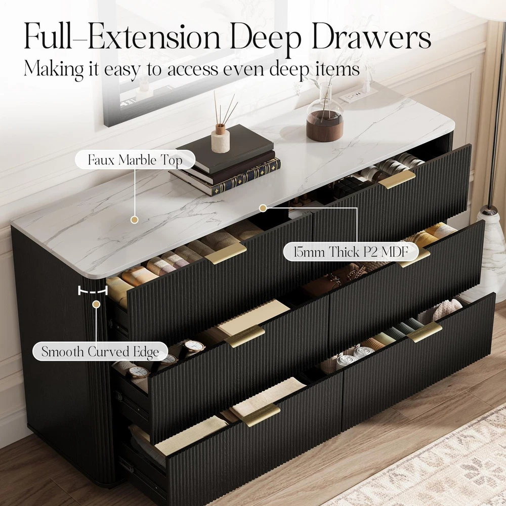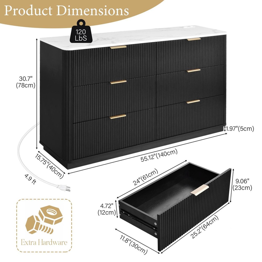 Store category Sign Up Now ! You may also like Product Description Bullet Points: Space-Saving Design: Serves multiple purposes, including bedroom storage, vanity, or entryway cabinet, with high capacity and sleek design that improves interior appeal in any functional space Functional Artistic Entryway: With mid-century modern inspiration, this dresser blends functionality and fashion seamlessly, offering refined grooved drawer fronts and soft curved sides that prevent bumps while standing as an artistic centerpiece in your entryway or bedroom, welcoming you with timeless grace Convenient Charging Solution: Featuring a built-in 2AC and 2USB socket strip, this dresser effortlessly powers beauty gadgets, humidifiers, phones, audio-visual setups, game consoles, and routers while its marble-look veneer top adds a refined sense to any bedroom or living space High Storage Capacity: Unlike paper-laminated alternatives, its melamine finish is easier to clean, providing smooth surfaces that resist stains while maintaining an elegant wood-like appearance. Holds 2x the capacity of standard 3-drawer cabinets and keeps clothes, linens, and daily must-haves neatly sorted Offered in Two Colors: The natural wood color exudes sophistication and warmth, creating a serene bedroom atmosphere, while the black color adds depth and an immersive feel, making it ideal for both bedrooms and living spaces, available in two elegant finishes to suit your decor needs ideally Featuring midcentury modern elements, this dresser provides wider drawer space to organize closets efficiently. Designed for bedrooms, living rooms, dorms, hallways, and flats, it ensures well-organized spaces with enduring appeal and functional versatility. Specifications: Product Name: 6 Drawer Dresser for Bedroom Dimensions: about 140x40x78cm/55.12x15.75x30.71 inch Sheet Material: 15mm/0.6 inch melamine MDF Drawer Sides/Ends: 12mm/0.5 inch melamine MDF Door Panel: 15mm/0.6 inch MDF, milled surfaces(groove shape) with PVC blister process Drawer Bottom and Back Panel: 3mm/0.1inch MDF Cabinet Color: Wood color/Black Socket Strip: White (2 USB + 2 AC) Handle: Gold Brushed Guide Rail: 12-inch/ 30.5cm Three-Section Rail, Black Packaging Size: about 154x50.5x21cm/60.63x19.88x8.27 inch Packing List: 1 x Six-drawer mounting parts 1 x Socket strip 1 x Installation instructions 6 sets of 12-inch rails 1 set x Mounting hardware ( self-tapping, etc.) 6 x hardware handles Notes: 1. Due to different lighting and screen settings, the item color may be slightly different from the picture. 2. Due to different manual measurements, please allow a 1-2cm difference in size. Payment Delivery details Terms of sales About us Feedback & DSRs Payment Before you palce an order, please kindly make sure that you have a paypal account. We accept PAYPAL payment only. Payment should be completed within 2 days after auction closed, or unpaid dispute will be filed for an closing auction. An unpaid case will be filled after 4 days. Delivery details We ship to your eBay address. Each package will be shipped to US by UPS Regular Parcel with tracking number. Please check your shipping address carefully before checkout, it can't be changed if order completed. All items will be shipped within 1-2 business day upon receipt of payment.Orders placed on weekend will be shipped within 3 days. If you do not receive your item in 7-10 business days.please contact us immediately for further assistance. We will be responsible for any damages or losses incurred in the shipping process. About us We maintain high standards of excellence FIVE STAR and strive for 100% customer satisfaction! Positive Feedback is very important to us. We hope that you contact us immediately Before you give us neutral or negative feedback, so that we can satisfactorily address your concerns. We promise to offer the lowest price and high quality produce. Our working time: From Monday to Friday(9:30 am to 18:00pm), we don't working on holidays ,hope you can understand and know that , thank you. Please always talk to us via ebay Message. We appreciate your business and look forward to growing our e-Bay sales with satisfied customers. Feedback Contact us If you have any questions, please feel free to contact with us by ebay Message during our business hours ( 9:30a.m. to 5:30 p.m.), or email us through eBay, we will try our best to help you to resolve it. For any presale or after-sale questions,please do feel free to email us! Due to the time difference, each email will be replied within 1 working day,and weekend will be delayed a bit. Feedback