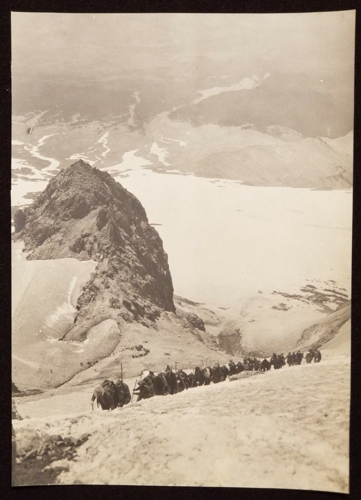 Large Early Photo of Mt. Climbers on Mt. Hood from the Hogsback. Ca. 1920. A great image of early mountaineering on Mt. Hood, Oregon. It is in very good condition condition considering it's age. Small tear on right side near snowline. Please see photos for condition. Size is 14"x 10". This came in a large collection of Curtis, Edson, Jacobs, Banks, Bradley, and Barnes. Please feel free to ask questions. Sold as-is. Shipping is $8.95 here in the states
