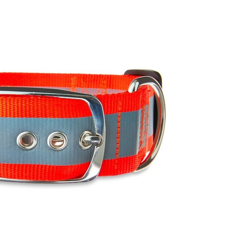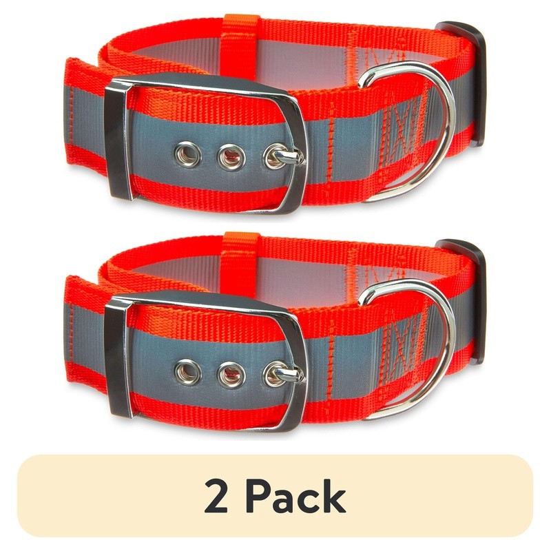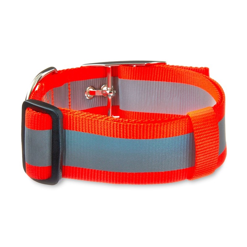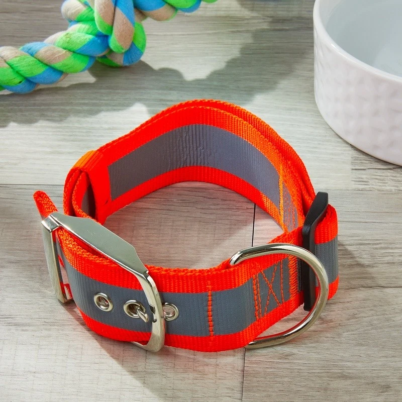 Secure your dog in style with the Orange Extra Wide Adjustable Reflective Collar for Dogs. An important part of taking good care of your canine companion is ensuring that they are appropriately tagged with their name, home address, and a phone number to call, and that's exactly what our reflective collar for dogs is designed to do. Its included D-ring offers the perfect spot to put those tags that your dog needs to showcase and provides plenty of space to attach a leash too. The adjustable design and sturdy prong buckle deliver a secure fit, so you can be sure your dog will always have their tags on them, and the reflective material allows for safe walks at any time of day, whether on the leash or off. This Orange Extra Wide Adjustable Reflective Collar is a size large and is ideal for dogs comparable to Labradors or boxers with a neck size between 15 and 25 inches. Help your pets live the ! Our products are specially crafted with one goal in mind, seeing your pet at its very best. With a variety of offerings designed to keep animals healthy, happy and energized, stands out as the brand that truly puts your pet first. Hunter Orange Extra Wide Adjustable Reflective Collar for Dogs, Large Comfortable and fashionable everyday dog collar Eye-catching orange with gray reflective stripe and silver hardware Extra-wide 1 3/4" width Features a prong buckle for secure wear Easily adjustable for a perfect fit Reflective material helps ensure your dog is visible during evening and nighttime walks