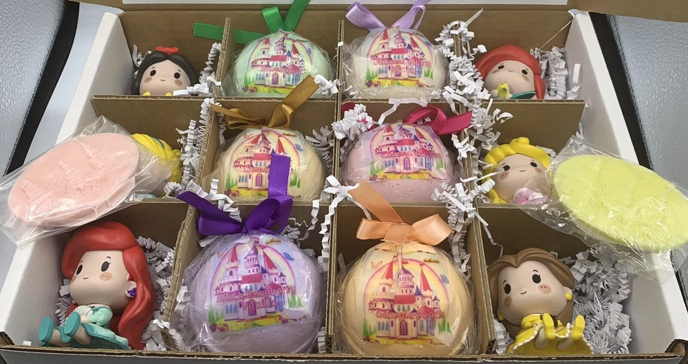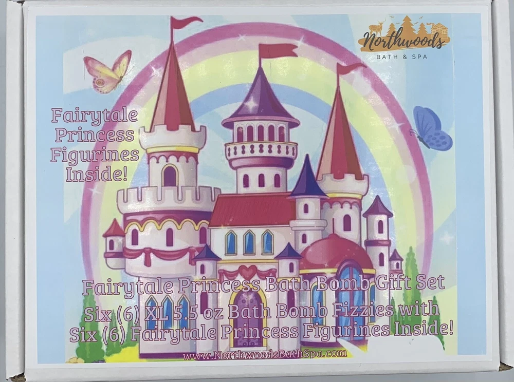 Large Fairytale Princess Figurines 6-pack Bath Bomb Gift Set. Includes six (6) XL 5.5 oz bath bomb fizzies and six (6) Fairytale Princess Figurines. The Fairytale Princess Figurines are too large to fit inside the bath bomb, so they are loose inside the box next to the bath bombs. The fragrances in this gift set include Black Raspberry Vanilla, Bubblegum, Cherry Vanilla, Clementine, Georgia Peach, and Oatmeal, Milk & Honey. (As we make more bath bombs, we will be adding other fragrances to this gift set.) We also include two (2) Goat's Milk & Shea Butter handmade castle soaps. PREMIUM QUALITY - Handmade in Arbor Vitae, Wisconsin. Natural and organic. Comparable to Lush Bath Bombs, ours are 5.5 oz each. PERFECT GIFT IDEA - Includes six (6) XL 5.5 oz bath bombs and six (6) Fairytale Princess Figurines loose inside the box. The Fairytale Princess Figurines are too big to fit inside the bath bombs. The Fairytale Princess Figurines come individually wrapped inside a clear cello bag. NATURAL, VEGAN, ORGANIC, cruelty free. Made with luxury ingredients including Shea, Mango & Cocoa Butter that will help leave your skin feeling soft and smooth. SATISFACTION GUARANTEE - We want you to be happy with your gift set. The fragrances in this gift set include Black Raspberry Vanilla, Bubblegum, Cherry Vanilla, Clementine, Georgia Peach, and Oatmeal, Milk & Honey, but we will be adding other fragrances to this gift set in the near future. Shipped via the cheapest rate I can find! USPS Ground Advantage, priority mail, UPS, etc. Check out my website for other gift sets for kids.