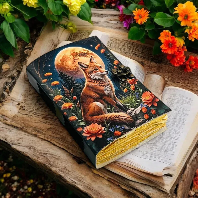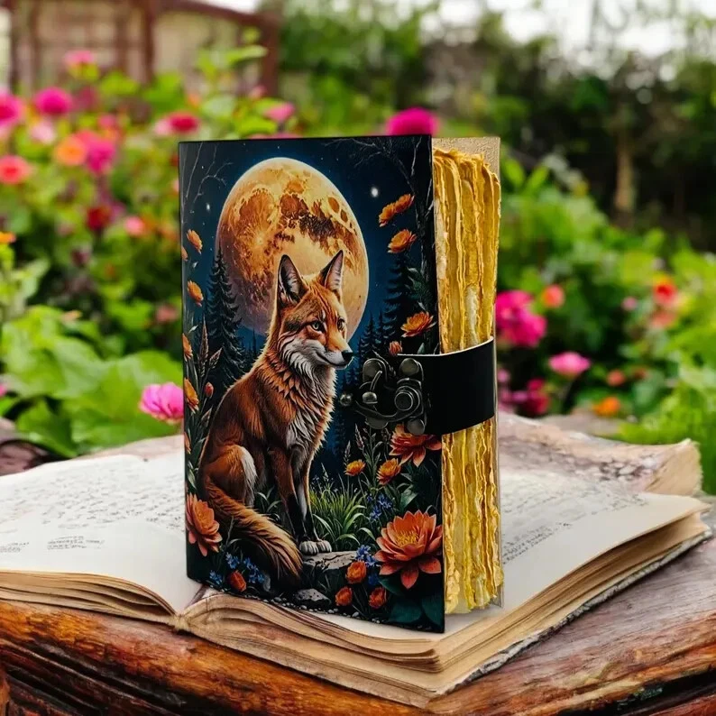 Large Grimoire Fox Leather Journal Notebook Blank Spell book of shadows Fat journal - Handmade paper Vintage Journal for women •Fox Leather Journal Rustic vintage leather • C-Lock brass • genuine buffalo leather • vintage deckle edge old paper. • 200 Sheet (400 pages both side) • Available all Size 7x5'' 8x6'' 10x7'' 13x10 '' 22x14'' Fox Leather Journal Rustic Notebook for Writing & Sketching Gift for her, Handcrafted Diary, Book of Shadows, Vintage book, Blank spell book Grimoire journal - Blank spell witch, book of shadows, Gifts For Men and Women ● Antique Paper - Vintage Journal is made of unique vintage paper which looks like it was pulled from history. You will love the old looking handmade cotton paper (200 pages) which is unique to our vintage journals. ● VINTAGE LOCK AND STURDY BINDING - The vintage lock will keep all your valuable writing locked inside.Sturdy hand stitched binding to make sure that no paper comes out loose from your vintage notebook. ● Sketchbook is great for keeping by the bedside to jot down dreams, or for use as a diary or journal. ● It is a truly unique and wonderful gift for a friend, the men, women, and wiccans in your life! or to treat yourself to as a special keepsake ● our journals are influenced by symbolism that is derived from the Wicca/Pagan community, creating a personalized space where your inner creative genius can flourish. ● The paper is made from sustainable cotton and jute canvas. The paper is acid-free and pH neutral therefore is a timeless piece of art. ● Use Any Kind Of Pen - Sketch, Doodle, Write on your journal notebook with a Calligraphy Pen Fountain Pen, Brush Pen, Ball Pen, Acrylic Colours, Watercolor and many more. Grimoire The Skull lover Leather Print journal Antique Notebook And Deckle Edge unlined paper. My clients usage: Gifts for him , valentines gift, anniversary or wedding or housewarming gifts, home decor, modern home decor and many more