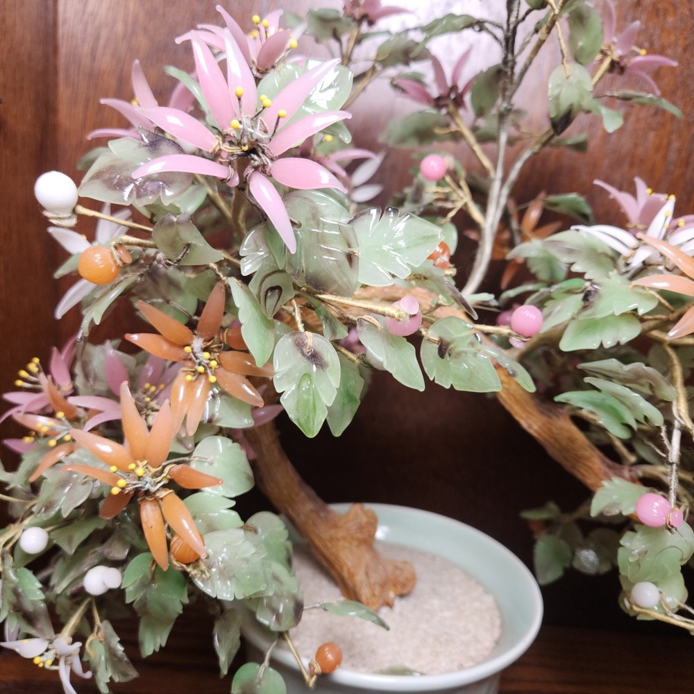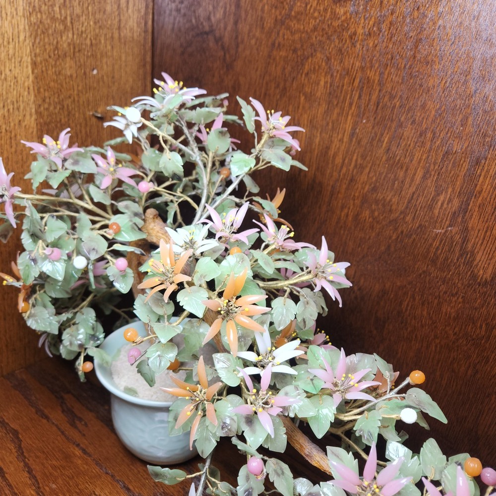 $ 10.04Vintage Chinese Gemstone Bonsai Tree – Multicolor Flowers in Ornate Carved Pot