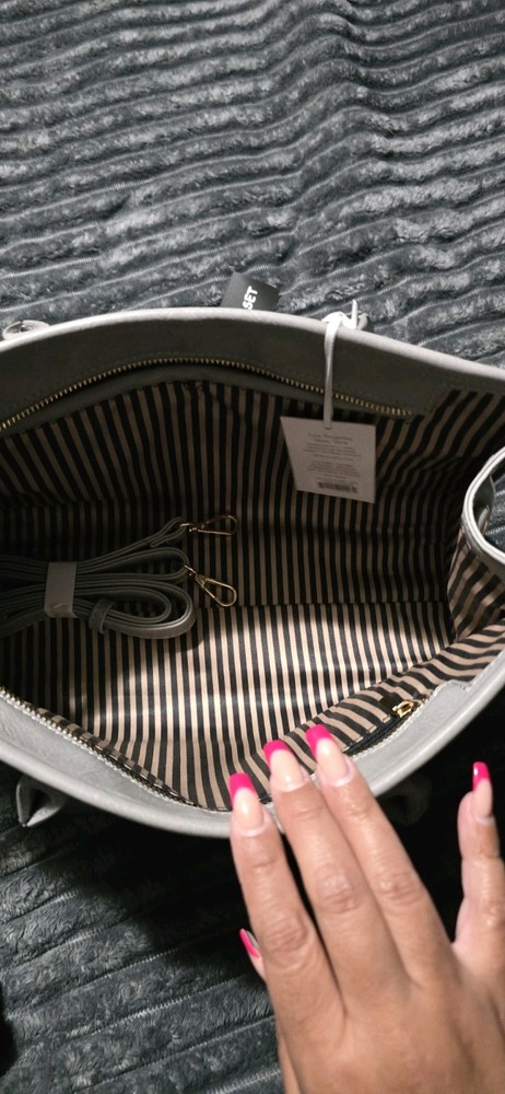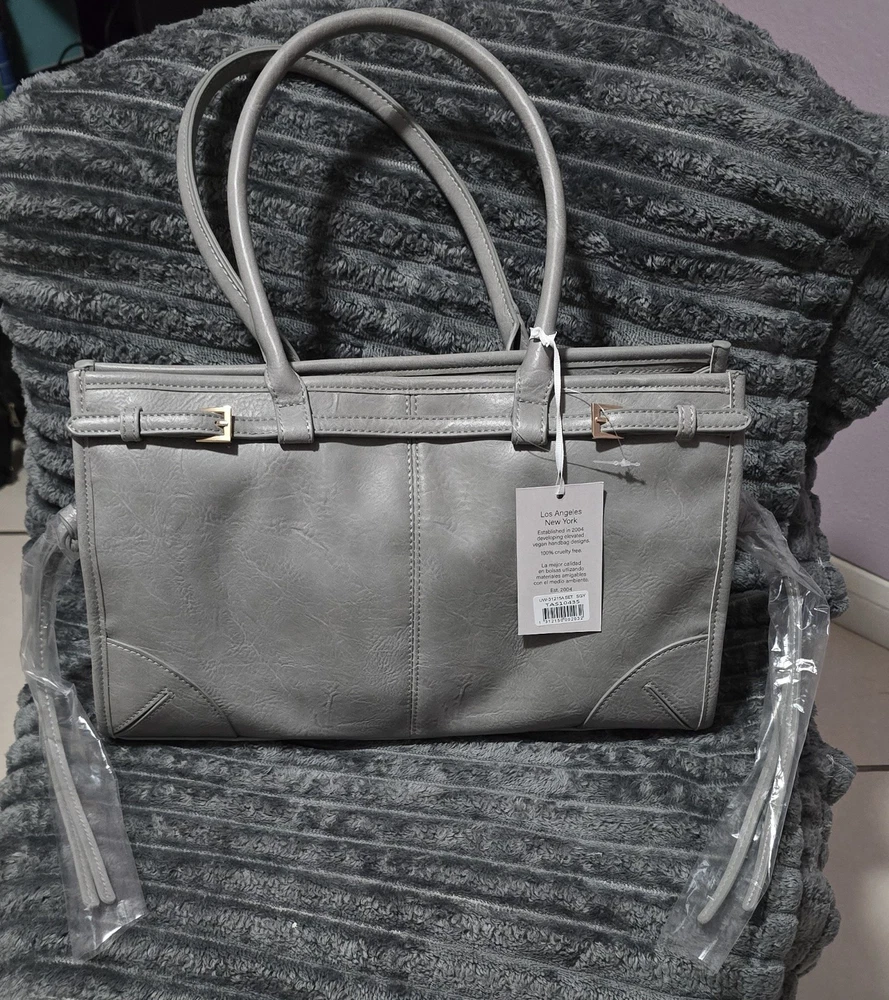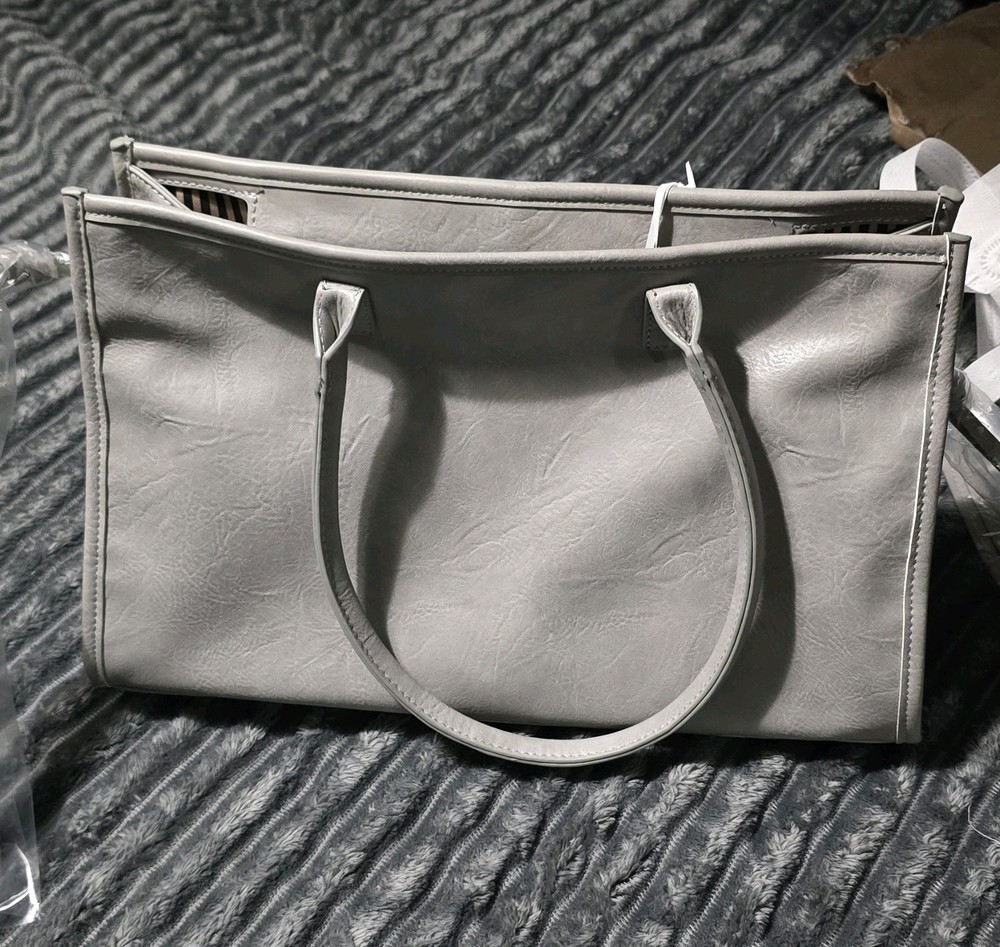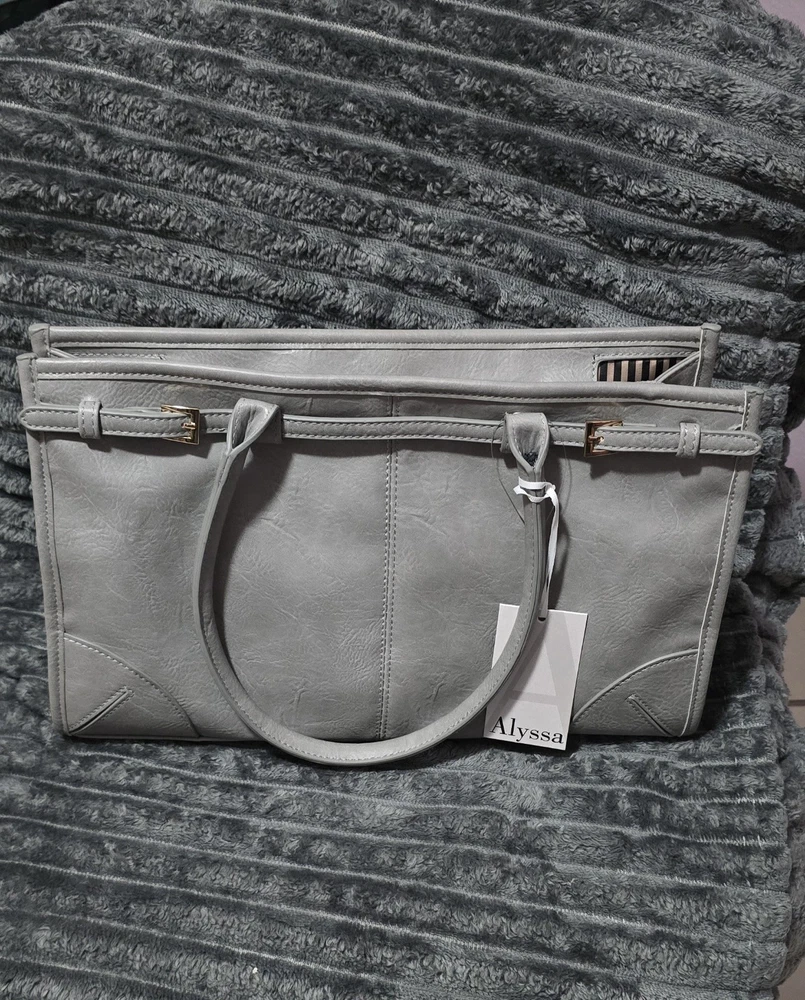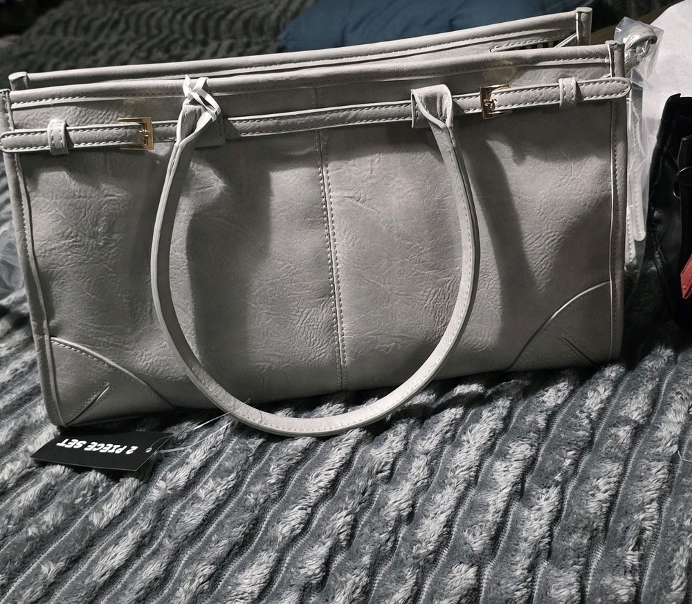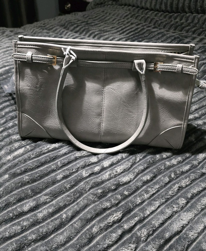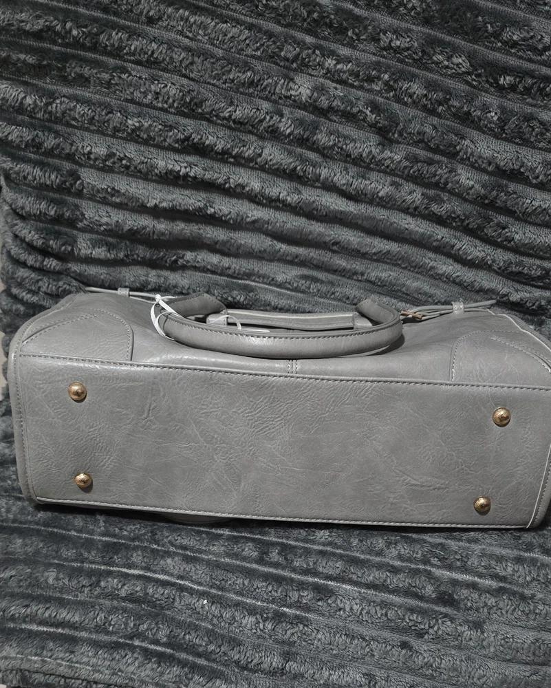 The Large Grey Top Handle Shoulder Bag with Crossbody Strap is a stylish and versatile accessory for women. Made from vegan leather with a solid grey exterior, this bag features a gold hardware accents and a zip closure. The satchel/top handle style offers both convenience and fashion, while the large size provides ample space for all your essentials. With a comfortable crossbody strap, this bag is perfect for on-the-go use or everyday outings.
