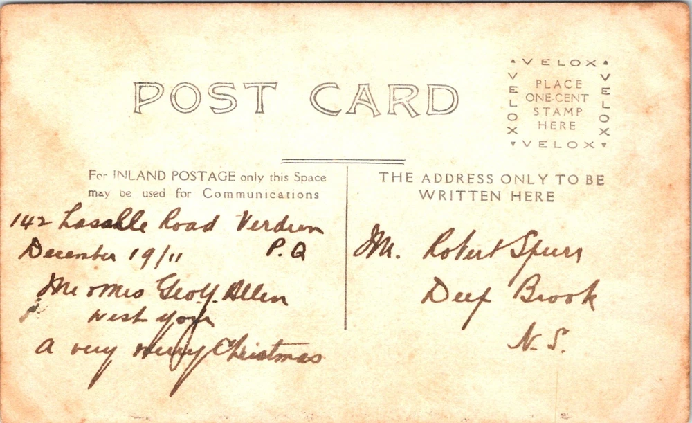 Large Group of People Sitting Outside a Store Front Vintage RPPC Postcard 24087 Front of Card: The image shows a group of people dressed in Western-style costumes, posing for a group photograph. The individuals are wearing cowboy hats, boots, and other Western attire, and some are holding musical instruments such as guitars. The setting appears to be indoors, possibly in a studio or a performance venue. The text on the image reads "Ken MacKenzie Bigger & Better Radio Revue." This suggests that the group might be part of a radio show or a musical performance group. It's an interesting snapshot, capturing the charm of Western-themed entertainment from the past. Back of Card: The image shows an old postcard with handwritten text. The postcard is divided into two sections: the left side for communication and the right side for the address. The text on the left side reads: "142 Lasalle Road Verdun P.Q December 19/11 Mr & Mrs Geo. H. Allen wish you a very Merry Christmas" The address on the right side reads: "Mr. Robert Spear Deep Brook N.S." The postcard also has printed text indicating where to place a one-cent stamp and instructions for inland postage. This vintage postcard offers a heartwarming glimpse into the past, capturing a holiday greeting from the early 20th century. It's interesting to see how people used to convey their festive wishes through handwritten messages on postcards.