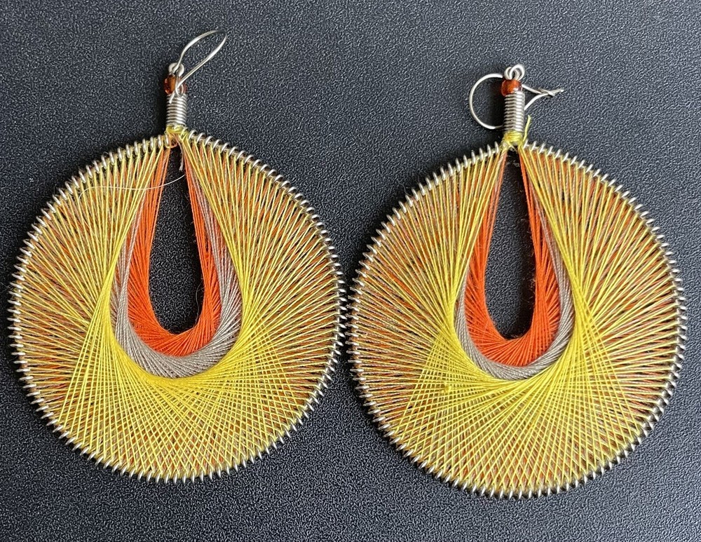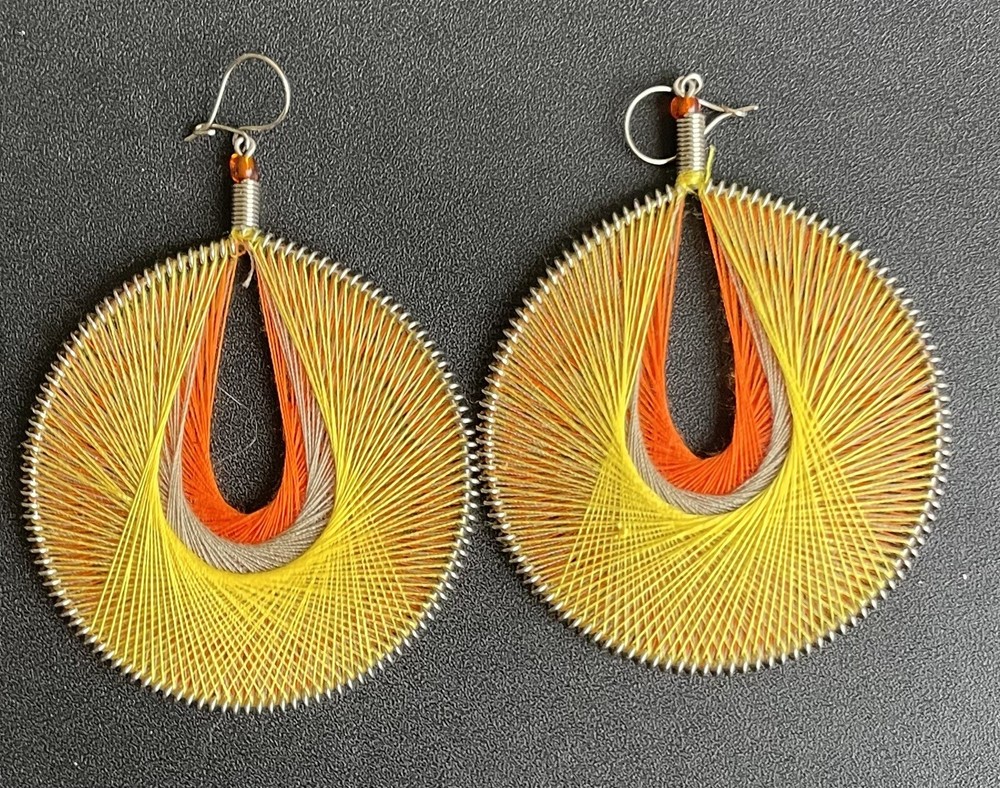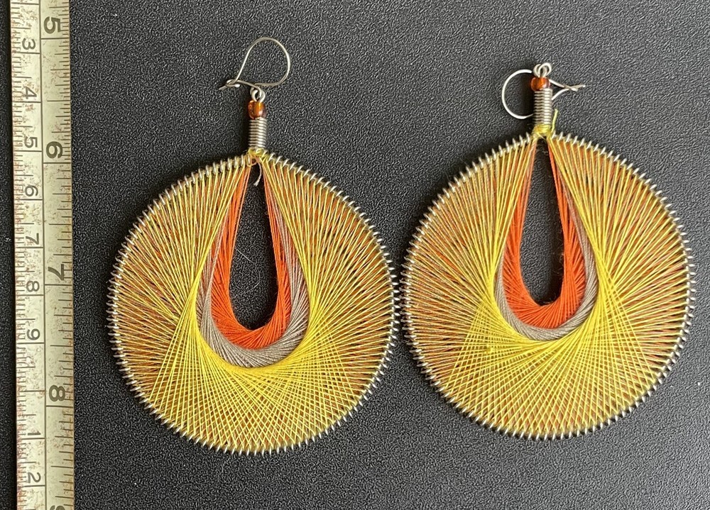 This listing is for a pairs of large round shaped yellow, grey and orange silk thread earrings. The earrings are made with thread and alpaca silver. Alpaca silver is an alloy of zinc, iron, nickel and copper. It is extremely lightweight and will not rust or tarnish. The earrings were handmade in Peru and are approximately 3 1/2" long with the ear hooks included. You will receive the earrings pictured. The earrings are for pierced ears. 0-ea-th-royelorggr-1