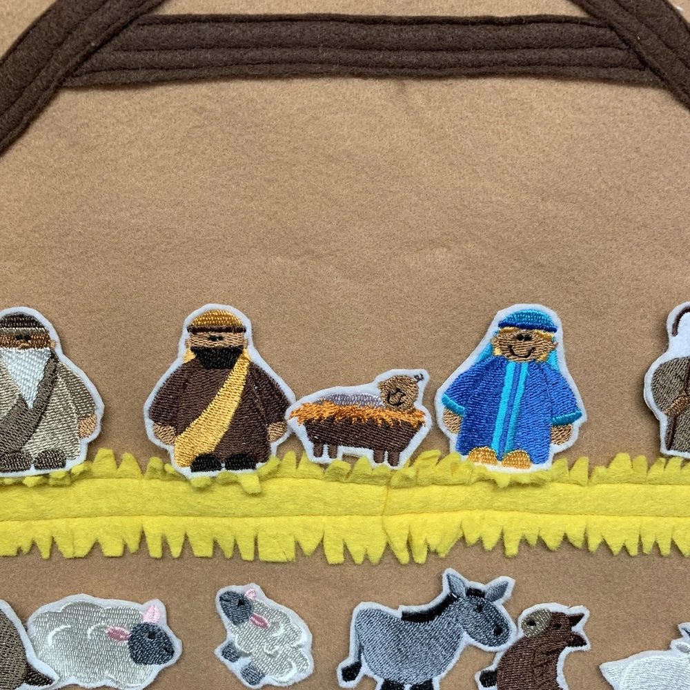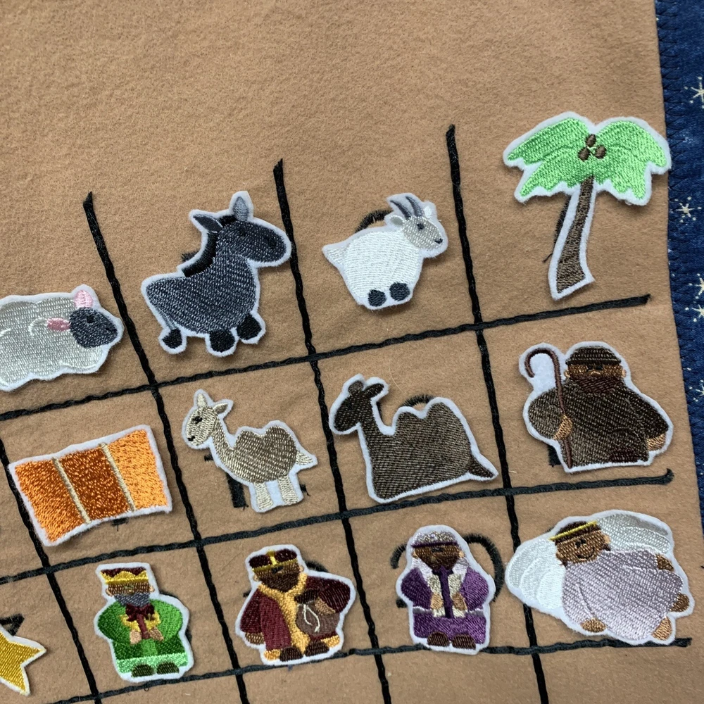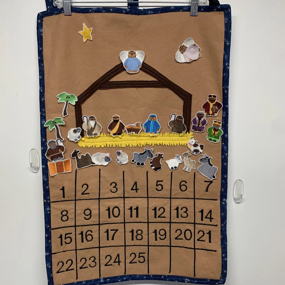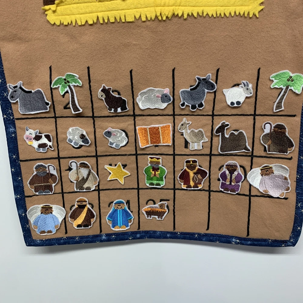 Super cute advent calendar! This is made out of felt and fabric. Each day has a embroidered figure to be placed in and around the stable. Includes various animals, palm trees, hay bale, shepherds, 3 kings, star, angels and of course Joseph, Mary & Baby Jesus. Each piece has hook & loop attached to the back to secure to the stable area. Excellent pre-owned condition! This item is large and measures 27” height x 18” across.