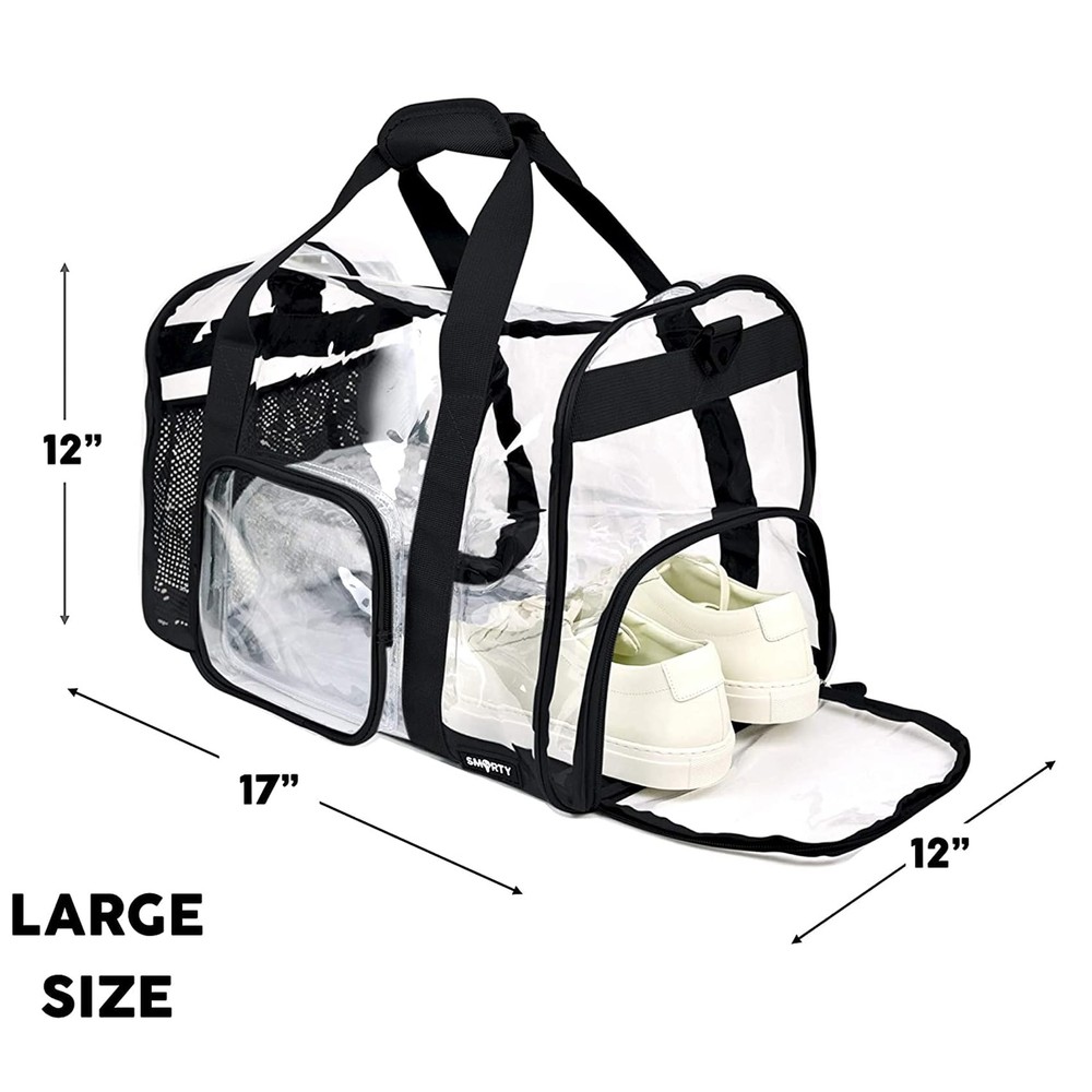 Size: biggest durable clear gym bag 17" x 12" x 12”(H x L x W) Strong Durable Heavy Duty Clear Material with Reinforced Double Stitching and Double Backed Nylon Webbing for game day, travel,and work Multifunctional compartments and large capacity: 1 large zippered main compartment for golf balls, sportswear, cosmetics, cell phones, etc., 1 separate inner pocket for sports shoes; 1 side mesh pocket for water bottles, 1 small pocket with zipper for tissues, keys The clear PVC package allows you to see exactly where everything is. You can easily get what you want in the first place Wide Usage: it is perfect for traveling, outdoor activities, baseball, football, basketball, and clothing storage. This large travel clear bag can be transformed into a sneaker bag, gym bag, sports bag, boxing bag, athletic bag