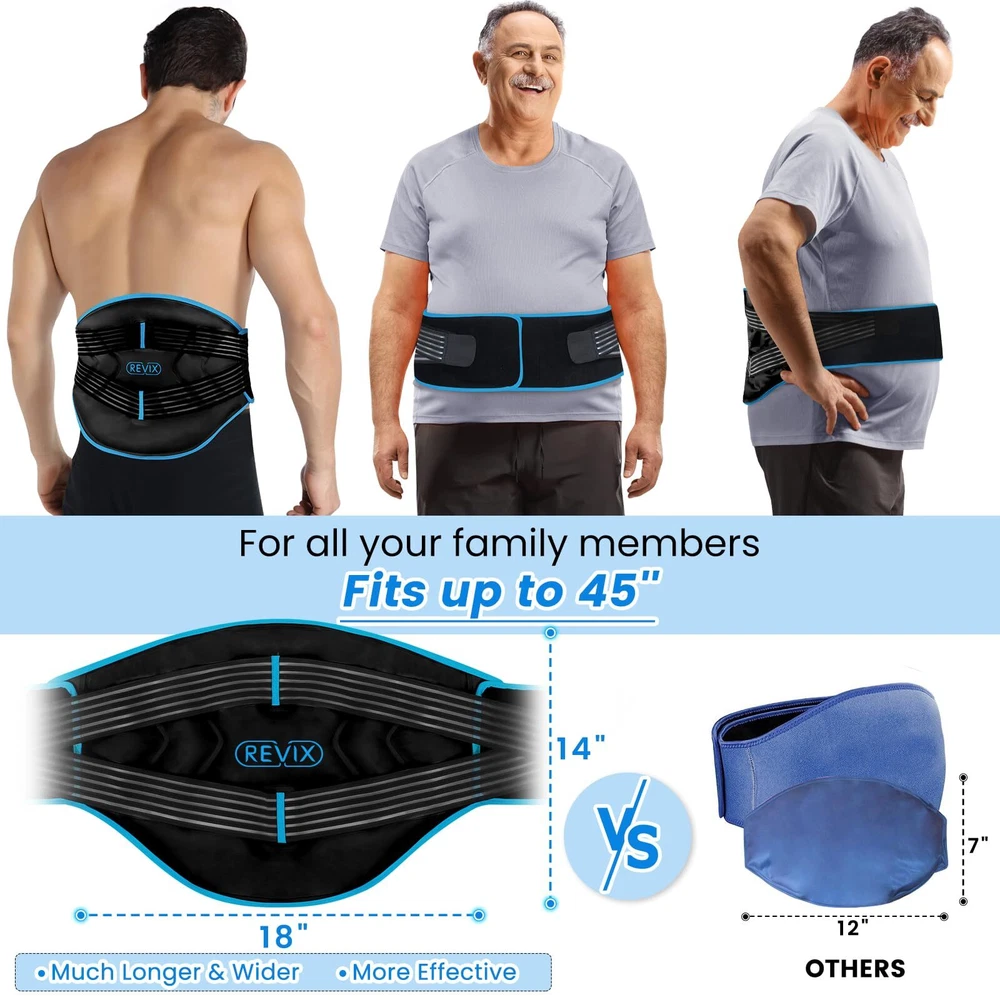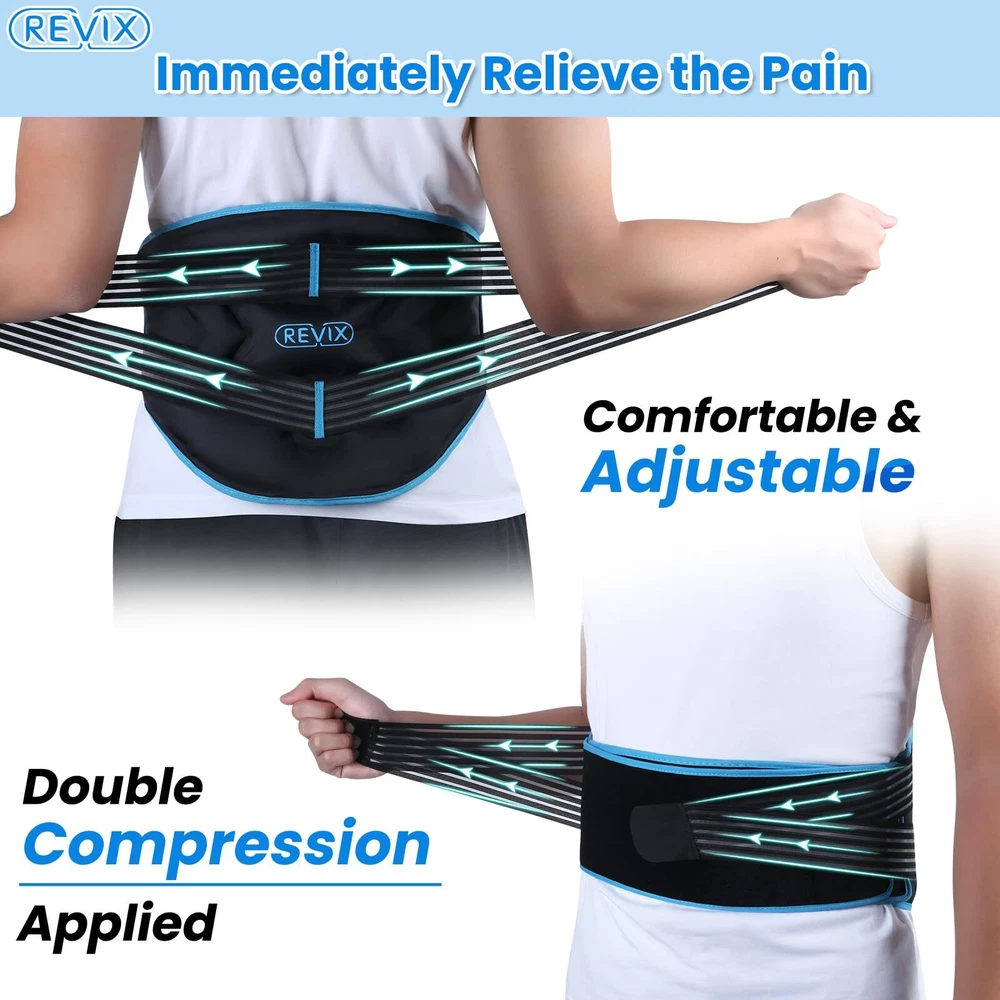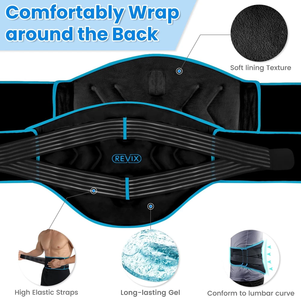 Cold Energy and Compression Therapy Combination: This large ice pack for back with built-in feature to avoid the hassle of inserting an individual gel pack. Filled with thick lower ice point gel to stay colder for longer to reduce general aches and pains or when recovering from surgery Lifesaver for Back Pain Suffer: The ice pack for back pain relief is easy to apply with a skin-friendly soft plush lining to avoid condensation water dripping during therapy. Back ice pack for lower back pain features a large area of 18 x 11.4'' achieving maximum relief for lower back injuries, spinal or cervical discomfort Upgrade Double Compression for Pain Relief: Lower back ice pack design with dual elastic straps provides uniform compression to accelerate recovery. You can adjust it nice and snugly to get right to the spot to relieve chronic pain, swelling, sprains, and inflammation effectively One for All Family Members: Gel ice pack for back with a long and wide strap fits waist up to 45 ''. The back brace ice pack with stretchy and firm strap holds very well in place allowing it to be mobile rather than lying on the bed for lower back pain relief Feel Better, Live Better: Cold packs for back pain with cold compress design feature double wide seam edge to prevent gel leakage. Storage bag included for keeping it neat in the freezer. With its professional design and quality materials, back pain relief device is an optimal choice for you