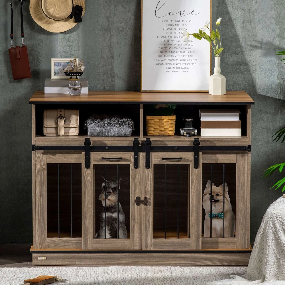 This kennel is a game-changer for pet owners! The removable divider makes it super versatile—perfect for two dogs or extra storage. Love the open shelves for keeping toys and essentials organized, and the sliding doors save so much space. It blends right into home decor while keeping furry friends comfy. Sturdy, functional, and stylish—totally worth it!