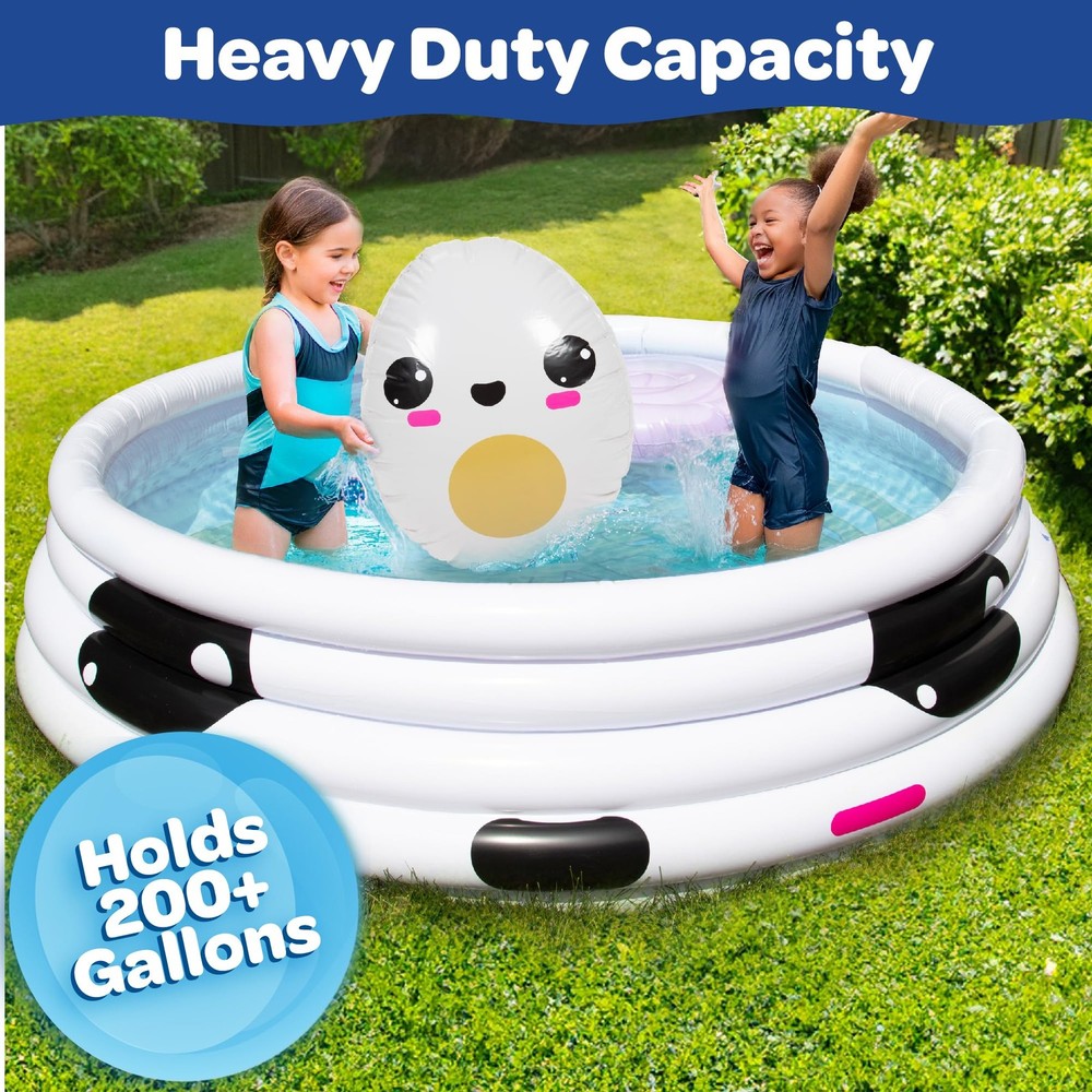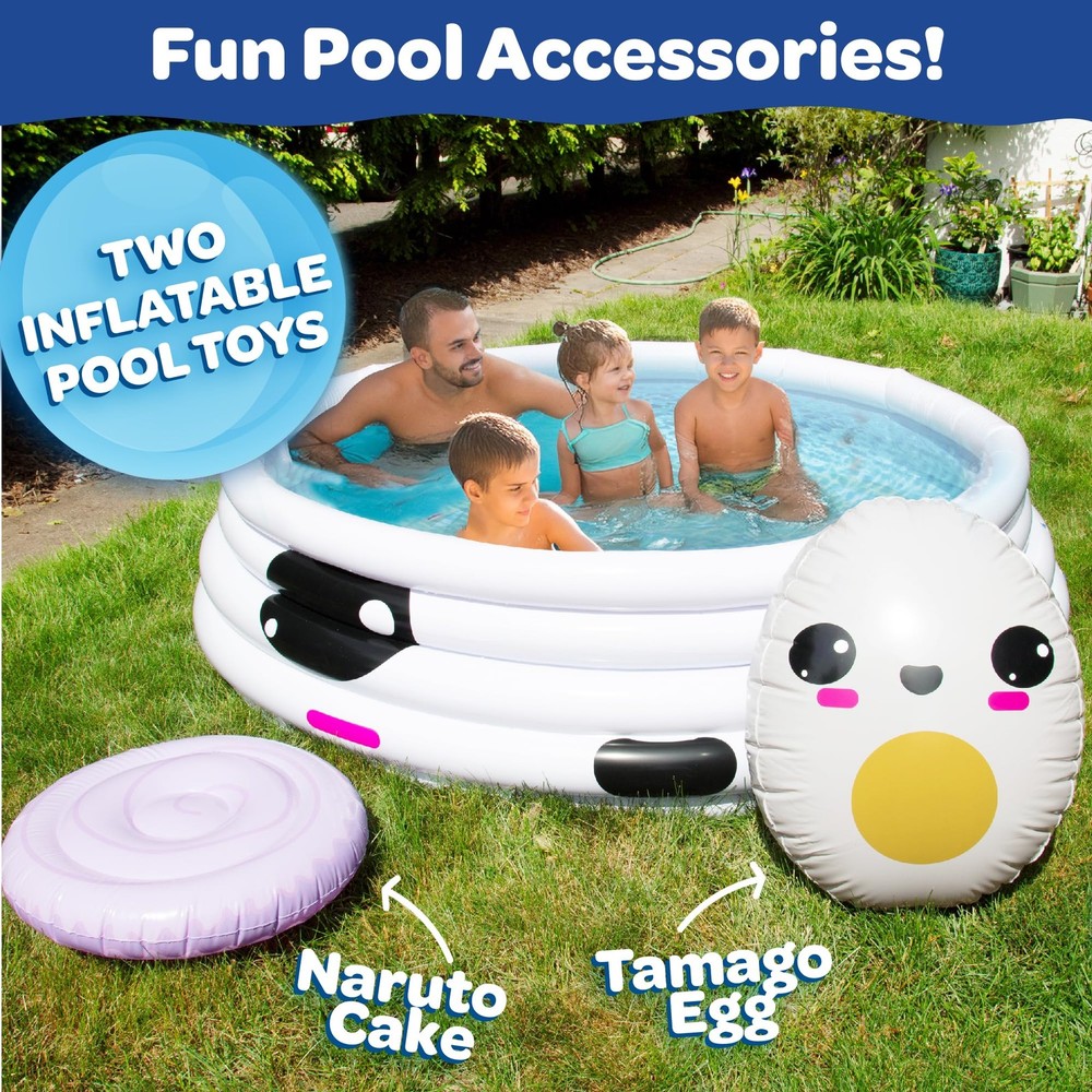 Aquamazing Large Inflatable Kiddie Pool has the most adorable ramen theme! This children's pool comes with exciting inflatable play pillow floats and accessories, Measures 67" x 26" and is the perfect family sized kiddie pool for baby, toddlers, kids, & adults. The perfect gift for any ramen lover! ADORABLE RAMEN THEME: Unique design features Ramen noodles on the pool floor! INFLATABLE ACCESSORIES INCLUDED: Pool features large tamago egg and fish cake inflatable toys - Great for pictures and parties! SUPER STURDY AND DURABLE: Heavy-duty durable 6P-free PVC plastic resists tears and punctures for long-lasting usage. Sturdy design is built to last! EASY TO DRAIN WATER AFTER USE: Includes drain plug for easy draining PERFECT FOR FAMILIES WITH KIDS: The perfect gift for any ramen lover! Great for pool parties, rivers, lakes, backyard and outdoor activities and more!
