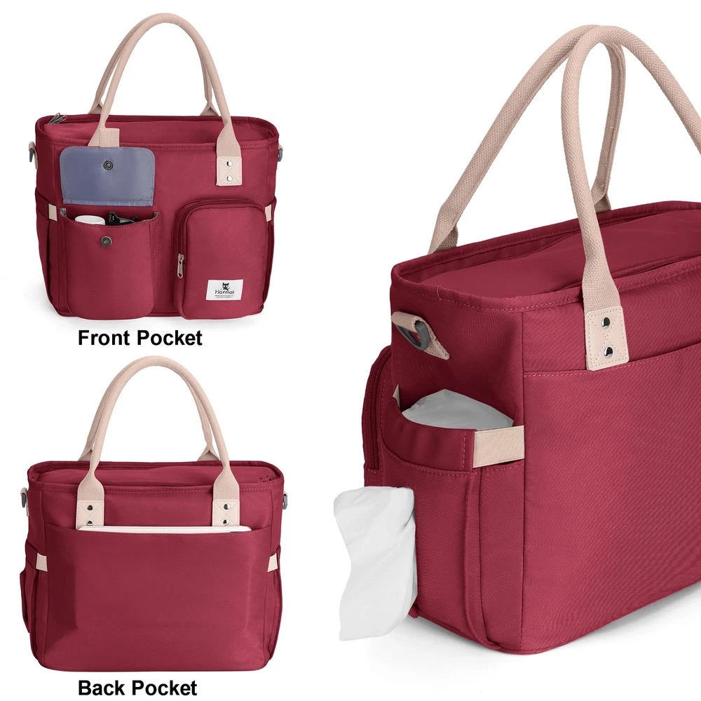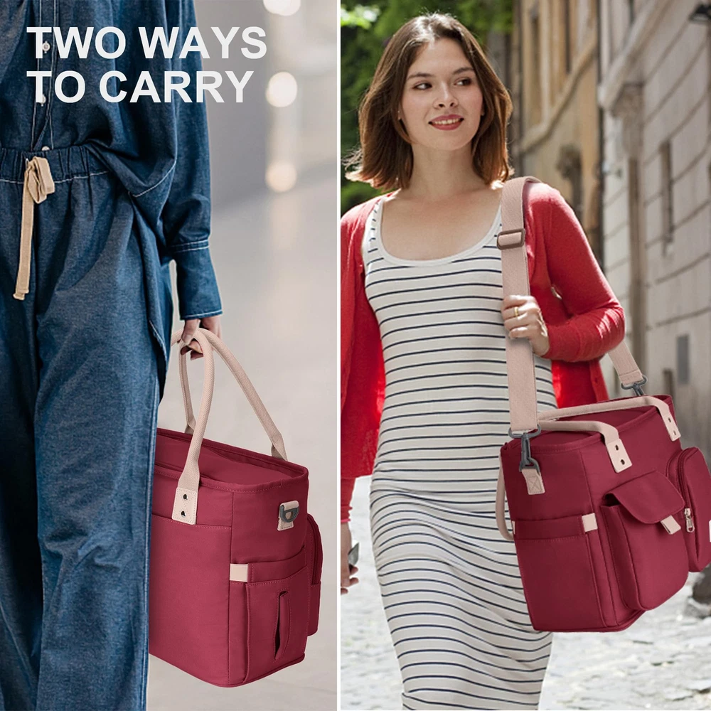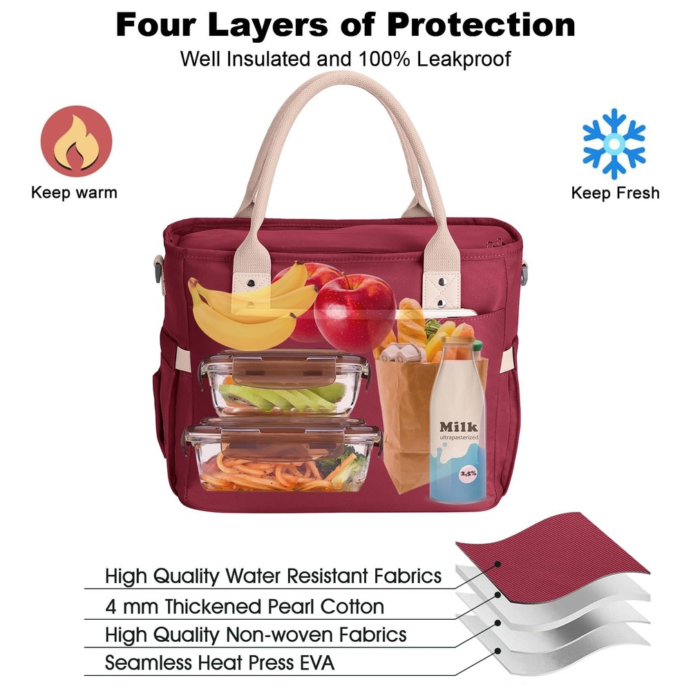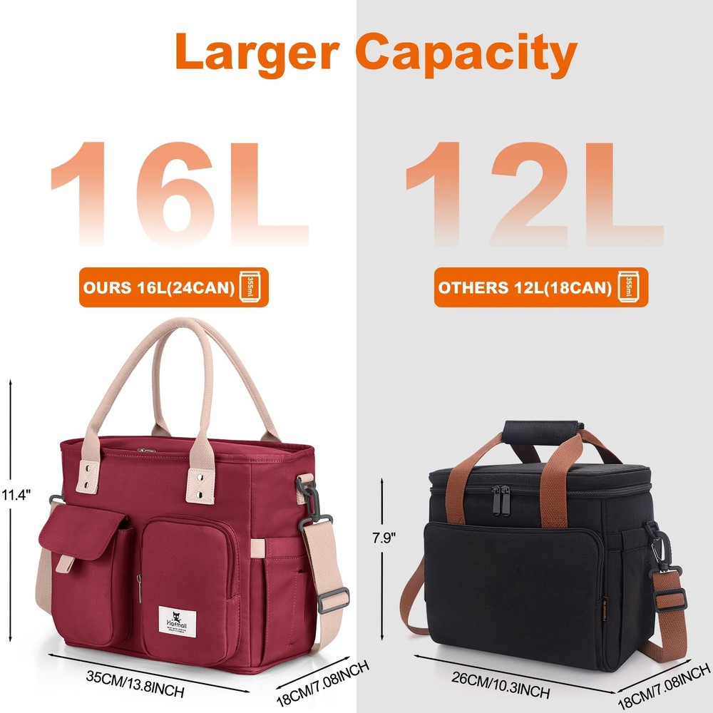 【WELL MADE AND DURABLE】This is a very well designed, beautifully manufactured, and super attractive lunch bag. It is constructed well with good stitching and materials. The exterior has lightweight water resistant fabric and is easy to clean, and the interior is high quality insulation, and built-in thick PE foam to keep your food and drinks warm/cool for hours, and keep cold longer when using an ice pack. 【WIDE OPENING AND LARGE CAPACITY】The zippers of lunch bag open smoothly and flap is wide for you to pack and access food and drinks. The bag is a large lunch box that can hold over 24 cans x 330ml of Coke, providing enough capacity for you to take all food plus wallet, keys, etc. and without having to bring an extra purse to work, so if you need a large and stylish lunch box, this is the one for you. 【STYLISH AND USEFUL】This lunch bag so versatile and stylish. It has a great look and feel, with 5 exterior different style pocket. It has a pouch on one of the ends that is roomy enough to hold a good size insulated flask bottle. The other end has a pocket for a pack of tissues or wipes. It has two pockets in the front for cell phone or wallet and one larger pocket in the back that could be used for a note pad or file. 【EASY TO CLEAN AND CARRY】This is a leakproof lunch bag and its inner insulated features seamless heat-press technology, so if something spills it can be easily cleaned with a damp cloth. The lunch bag is very portable, and it comes with a shoulder strap and you can either carry it from the handle or wear the shoulder strap. 【MULTIPLE OCCASIONS】This lunch bag is super beautiful and huge. You could fit a bunch of food containers inside, enough for 2 people, or enough for a full day's worth of food at least. Whether you're taking it to work, on a picnic, or anywhere else, this lunch bag is a fantastic companion that keeps your food fresh and your style on point. This bag is still a great gift option for Christmas, Mother's Day, etc.