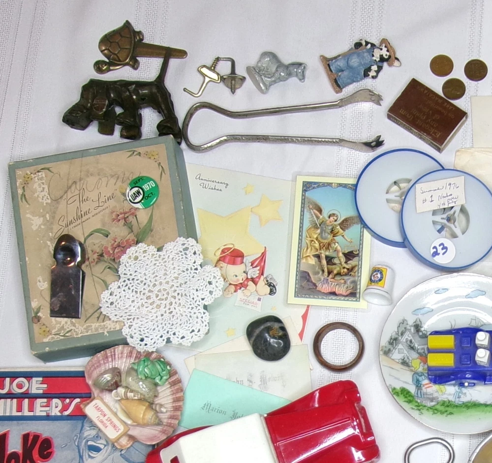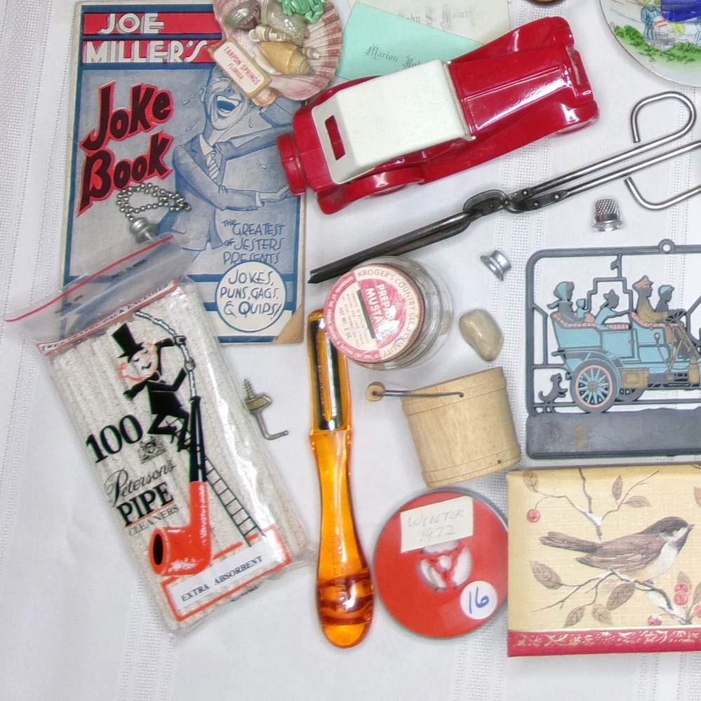 DETAILS · Large and unique lot of mostly vintage items & treasures; There are also a FEW “current day” (post 2000) items as well. · OVER 50 total different objects & knick-knacks. · Includes everything from vintage & rare treasures to everyday drawer stash objects. Fun to scavenge, pick, and identify. See photos for what is included in this lot. · Items have been sorted to include mostly objects in “good” to “very good” condition. Some things may have wear commensurate with age. Very few items may have tiny chips or repairs. - VISIT MY EBAY STORE! - I am selling many other vintage items and offer combined shipping; Message me for a quote. _____________________________ If there is any issue you are not happy with, please message me directly. I aim for 100% satisfaction! _________________________________________
