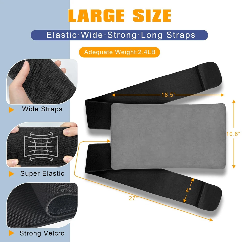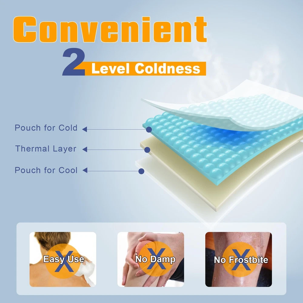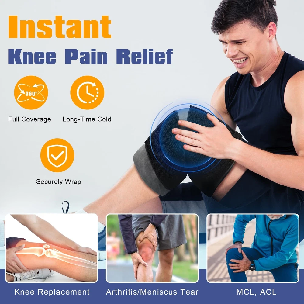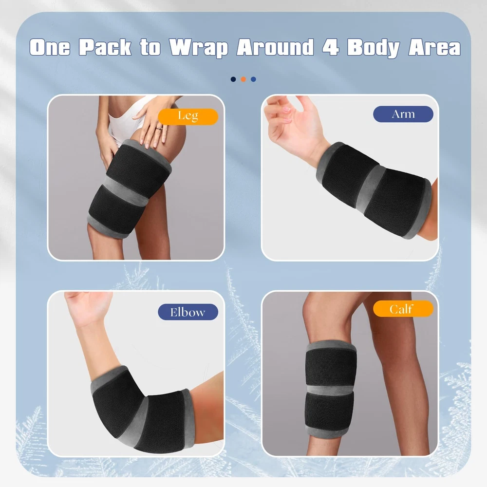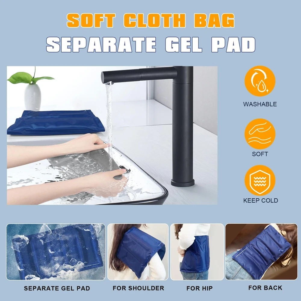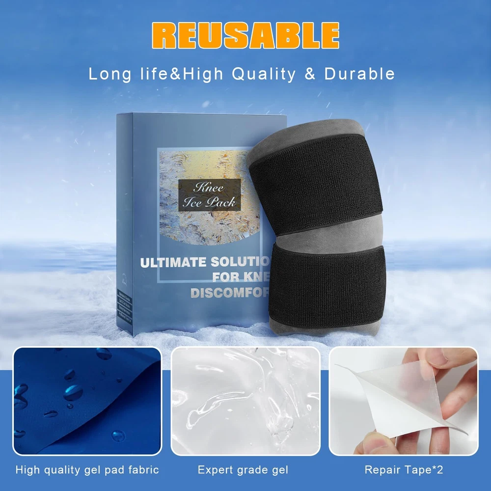 Extra Large Size for Full Coverage: 18.5"x10.6" is the perfect size to cover the entire knee area and the sides of the knee. 2.4lb weight provides enough cold and adequate cold therapy time for knee pain relief Extra Long & Wide Elastic Velcro Straps for Strong Compression: 27"x4" size is longer than most knee ice packs and twice the width of the common ones. This will make it wrap the knee securely without falling when walking or doing sports Long Time for Cold or Cool Compress: With 3 layers, the pack will hold the cold for a long time. With 2 pouches set in one bag, you can choose which pouch to put the gel pad in to get a cold or a cool compress Cloth Bag for Cleaning & A Gel Pad for Separate Use: A washable cloth bag for a soft touch to the skin and easy cleaning. A big expert-grade gel pad can be used with the cloth bag as a knee pack or separately used as an ice bag for the back or hip Flexible & Durable: The ice pack will entirely wrap around the leg, calf, elbow, and wrist perfectly. High-quality and durable PVC gel pad outer fabric and 2 packs of repairing tape will extend the life of the ice wrap