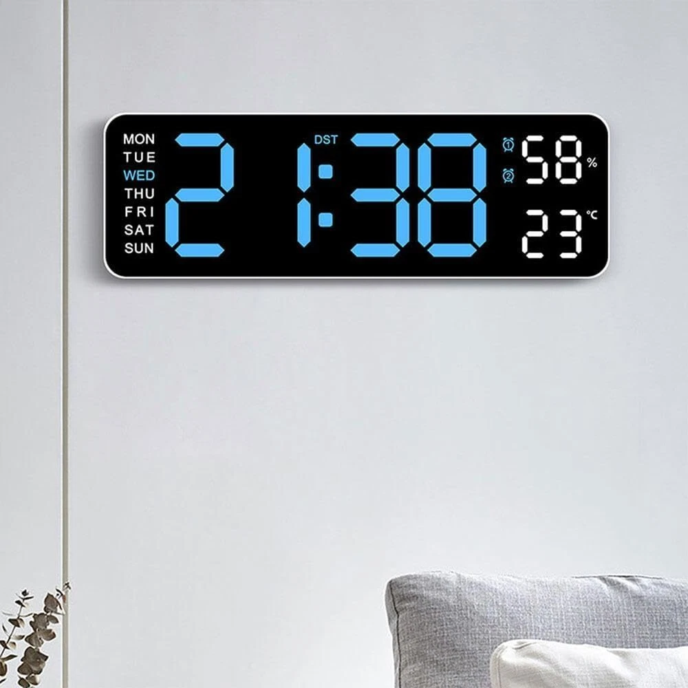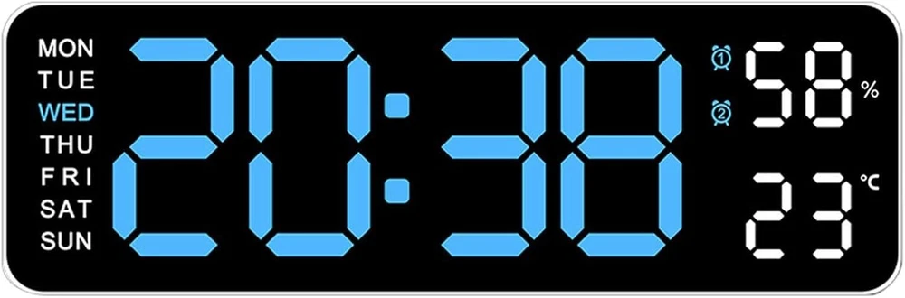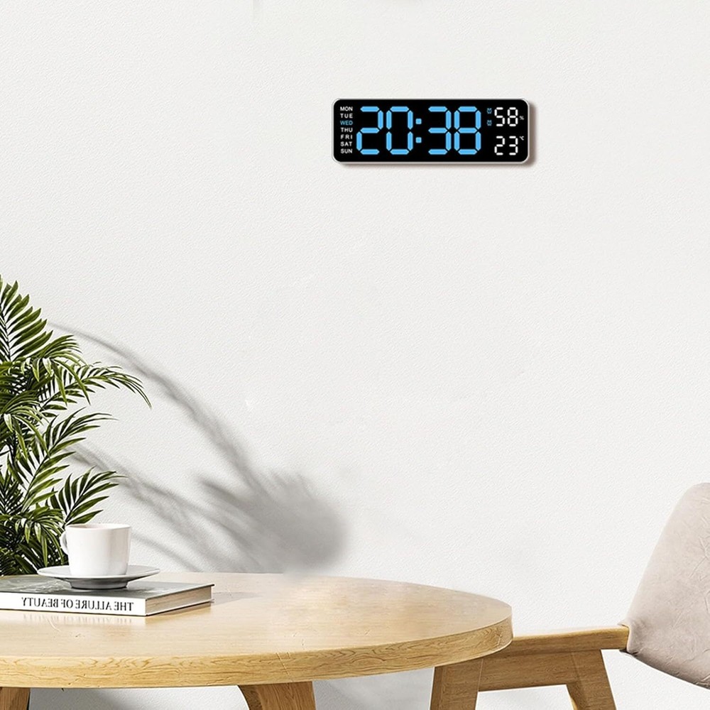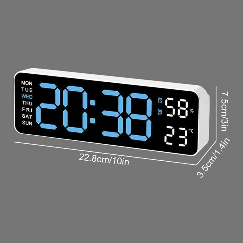 Description: Multiple time display methods: The multifunctional electronic clock can display various information such as time, date, week, temperature, etc., making it convenient for users to understand the current time and date, and can switch display according to their needs. Multiple alarm settings: The electronic clock can set multiple alarms, and different alarm reminder functions can be set according to the user's needs and schedule to ensure that the user wakes up on time or engages in other activities. Brightness adjustment function: Multi functional electronic clocks are usually equipped with brightness adjustment function, which can automatically adjust the brightness of the display screen according to changes in ambient light, ensuring clear visibility under different lighting conditions, and also avoiding the impact of high or low brightness on users. Battery backup function: Multifunctional electronic clocks usually have a battery backup function, which can maintain normal operation even in the event of a power outage or lack of power, ensuring the accuracy of time and the normal use of alarm functions. Accurate time display: Multi functional electronic clocks usually use high-precision clock chips, which can provide accurate time display and avoid the impact of time errors on users. Specification: Color: White Shell Blue Light Display Type: Digital Style: Modern Size: 22.8*3.5*7.5cm Power Source: Corded Electric Battery: 2x AAA Battery(not include) Shape: Rectangular Indoor/Outdoor Usage: Indoor Theme: Plain Frame Material: Plastic Are Batteries Included: No Mounting Type: Wall Mount Alarm Clock: Yes Watch Movement: Automatic Operation Mode: Electrical Clock Form: Multi Display