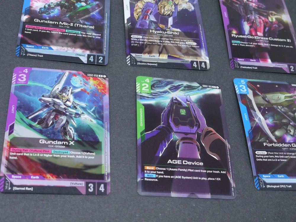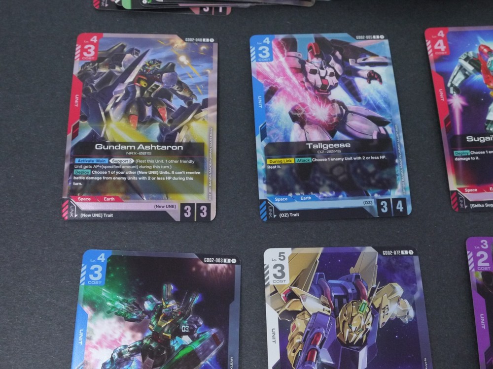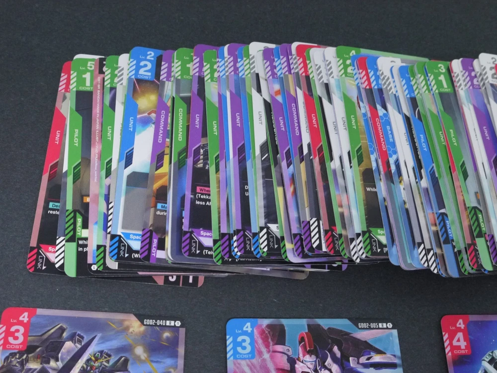 This product is a large lot of 114 Gundam TCG cards in English, featuring a variety of holos and standard-sized cards. Manufactured by Bandai, these cards are related to the Gundam War TCG game. The set includes a mix of collectible cards from the Gundam series, making it a valuable addition to any collector's inventory. Perfect for fans of Gundam and collectors of trading card games, this lot offers a diverse selection of cards from the United States.