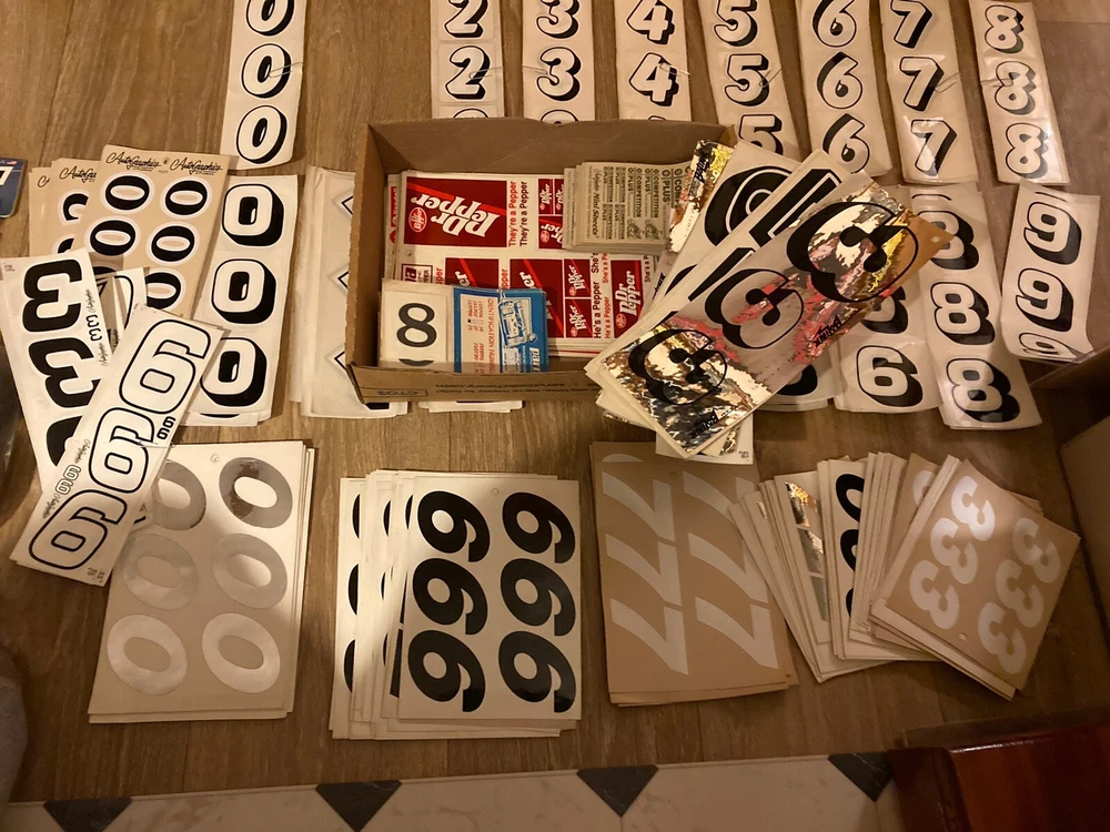 This is a large accumulation of Mostly 1/10 scale RC car numbers and there are a few other types as well. There a multiples of numbers in most of the numbers you can see that are sorted out. I think in a few cases there are 4 to 6 of some of the numbers. I counted 369 sheets or strips ranging in price from .79 to 2.25 plus there are a few (under 30) among the 369 that are priced $3.50 to $5.99. These are all adhesive type numbers and not decals. Not everything is well pictured but you can see the majority of the types that are included. The backs of a few of them have a small sticky spot where there was a price tag removed but does not hurt anything. These things have an approx. total retail value of $585.00 and my cost would have been about half of that or about $293. I’m asking a little better than half of what I paid which is $175.00. These are all old prices too so I suspect to buy them now would be a lot higher. I’ll consider offers but I won’t consider low ball offers unless these are on for a long time with no offers.