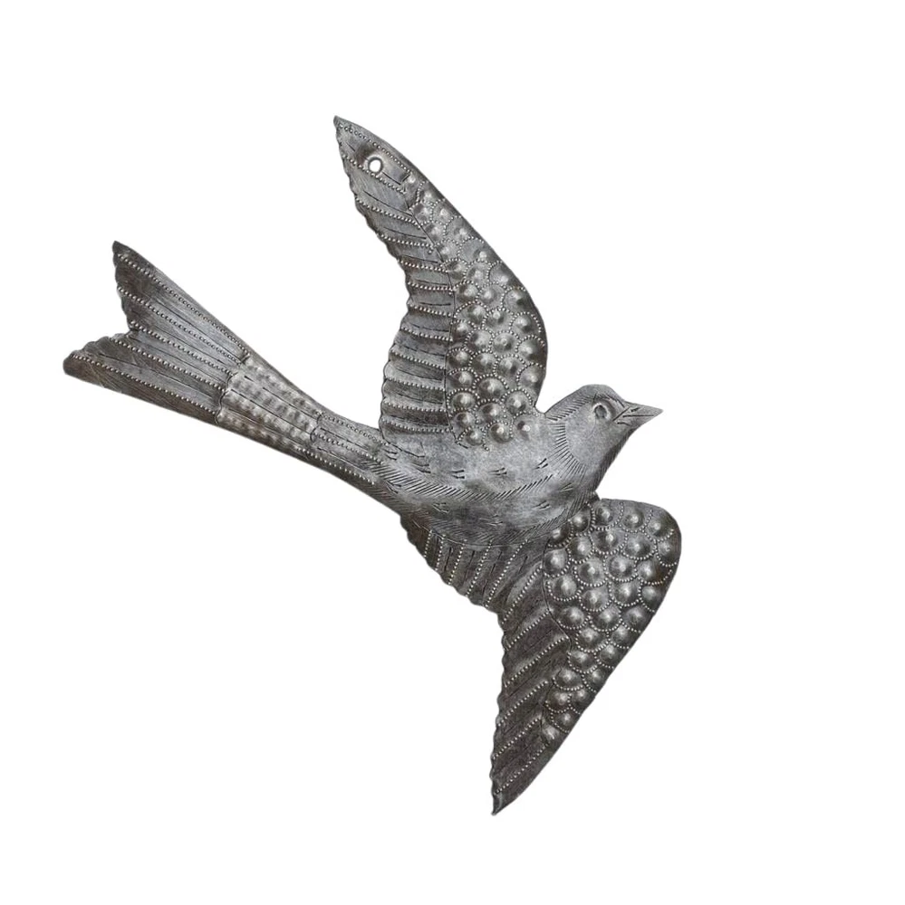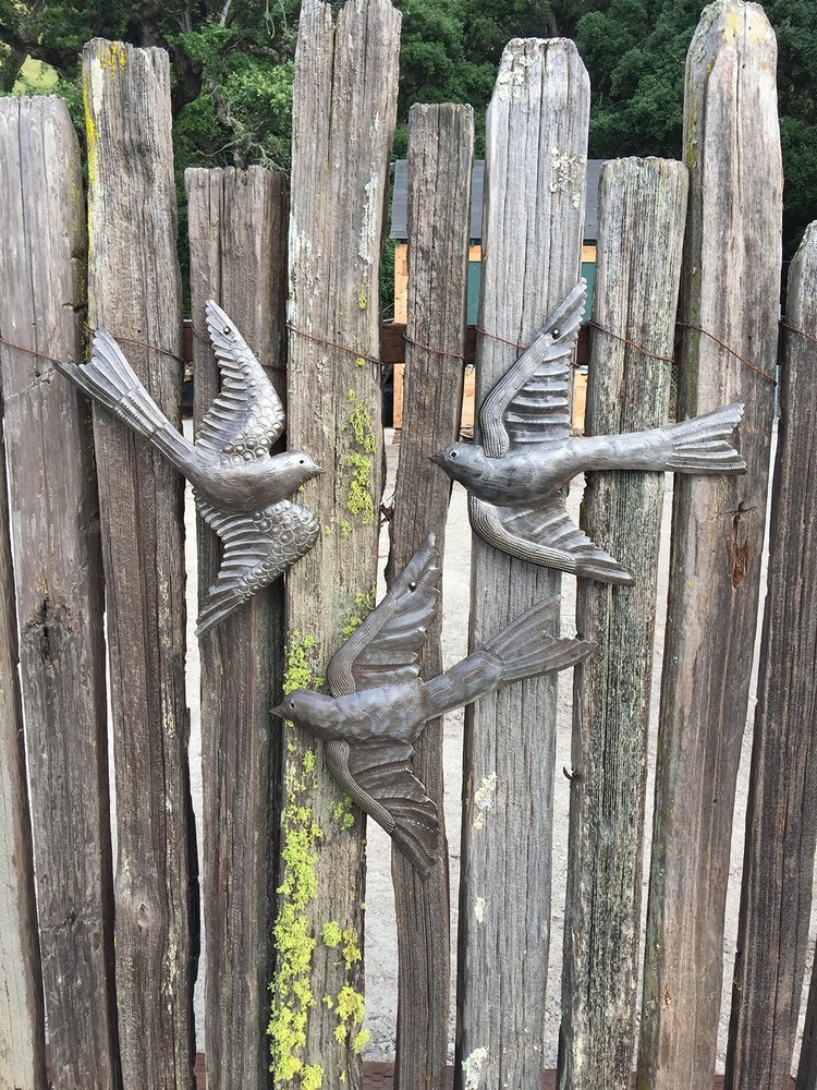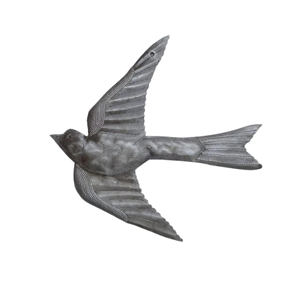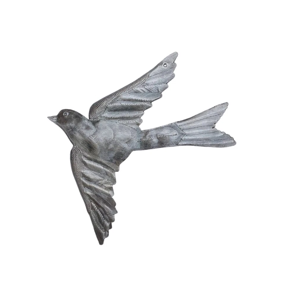 Outstanding Haitian art designs from handcut 55 gallon steel drums.Hand-crafted from cast-off 55 gallon steel drums, artists in Haiti four generations of tradition in metal sculpture.All of the Haitian Metal Art can be used both indoors or out. The sculptures have a clear enamel coat when shipped to you~ To maintain this original look you will need to spray the sculpture with a clear enamel every year and a half~ We use our local hardware brand Ace Clear Enamel spray. When used outdoors weather will wear away the enamel coating over time~ Many people prefer the natural aging process which is a rust~ Or to maintain the original look give the sculpture a light spray front and back with the clear enamel~ These sculptures are made of a heavy gauge steel so will not rust away~ If your sculpture does rust or you have forgotten to spray it, do not worry, just lightly sand the rusted areas, then spray it with clear enamel front and back. Now you are good to go for another year! Perfect for indoor or out!. Made with only his hammer, chisel, and imagination! Garden art for your patio.The artist first visualizes his design, often taking inspiration from his culture and natural surroundings.Next, he chalks his design onto the flattened metal and then, using only a hammer and chisel, gives i form and dimension.The result is a unique piece of folk art, perfect for home or garden use. Fair Trade Certified: Set of 3 Lightweight Birds Upcycled Wall Hanging Art Garden Metal Birds Decorative Birds for Indoor or Outdoor