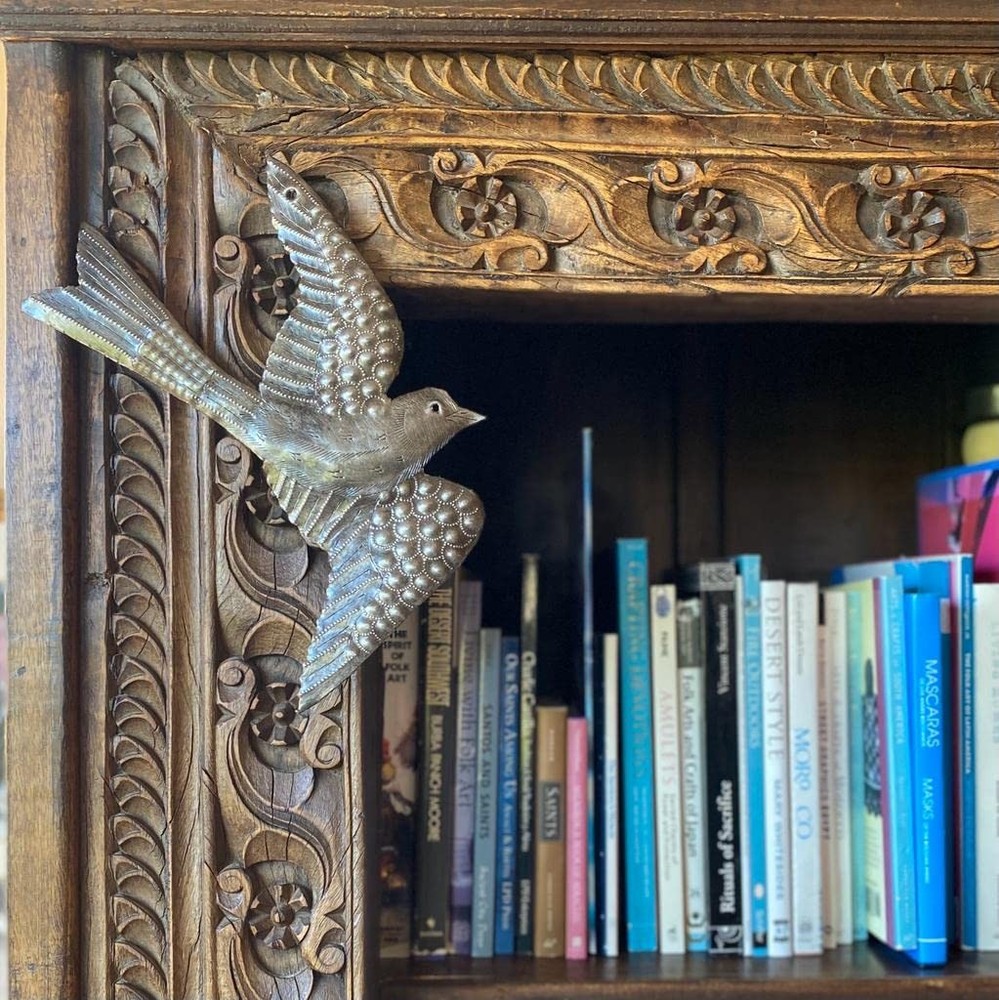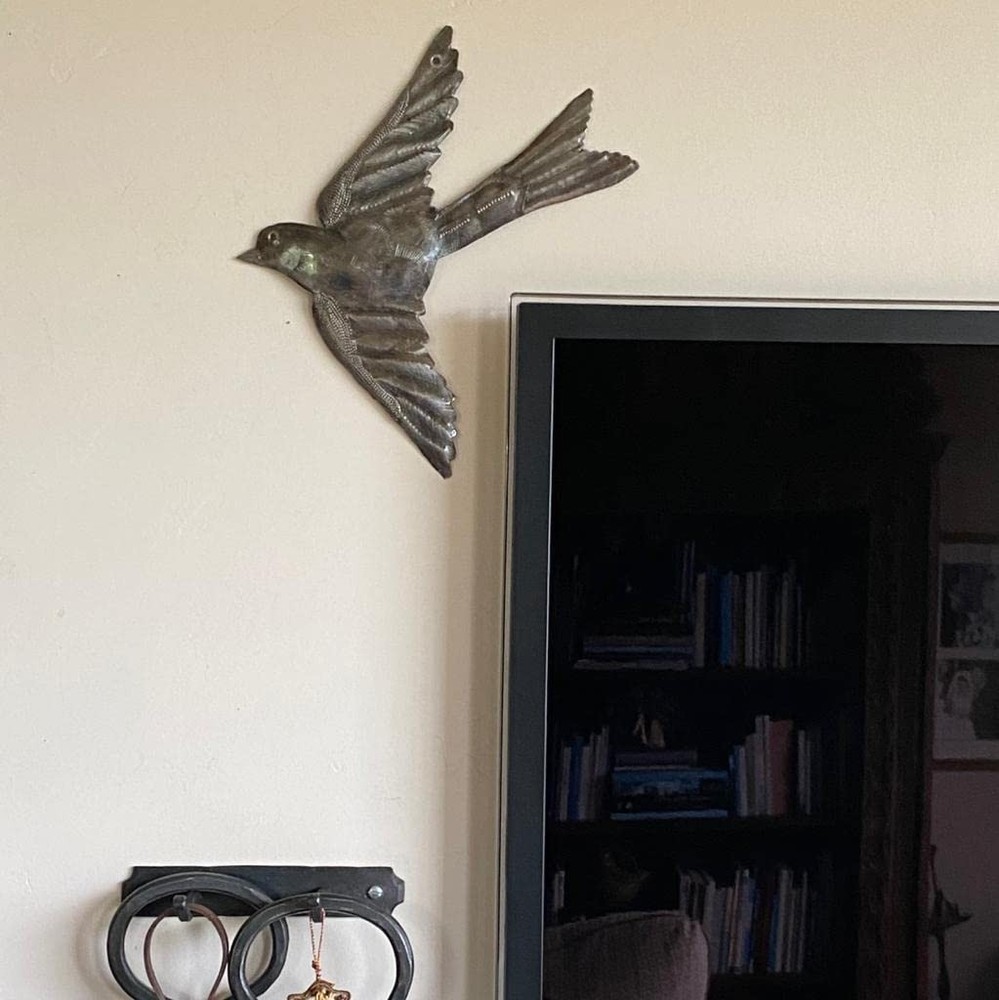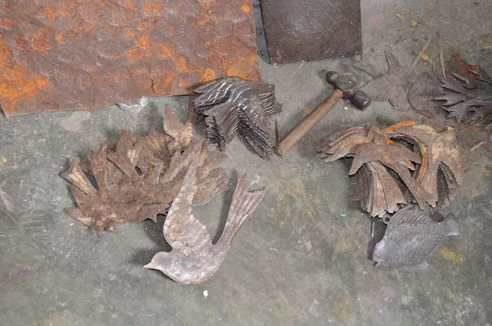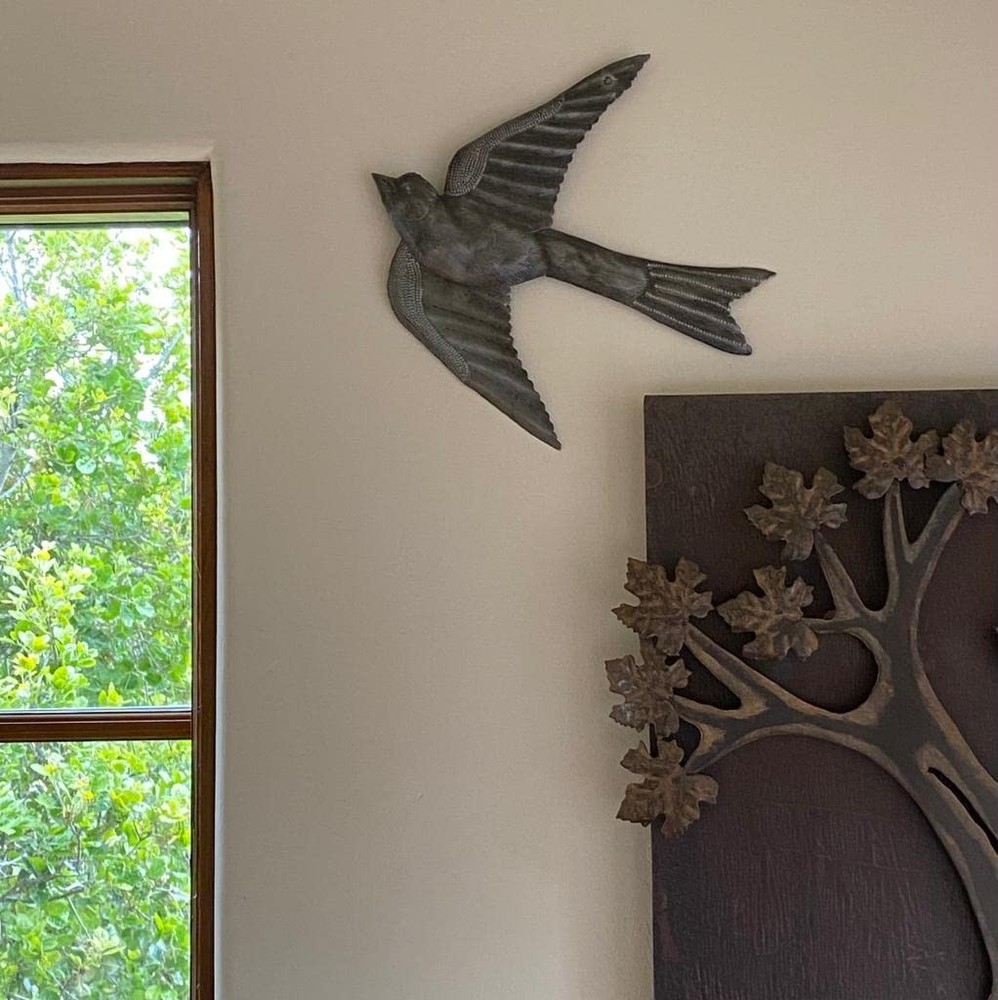 Outstanding Haitian art designs from handcut 55 gallon steel drums.Hand-crafted from cast-off 55 gallon steel drums, artists in Haiti four generations of tradition in metal sculpture.All of the Haitian Metal Art can be used both indoors or out. The sculptures have a clear enamel coat when shipped to you~ To maintain this original look you will need to spray the sculpture with a clear enamel every year and a half~ We use our local hardware brand Ace Clear Enamel spray. When used outdoors weather will wear away the enamel coating over time~ Many people prefer the natural aging process which is a rust~ Or to maintain the original look give the sculpture a light spray front and back with the clear enamel~ These sculptures are made of a heavy gauge steel so will not rust away~ If your sculpture does rust or you have forgotten to spray it, do not worry, just lightly sand the rusted areas, then spray it with clear enamel front and back. Now you are good to go for another year! Perfect for indoor or out!. Made with only his hammer, chisel, and imagination! Garden art for your patio.The artist first visualizes his design, often taking inspiration from his culture and natural surroundings.Next, he chalks his design onto the flattened metal and then, using only a hammer and chisel, gives i form and dimension.The result is a unique piece of folk art, perfect for home or garden use. Fair Trade Certified: Set of 3 Lightweight Birds Upcycled Wall Hanging Art Garden Metal Birds Decorative Birds for Indoor or Outdoor