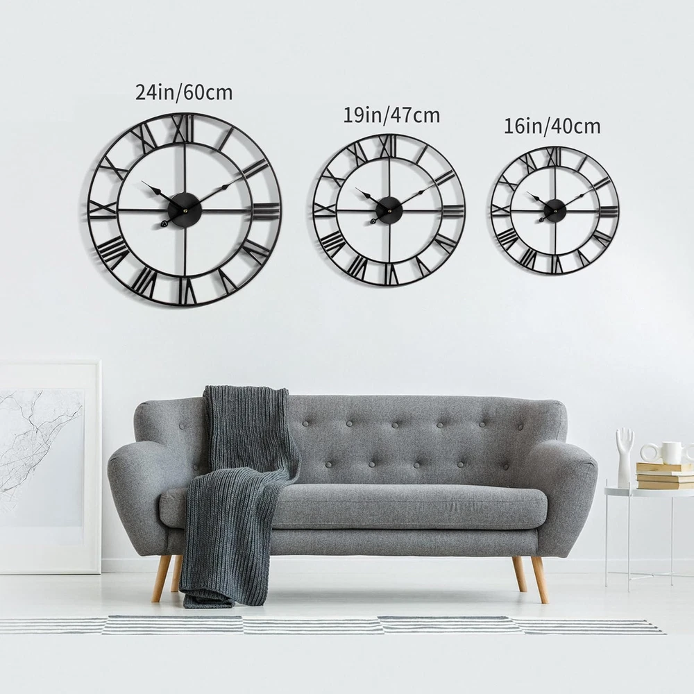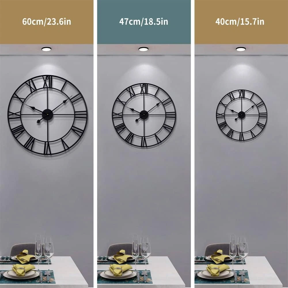 【INDUSTRIAL CLOCK】Large retro metal clock in hollowed-out design, frame of the wall clock is hand-made by solid iron, and high- quality materials ensure the robustness and retro appearance of the Roman wall clock. 【NEARLY SILENT】Using high-quality quartz movement, simple design without pointer sweeping movement, energy-saving, nealy silent and just little ticking, it will not disturb you when installed anywhere. 【MODERN DECORATIVE】Decorative wall clock is suitable for living room, office, bedroom, kitchen, school, classroom and other home or public places. 【EASY TO INSTALL】] The hook design has less damage to the wall but is stronger, the rear slot design is easy to hang, powered by 1 AA battery ( NOT INCLUDE ON PACKAGE). 【GUARANTEED】The movement of this modern wall clocks accept 6-months replacement,if your movement has any problems within half a year, please contact us in time, our team will give you satisfactory after-sales service within 24 hours. Product Description ALMOST SILENT - Using high-quality quartz movement, simple design without pointer sweeping movement, energy-saving, almost silent and little ticking, it will not disturb you when installed anywhere. MODERN DECORATIVE : Decorative wall clock is suitable for living room, office, bedroom, kitchen, school, classroom and other home or public places. ROMAN NUMERALS : Large Modern Metal Wall Clocks Vintage Round Silent Non Ticking Battery Operated Silver Roman Numerals Clock for Living Room/Bedroom/Kitchen Wall Decor MULTIPLE SIZES : Clocks have 40CM / 47CM /60CM size for your option. LEIKE MODERN WALL CLOCKS MODERN DECORATIVE : Decorative wall clock is suitable for living room, office, bedroom, kitchen, school, classroom and other home or public places. ROMAN NUMERALS : Large Modern Metal Wall Clocks Vintage Round Silent Non Ticking Battery Operated Silver Roman Numerals Clock for Living Room/Bedroom/Kitchen Wall Decor MULTIPLE SIZES : Clocks have 40CM / 47CM /60CM size for your option. INDUSTRIAL CLOCK Large retro metal clock in hollowed-out design, frame of the wall clock is hand-made by solid iron, and high- quality materials ensure the robustness and retro appearance of the Roman wall clock. EASY TO INSTALL The hook design has less damage to the wall but is stronger, the rear slot design is easy to hang, powered by 1 AA battery. CLASSIC NUMERAL DESIGN Large size with elongated old European-style numerals make a grand appearance yet lightweight for easy hanging and transport.