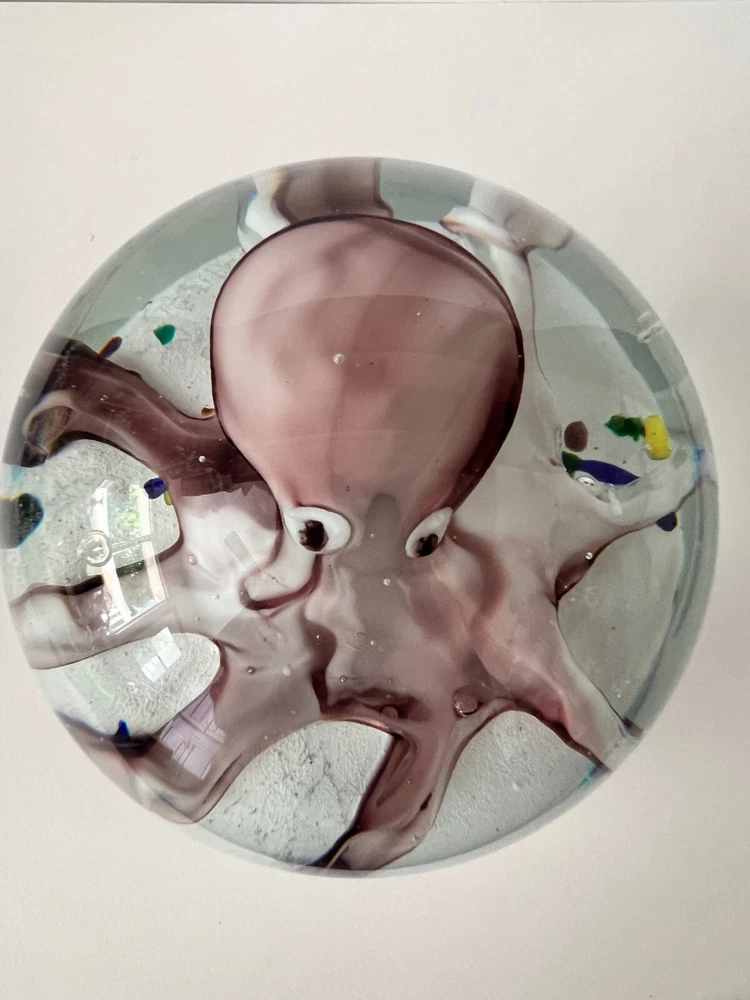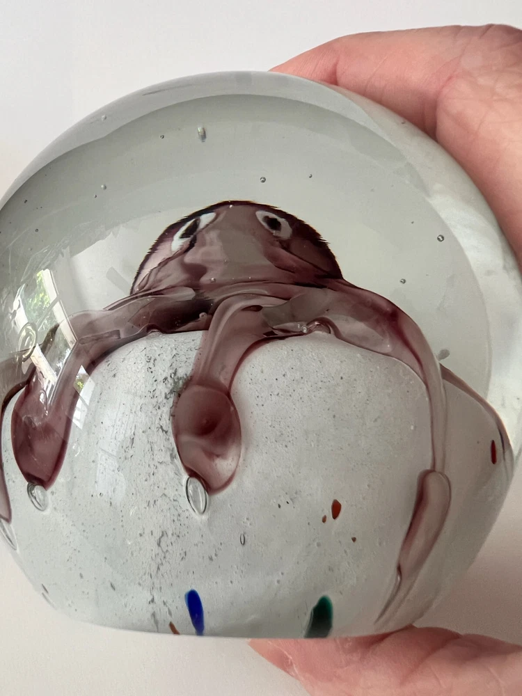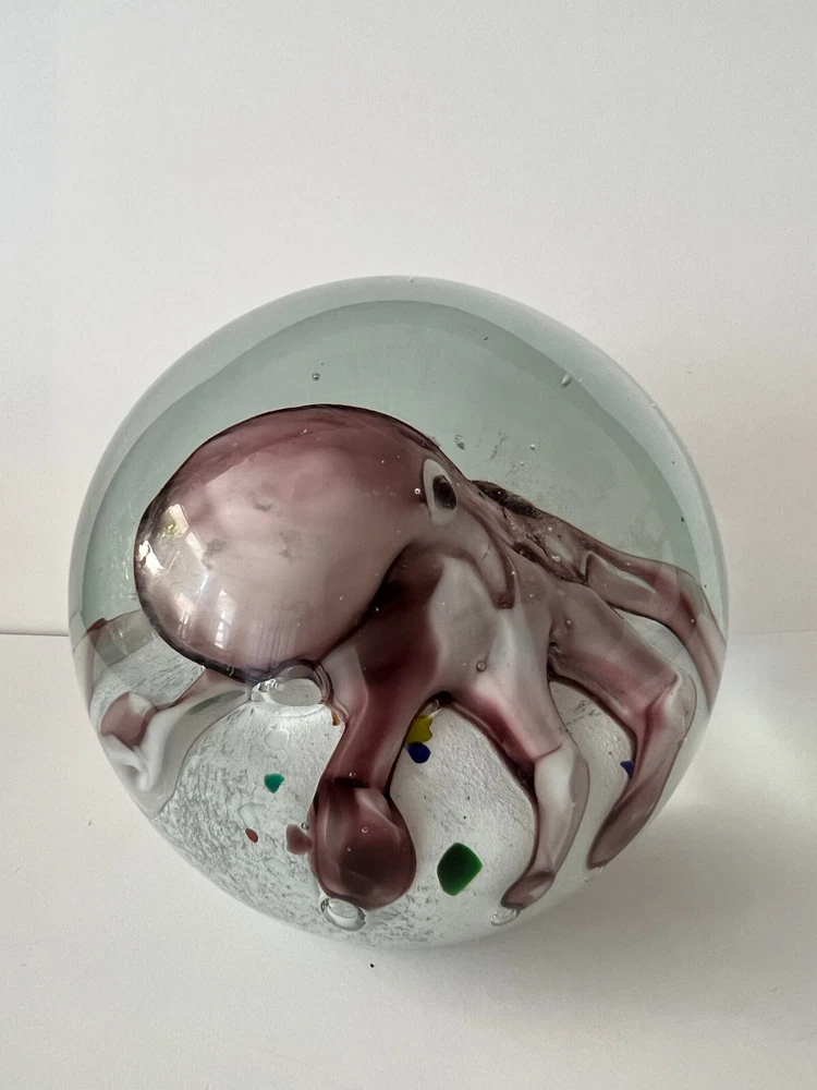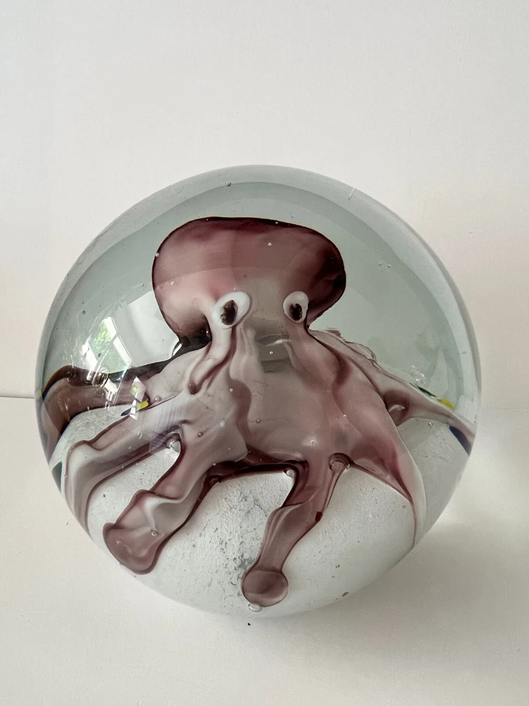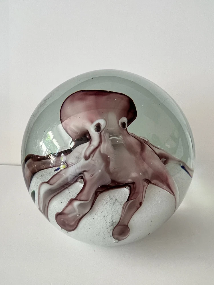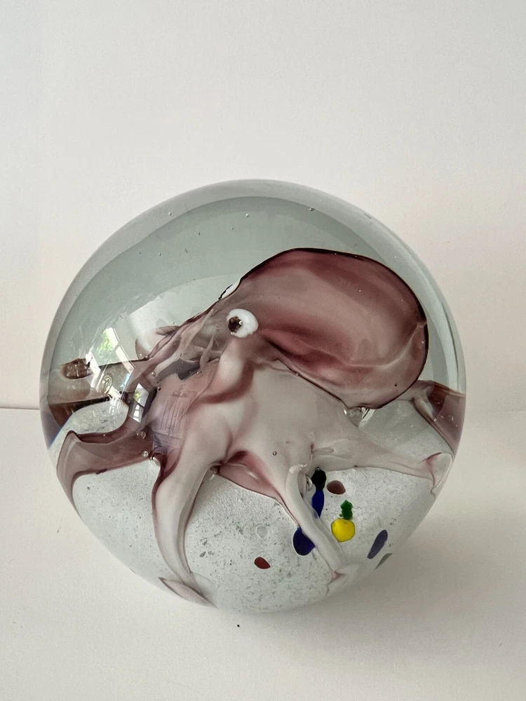 Large Octopus Sea Themed Paperweight Controlled Bubbles Polished Base Unsigned. A few minor surface scratches , that you can hardly notice unless you really look . This is an amazing piece from a private collection . The size is about 3.5 inches across and about 4 inches tall and weighs 2 pounds 9 oz . A very impressive piece ! Thanks for looking !