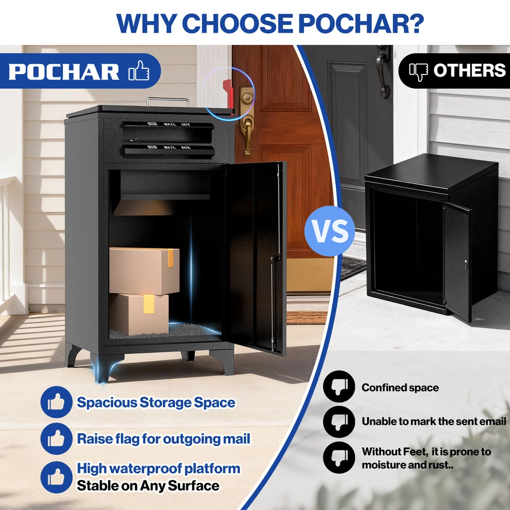 POCHAR Large Package Delivery Boxes for Outside, Heavy-Duty Steel Parcel Drop Boxes with Anti-Theft Design for Home, Large Waterproof Package Lock Box with Coded Lock for Outdoor, Porch, Curbside 【Extra Large Capacity】POCHAR extra large mailbox offers oversized space for multiple large packages, plus all your other curbside mailbox deliveries. Dimensions: L21.26 x W18.43 x H39.37 inches. Suitable for various package sizes. Features separate compartments for letters and packages, enabling organized storage. This parcel box comes with pre-drilled holes, a sturdy combination lock, and a complete set of mounting hardware for easy assembly. 【Durable, Weatherproof Design】parcel box boasts a galvanized steel structure with effective waterproof and rust-resistant properties for lasting durability, keeping packages safe and dry. Four raised feet on the bottom keep the box elevated above standing water, while the cabinet anchors securely to the ground. The sloped roof design facilitates natural runoff of rainwater and snow, eliminating water accumulation risks. Comprehensive Package Protection. 【Multi-Layer Anti-Theft Security】The POCHAR outdoor delivery box features a secure combination lock and internal hinges for package safety. The delivery slot includes a large anti-theft baffle, reinforced screws, and hydraulic support rods to prevent theft and absorb impact. Full-process protection for your packages. 【24/7 Secure Package Delivery】Couriers can safely deliver parcels around the clock without requiring you to wait at home. The keypad lock eliminates worries about lost keys, hiding spots, or complicated operations—ideal for remote workers, frequent travelers, and anyone seeking a convenient delivery experience. 【Multi-scenario & Customizable】Offers customizable address stickers to guide delivery personnel to outdoor locked mailboxes. Perfect for homes, apartments, porch, yardor, curbside, and businesses, providing a reliable solution for all your delivery needs. Pochar's customer service team provides 24-hour service. This is a Brand New product If you would like an Open Box discount, please visit our store front to see more listings. Contact us through Ebay for any questions Our dedicated Customer Service is here to help Monday to Friday (9am to 5pm PST) All POCHAR products are sold with a one (1) year manufacturer warranty including replacement parts. Check our Store Front for more product listings! POCHAR Sales | Store Front Thanks for shopping POCHAR! The actual color of the product may be different from the image you see. This is due to the fact that every computer monitor, laptop, tablet and phone screen has a different capability to display colors and that everyone sees these colors differently. We try to edit our photos to show all of our products as life-like as possible, but please understand the actual color may vary slightly from your monitor.