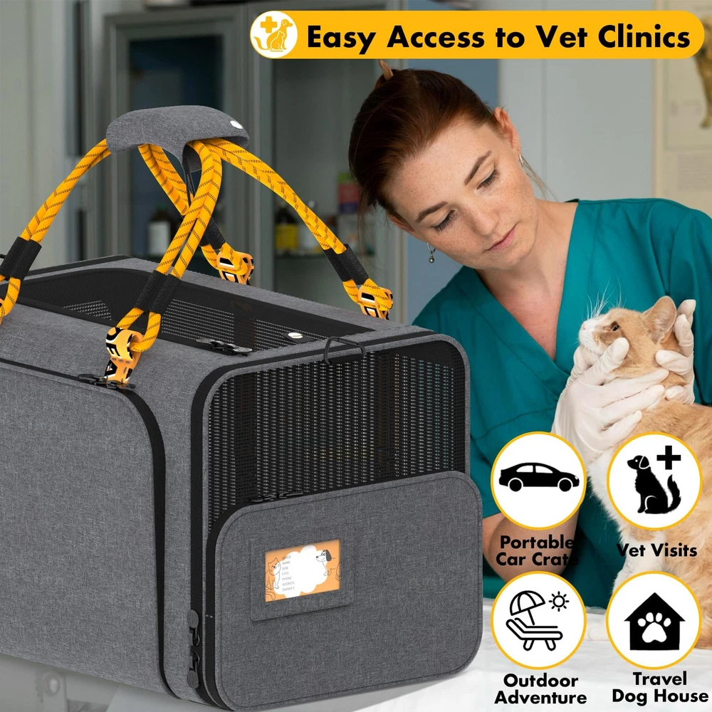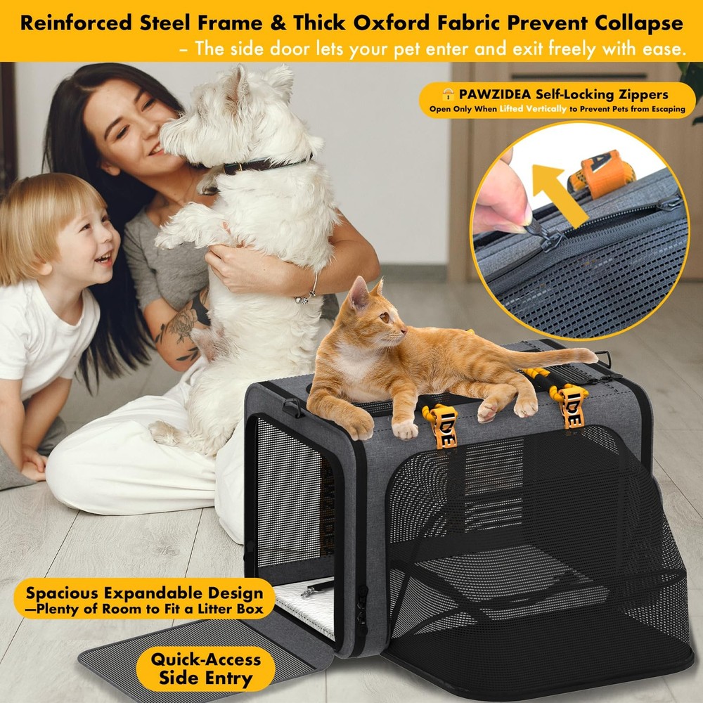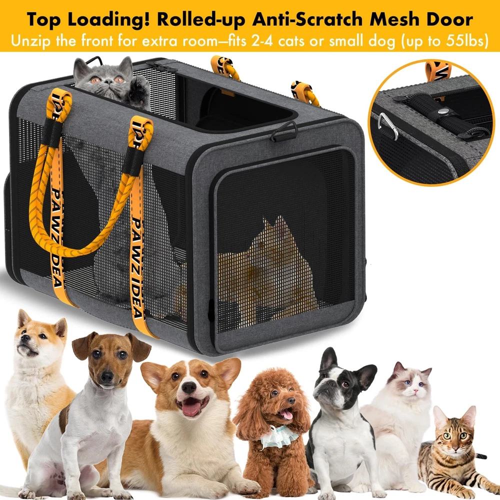 Expandable Soft-Sided Pet Carrier for Stress-Free Travel —Unzip the front to double the space, ideal for 2 large cats or a small/medium dog (up to 55 lbs). The 24"x16"x16" Soft-sided crate gives pets room to stretch and relax. Perfect for long car travel, outdoor trips, or vet visits. Safe & Secure with Smart Details —Safety comes first with dual safety leashes, self-locking zippers, and chew-proof mesh to prevent escapes. Plus, a custom ID card adds peace of mind during travel. A solid leak-proof PP board base for stability, and the double-sided washable cushion (plush/cool side) adds comfort and convenience. Durable Frame, Easy to Fold & Store —Built with a reinforced steel frame and thick Oxford fabric to prevent collapse. Soft-sided yet sturdy, this pet crates folds flat in seconds for easy storage. Perfect for both outdoor travel and home use. Easy Access & Excellent Ventilation —Designed with top load large cat carrier and independent openings on both sides, plus an upgraded independent small door, making it effortless for your pet to enter and exit freely without the carrier collapsing. Durable anti-scratch and chew-proof mesh provides excellent visibility and airflow, keeping your pet stays comfortable and secure. Versatile 3-in-1 Carrier: Travel Crate, Car Seat & Shoulder Bag —Converts to a dog travel crate, secure car seat—attach it with seatbelt and rear straps. The shoulder strap doubles as a dog leash, and the shoulder pad stores poop bags. Your all-in-one solution for secure and stylish pet travel. Not Airline Approved — Pet Carrier: 24” L x 16” W x 16” H. While this carrier offers spacious comfort, please verify airline size requirements. Double the Space & Comfort — Expandable zip-open front design nearly doubles the interior space compared to standard carriers, giving pets extra room to stretch and relax. Spacious 24″L × (16″–30″)W × 16″H. Ideal for 2–4 small cats, 2 large cats or small dogs, puppies, rabbits, or 1 medium dog up to 55 lbs. Breathable & 360° Ventilation — Roll-up mesh top-load door and quick-access side entry make feeding and entry effortless. Dual side mesh doors and rear mesh panels provide 360° airflow and superior visibility. Crafted from durable, chew-proof, and scratch-resistant mesh to keep pets calm, cool, and secure. Durable & Foldable for Travel — Built with reinforced steel frames and premium thick Oxford fabric to prevent collapsing. This lightweight, soft-sided pet carrier is easy to carry by hand or shoulder and folds flat to just 4″H for compact storage. Ideal for daliy use, outdoor adventures, vet visits, road trips, and car travel. Practical & Safe Design — Features a leak-proof PP board base with a removable, washable double-sided soft pad for easy cleaning. Safety comes first with dual leash clips and self-locking zippers (open only when lifted straight up) help prevent pet escapes. A large 16"L × 10"H side storage pocket for travel essentials, plus a personalized pet ID card adds extra security and peace of mind. Versatile 3-in-1 Carrier — Functions as an expandable pet carrier, a seatbelt dog car crate, and a multi-cat shoulder travel bag. Securely fasten the carrier to your car seat by threading the seatbelt through its rear straps for safe, stable travel. The shoulder strap doubles as a dog leash and the shoulder pad stores poop bags. Your all-in-one solution for safe, stress-free, and stylish pet travel. TIPS: If the 2-inch D-ring carabiner becomes damaged, please contact customer service for a FREE replacement. The self-locking zippers are designed to open smoothly only when lifted vertically, preventing pets from escaping from the inside.