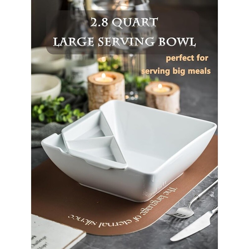 You may also like Crinkle Cut Shipping Tissue Paper Shred 10 lb Packing Filler Durable Recyclable 43.72 USD 46.02 USD Free shipping 5% off Stackable Storage Containers 9L Clear Bin Set W/ Clip Lock Handles 8 Pack New 194.91 USD 205.17 USD Free shipping 5% off Multipurpose 3 Door Enclosed Storage Cabinet Easy Assembly Home Office New 57.48 USD 60.5 USD Free shipping 5% off Baby Bottle Warmer Breast Milk Food Heater Universal Safe Easy Nurturing Plastic 87.98 USD 92.61 USD Free shipping 5% off Vanity Mirror W/ Wireless Charging 3 Color Lights 10X Magnification Makeup New 46.92 USD 49.39 USD Free shipping 5% off 2 Tier Coffee Bar Organizer Countertop Storage Rack W/ 6 Hooks & Rotating Top US 42.73 USD 44.98 USD Free shipping 5% off Ah So Wine Opener Vintage Corkscrew Leather Case Two Prong Tool Gift Wine Lovers 83.11 USD 87.48 USD Free shipping 5% off Carbon Steel Non-Stick Stir Fry Pan/Wok Easy Clean Soft Handle Healthy Cooking 27.81 USD 29.27 USD Free shipping 5% off Handwoven Rattan Storage Basket W/ Lid Square Washable Durable Stackable Brown 187.71 USD 197.59 USD Free shipping 5% off Unique Hippo Figurine Candy Dish Storage Bowl Decorative Resin Art Home Office 43.92 USD 46.23 USD Free shipping 5% off Stainless Steel Frying Pan Set Nonstick Induction Safe Titanium Ceramic Skillet 100.92 USD 106.23 USD Free shipping 5% off Two-Tier Metal File Cart Adjustable Shelf Locking Wheels Easy Setup Storage New 49.1 USD 51.68 USD Free shipping 5% off About this item INNOVATIVE BUILT-IN DIPPING TRAY DESIGN: Host a party night with our magic layered bowl. The chips stay crunchy while queso stays gooey. Hot spinach dip & chilled salsa coexist peacefully! LARGE CAPACITY & SIZE: With a wide mouth of 9. 33" diameter and a capacity of 2. 8 Quart, this salad bowl is large enough to provide ample portions for your party guests. It is ideal for serving large salads, fruits, soups, appetizers, noodles, snacks, popcorn, etc. This ceramic mixing bowl is also deep enough that you can stir salads or pasta at will without spilling. CLEVER DIPPINGT BOWL DESIGN: The dipping bowl is securely nested over the serving bowl, allowing you to easily separate different foods without messing up or interfering with the staple food area, adding a convenient touch to your dining experience. It can also be taken apart and used alone. There are 2 compartments for different types of food. You can serve salsa, tomato sauce, mashed potatoes, icing dips, guacamole, spicy sauce, nuts, fruits, and various appetizers. PRO-GRADE PORCELAIN: This multi-purpose serving dish is made of high-quality porcelain material, lead-free, scratch-resistant and more sturdy than plastic. The smooth glaze makes it easy to clean in hand-wash or dishwasher. It is also microwave, oven and freezer safe. WIDELY USE: With its classic white color and clean minimalist lines, this chip and dip bowl is the perfect gift for any food enthusiast or home chef. Whether it's for a Housewarming party, Wedding, Birthday party, Thanksgiving, Christmas dinner, buffet or other special occasion, this large salad bowl will be greatly appreciated. › Bowl Material: Porcelain Number of Pieces: 1 Brand: Color: White Style: Square You may also like Cordless Caulking Gun Battery Powered 21V Electric No Drip 4 Speed 300ml New 45.11 USD 47.48 USD Free shipping 5% off Carbon Fiber Nylon Filament 1.75mm PA6 CF 3D Printer Industrial Engineering 1kg 54.99 USD 57.88 USD Free shipping 5% off Portable Steam Sauna Home Spa Full Body Tent W/ 1500W Steamer Remote Chair New 78.95 USD 83.11 USD Free shipping 5% off Rechargeable Wall Mounted Lighted Makeup Mirror 10X Magnifying 3 Color Lights US 45.04 USD 47.41 USD Free shipping 5% off 15 In Cast Iron Skillet Nonstick Versatile Cookware Assist Handle Oven Safe New 56.32 USD 59.28 USD Free shipping 5% off Rechargeable Wall Mounted Makeup Mirror 8 Inch Dual Sided 1X 10X Dimmable Light 53.57 USD 56.39 USD Free shipping 5% off Simple Design Computer Writing Desk W/ Shelves Durable Compact Easy Assembly New 60.41 USD 63.59 USD Free shipping 5% off 2-Slice Toaster Extra Wide Slots Bagel Function Breakfast Kitchen Appliance New 27.92 USD 29.39 USD Free shipping 5% off 25Ft 10Gauge Heavy Duty Outdoor Extension Cord Waterproof Lighted End 15Amp SJTW 39.64 USD 41.73 USD Free shipping 5% off 1/4 Drive Impact Socket Set 56 Pieces SAE Metric 6 Point Cr-V Ratchet Extension 46.92 USD 49.39 USD Free shipping 5% off Indoor Panini Press Grill Nonstick Sandwich Maker Easy Clean Healthy Cooking New 27.49 USD 28.94 USD Free shipping 5% off Multipurpose Office Computer Desk W/ Keyboard Drawer CPU Storage Writing Table 66.86 USD 70.38 USD Free shipping 5% off
