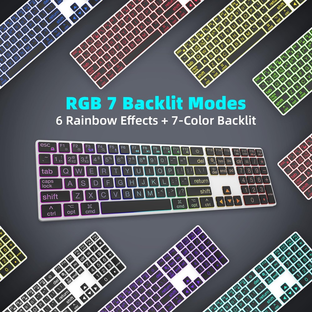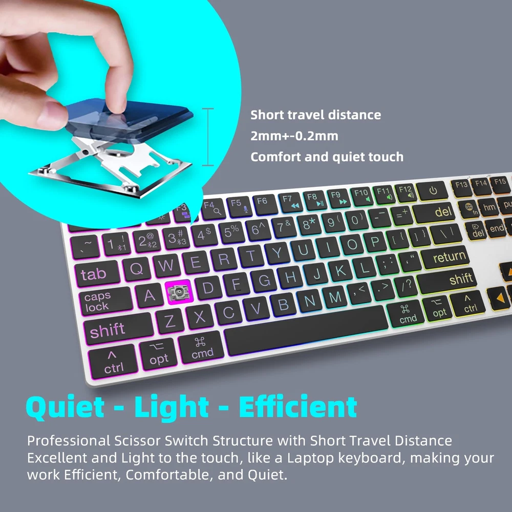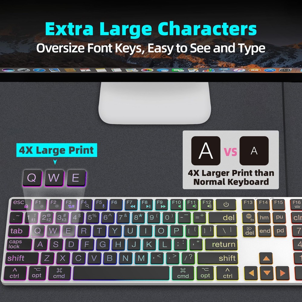 This keyboard is a game-changer! The large print keys are super easy to read, and the rainbow backlighting adds a fun touch. Love the dual Bluetooth/wired modes—switching between my Mac and iPad is seamless. The scissor switches make typing quiet yet satisfying, and the slim aluminum design feels premium. Perfect for late-night work sessions without disturbing others. The USB-C charging is convenient, and the full-size layout with a numeric pad is a bonus. Highly recommend for Mac users who want style and functionality!