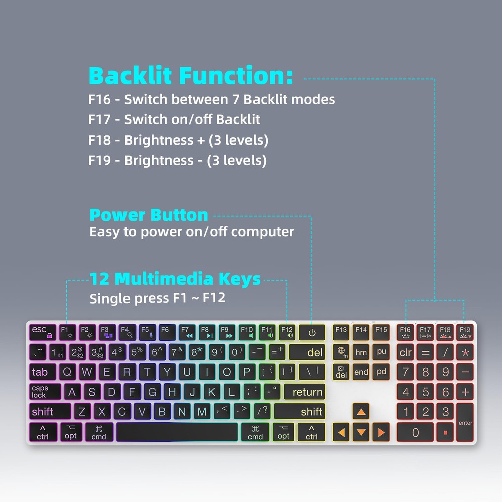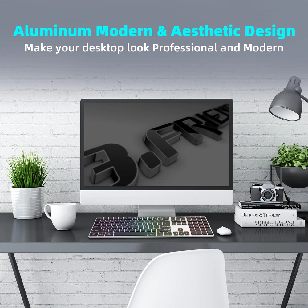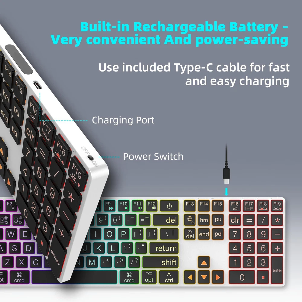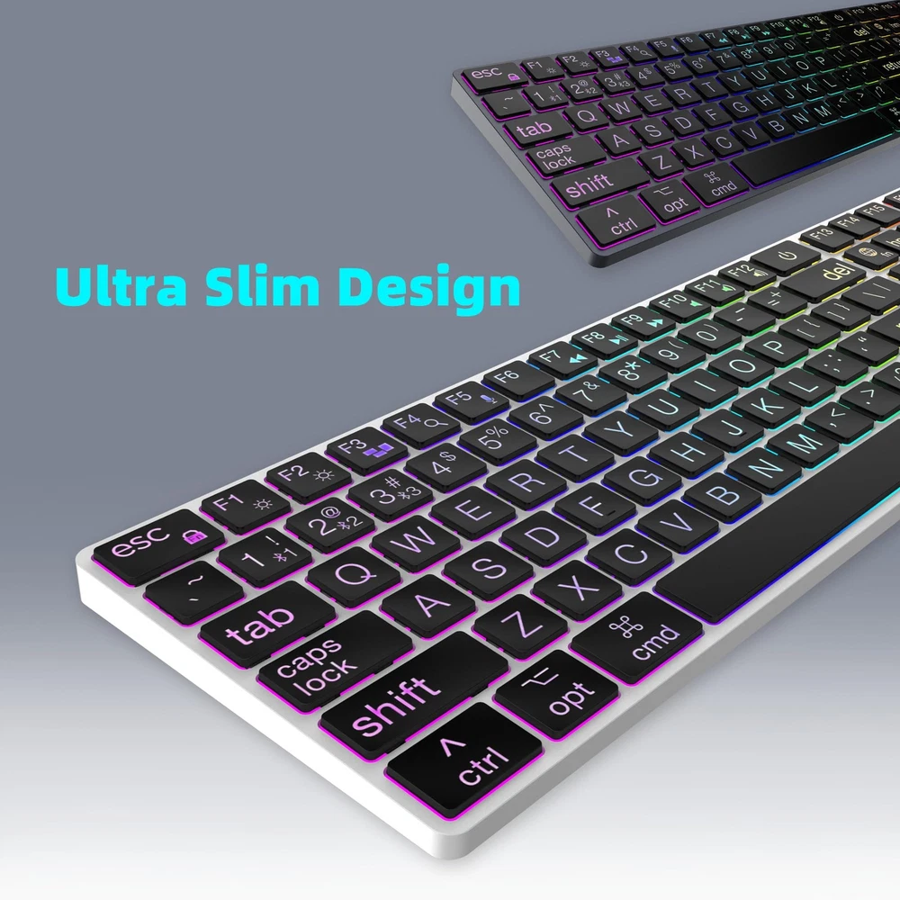 This keyboard is a game-changer! The large print keys are super easy to read, and the rainbow backlighting adds a fun touch. Love the dual Bluetooth/wired modes—switching between my Mac and iPad is seamless. The scissor switches make typing quiet yet satisfying, and the slim aluminum design feels premium. Perfect for late-night work sessions without disturbing others. The USB-C charging is convenient, and the full-size layout with a numeric pad is a bonus. Highly recommend for Mac users who want style and functionality!