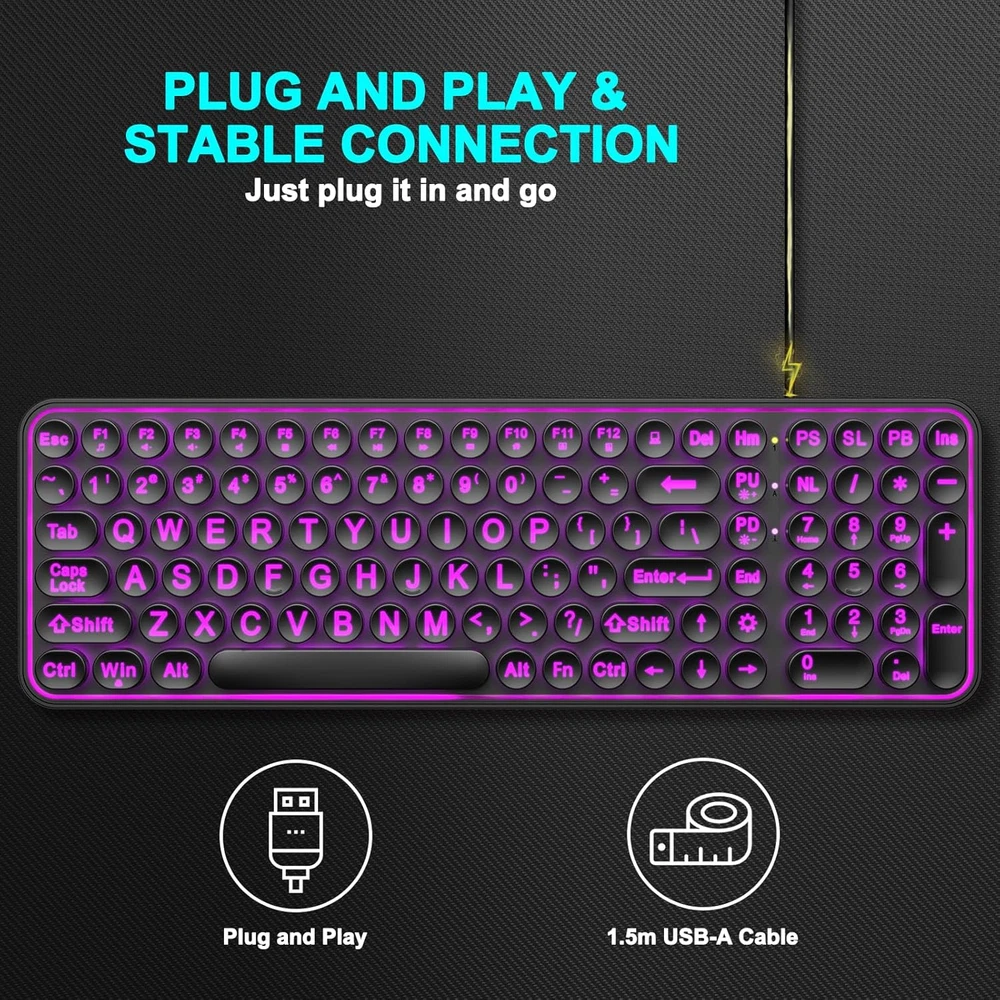 ▶【Large Print Keyboard】: Effortlessly locate any key on our large key keyboard. It is designed with print 4x larger than on traditional keyboards to help you type confidently. Ideal for seniors, students, office workers, elderly, the visually impaired, schools, special needs departments and libraries, as well as companies. ▶【7 Color Backlight】The Backlit keyboard has 3 levels of brightness, 7 different colors, and 2 backlight modes.Backlit can choose to turn on/off and adjust brightness, making it more convenient to type in low-light environments. Bright and evenly distributed backlit keys, easy typing in lower light environment. ▶【Full Size & Ergonomics Design】:Full Size light up keyboard layout with numeric keypad, Large Print keys provides superior comfort without forcing you to relearn how to type. Ergonomic keyboard layout reduces wrist fatigue and discomfort during prolonged use. ▶【Blending Retro With Fashion】: A sleek, modern design with round raised keycaps and spill-resistant technology, this typewriter keyboard helps you stand out in the office. It can showcase its unique charm at home, school,studio, and office. ▶【Plug and Play & Wide Compatibility】: This USB keyboard takes away the hassle of power charging or swapping out batteries and is easy to setup.No drivers required.Our keyboard compatible with windows XP/Vista/7/8/10/X,Mac and other operating system. Works well with desktops, Chrome-book, PC, Laptop, Computer and more. ▶【Comfortable Typing & Silent Click 】: The effortless crater mechanism under each key makes typing more comfortable. The keyboard are almost silent, don't worry about disturbing others. ▶【After-Sales Service】: Enjoy 24 months of support.Buy with confidence.If you have any issues,let us know,and we will resolve them within 24 hours. Product Description 1 Large Print Backlit Keys 2 Ergonomic Design 3 Especially Nice to People 4 Large Print Keyboard 12 Multimedia Shortcuts This Full-size large print backlit keyboard with 12 multimedia shortcuts, can provide you with the best entertainment experience. Plug and Play This USB keyboard takes away the hassle of power charging or swapping out batteries and is easy to setup. No drivers required. Backlight Retro Round Keys Bright and evenly distributed backlit keys, easy typing in lower light environment. Backlit can choose to turn on/off and adjust brightness. Wide Compatibility Compatible with Windows 2000/XP/7/8/10, Vista,Raspberry Pi 3/4, Mac OS. Works with your PC, laptop. How can I adjustable the Large letters keyboard backlit? Press Set key :Turn on/off backlit and adjust 7 colors FN+PD : Reduce backlit brightness FN+PU : Increase backlit brightness FN+Set key : Breathing light mode The font of this keyboard seems to be larger than that of ordinary keyboards? The design of this large font keyboard can display the letters on the keyboard more clearly. 4X larger than standard keyboard fonts, clear and easy to read, and can really help those who have trouble seeing keyboards. Can I still see easily and type normally when using the keyboard at night? Yes, the fonts are large enough and the backlight can be turned on so we can see in dim environments. Backlit design, protect your eyes , make you can typing in the dark easily. Could I lock the keyboard function when having a pet at home to avoid it causing trouble? Locking the keyboard involves holding down both the Fn and F11 keys together. Once locked, the keyboard will be rendered inactive. To regain functionality, simply press the Fn and F11 keys once more or reinsert the USB cable. Is it easy to slide when using it? The bottom of the keyboard has an anti-slip design to ensure it won't slide on the desktop.