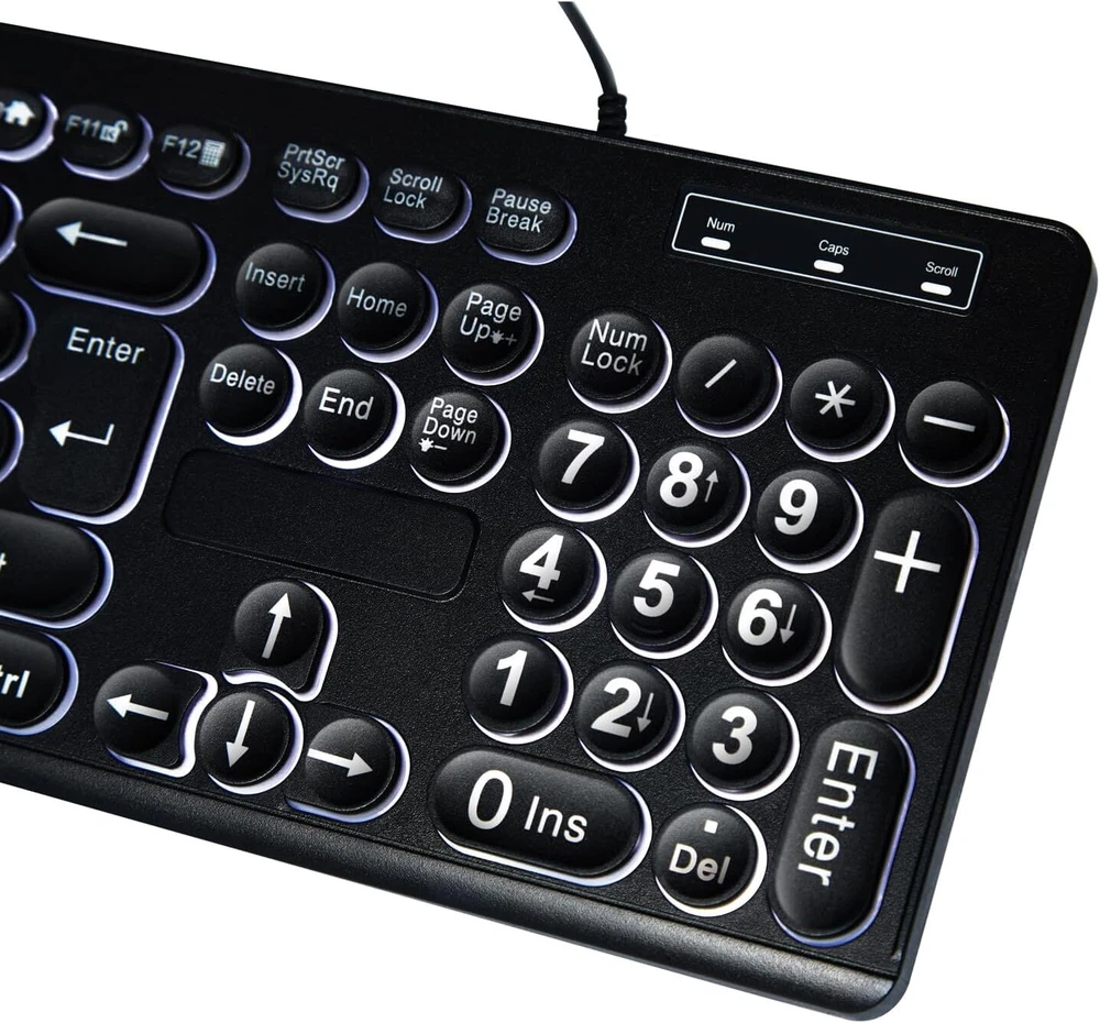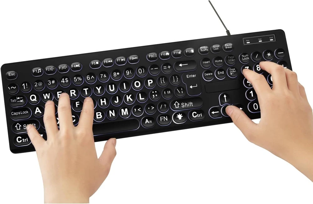 Large Print Keyboard with White LED Backlight, 104 Keys, USB, Adjustable Brightn