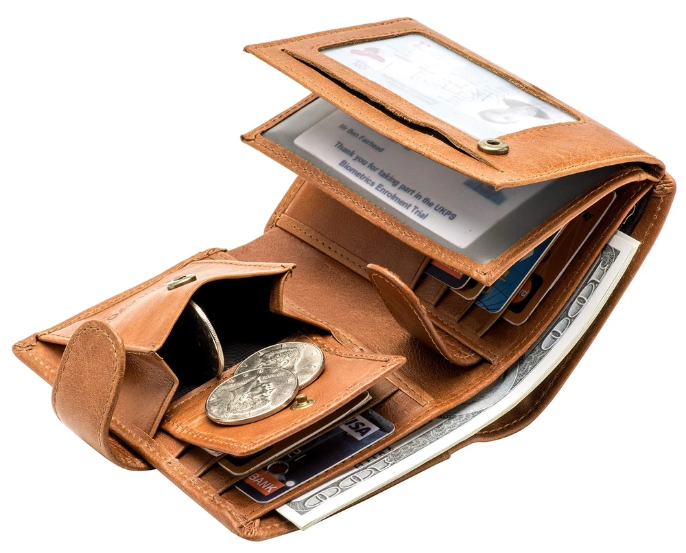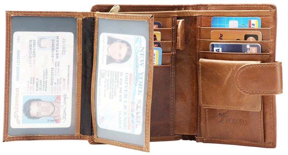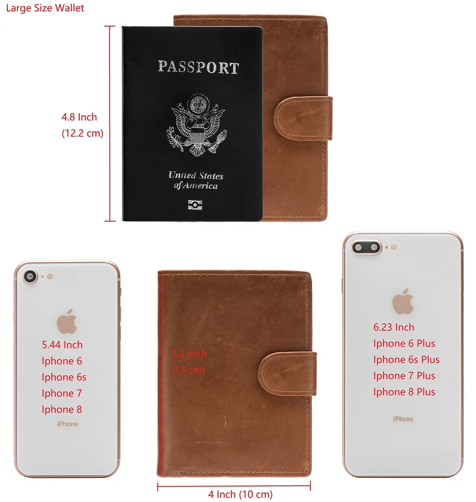Big Large Size: It's a large big wallet,more like a men purse,there is a comparison with Iphone 7 in the picture.please pay attention to the size you want.folded (Lx W x H: 5.25" x 4" x 0.9") . with 2 bill pockets,1 zipper pocket,11 credit card slots,3 picture slots,1 coin pocket with snap Material: Genuine cowhide leather, breathable and lightweight Multi Function: Organizer for cash/coin/ID cards/credit cards/SD cards/receipts etc,simple and classic design,from casual to business,great for travel or every day using Safety and Privacy: The wallets are equipped with advanced RFID security technology by using unique military-grade proprietary blocking material.Convenient to Carry, Reasonable structure, can be folded and high safety, it's very convenient to carry it to go shopping and travel Sales Support: I am sure you will like our leather wallet, but if any problem, please contact us freely, we will solve it in favor of your right
