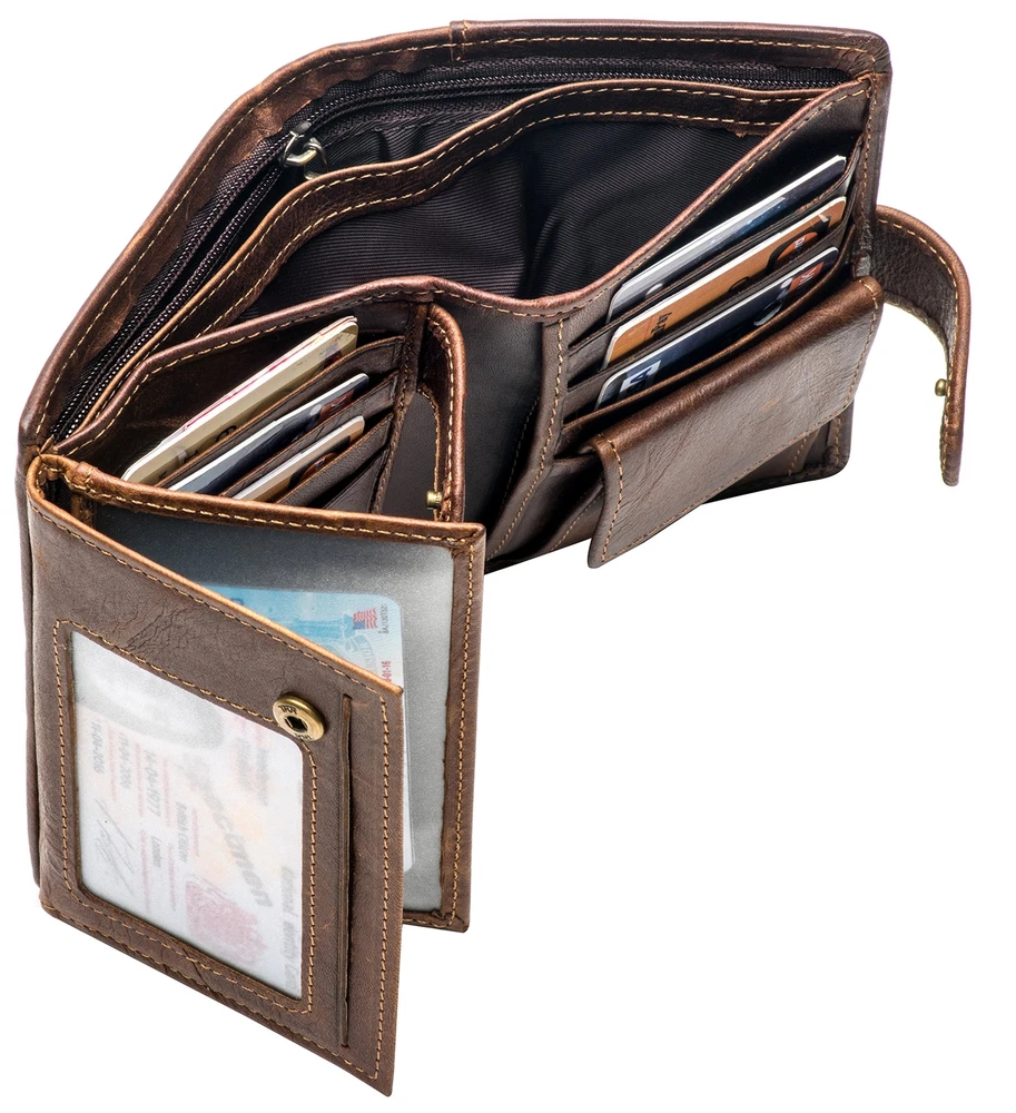 Large RFID Genuine Leather Card Holder Trifold Wallet Snap Closure 3 ID Windo...
