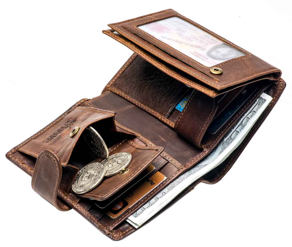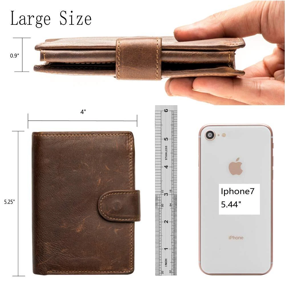 Big Large Size: It's a large big wallet,more like a men purse,there is a comparison with Iphone 7 in the picture.please pay attention to the size you want.folded (Lx W x H: 5.25" x 4" x 0.9") . with 2 bill pockets,1 zipper pocket,14 credit card slots,3 picture slots,1 coin pocket with snap.Passport cannot be put in the wallet. Material: Genuine cowhide leather, breathable and lightweight Multi Function:Organizer for cash/coin/ID cards/credit cards/SD cards/receipts etc,simple and classic design,from casual to business,great for travel or every day using. Safety and Privacy: The wallets are equipped with advanced RFID security technology by using unique military-grade proprietary blocking material.Convenient to Carry, Reasonable structure, can be folded and high safety, it's very convenient to carry it to go shopping and travel Sales Support: I am sure you will like our leather wallet, but if any problem, please contact us freely, we will solve it in favor of your right
