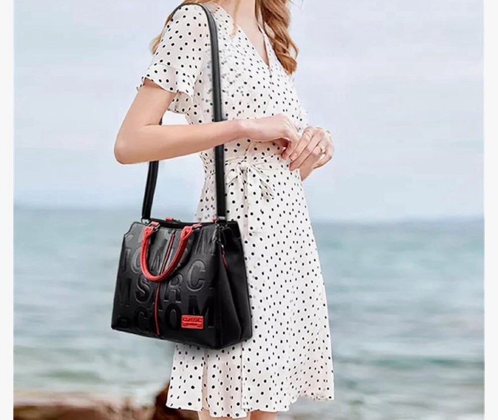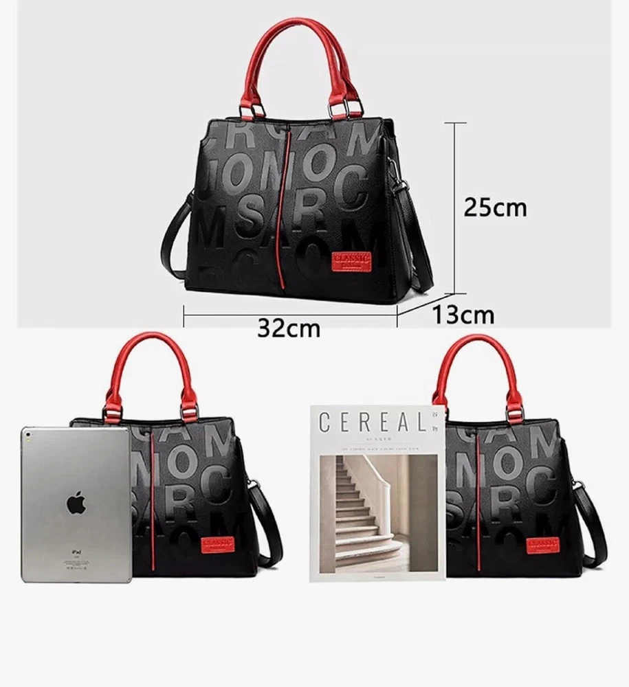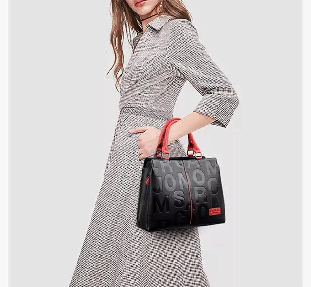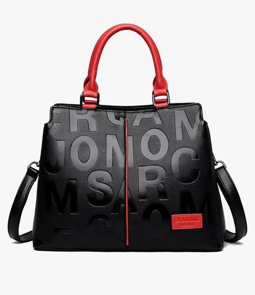 A stylish large tote bag in red and black with a crossbody strap. It features a zip closure, gold hardware accents, a coated finish, and a logo pattern. The bag is made of faux leather with a rayon fabric lining in red. It has inner and outer pockets, inner dividers, and an adjustable shoulder strap. Perfect for travel, casual outings, workwear, or business use.