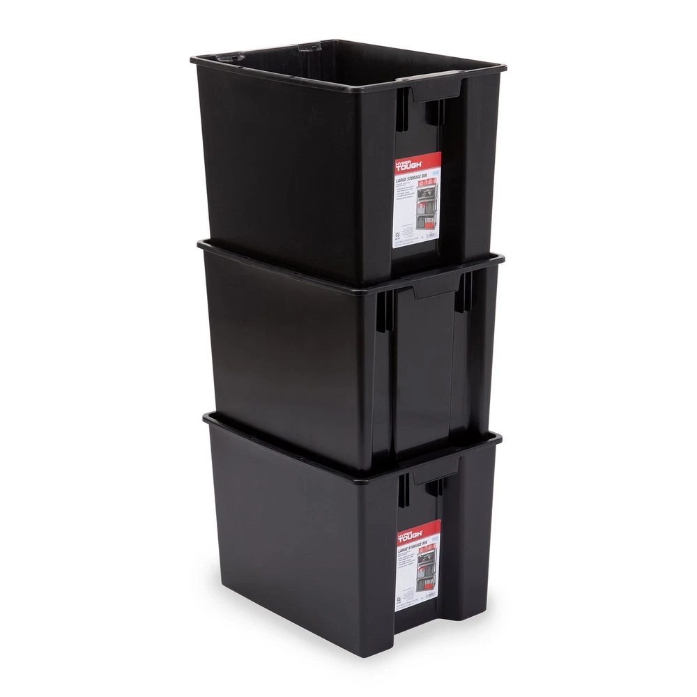 When you are looking to organize your garage or storage space, this 14.84 Gallon Storage Bin is perfect. Fits on the fixed shelving units sold at Walmart. Stacks for vertical storage as well. Conveniently nests inside itself when not in use. Can also be used with the small & medium bin. Made of durable plastic and are rust, water and corrosion proof. Durable handles for easy portability.