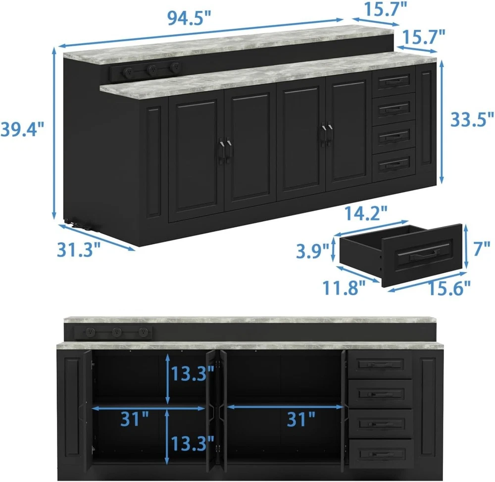 Product Description Large Stationary Kitchen Island with Charging Station, Modern Storage Kitchen Island Table with Drawers and Shelves, Marble Grey Desktops, Black 31.3”D x 94.5”W x 39.4”H Charging Station - This modern kitchen cart island features charging station with 3 ports to meet your charging needs. The ports are removable to fit your electric cookers, blender and microwave. Featuring 4 drawers and 2 large cabinets with shelves, this island offers plenty of storage to organizer your kitchen items. Mable Grey Desktops - Double layered design with marble veneered desktops showcase a modern look for this large kitchen island. You’ll have enough space to place food containers, bowls, plates, cookers and more. Stable & Durable - The stationary kitchen island is mainly made of quality MDF and the desktops are made of particle boards. Raised base enhances stability and black painted surface prolongs service life. The desktop is 30mm thickness, which is sturdy enough for daily use. 2-Person Assembly - To make sure the stability, this item is divided into a large number of pieces. Please follow the instructions step by step with all your caution. Every piece is labeled and all hardwares are included with instructions. Overall Dimension: 31.3”(W) x 94.5”(D) x39.4”(H). Before Assembly - The item will come with 3 boxes, including a clear manual and necessary hardware. Please check all parts are received and intact before assembly process and follow the directions to setup carefully. The 3 boxes may not arrive at the same time, please wait patiently.
