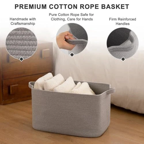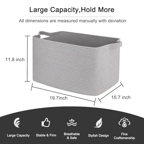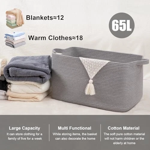 Item Weight: 2.8 Pounds Included Components: Handle Recommended Uses For Product: Storage and organization for blankets, pillows, clothes, toys, sh Material: Cotton Item Height: 1 UPC: Does Not Apply Unit Count: 1.0 Count Manufacturer: Does Not Apply Item Width: 1 Brand: Does Not Apply gtin13: Does Not Apply Item model number: Basket Pattern: Solid Product Dimensions: 19.7"L x 15.7"W x 11.8"H Special Features: Collapsible Special Feature: Collapsible Opening Mechanism: Open Top Shape: Rectangular Number Of Pieces: 1 Item Package Quantity: 1 Handle Material: Cotton Item Length: 1 Closure Type: Open Top Style: Modern MPN: Does Not Apply Batteries Included: No Number of Items: 1 EAN: Does Not Apply Country of Origin: China Storage Volume: 65 Liters Color: Grey Batteries Required: No Capacity: 65 Liters Water Resistance Level: Not Water Resistant Date First Available: March 4, 2024 Finish: Natural Size: 65L Type: Does Not Apply Number of Compartments: 1