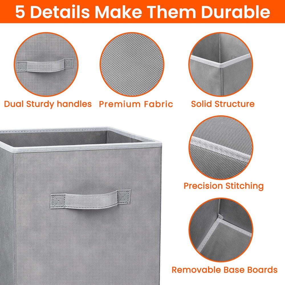 【QUALITY STRUCTURE】These cubby storage bins are made from tough non-woven fabric with excellent sewing to make them last, heavy cardboards added at the sides and bottom to make this storage bins rigid enough to hold a heavy load. 【FIT WITH MOST OF FURNISHING】Measuring 13x13x13 inches, our 8 pack Grey clothes storage bins could fit perfectly with most of cube organizer, shelf, closet, from bedroom to playroom to laundry room, to store clothes, linens, toyes, books etc. Great for dorm room. Color: Grey. 【EASY GRIP】These fabric storage cubes have two sewn-in handles on the sides for easy room-to-room carrying or removing on a shelf. With the reinfored handles, they could work well as drawers, open-top bins, or storage baskets for shelves. 【COLLAPSIBLE DESIGN】These cube storage bins could be fold flat for compact use when not in use. 【SPACE SAVING】These square storage bin is dorm room essentials and apartment essentials for closet storage and organization, making all rooms neat and clean.