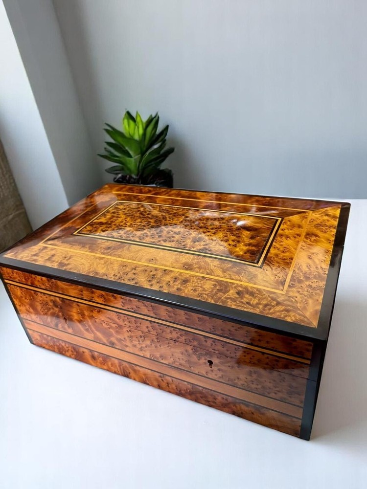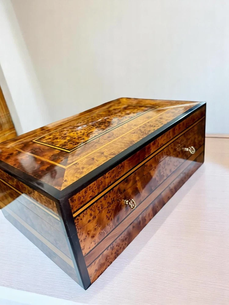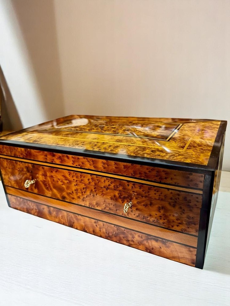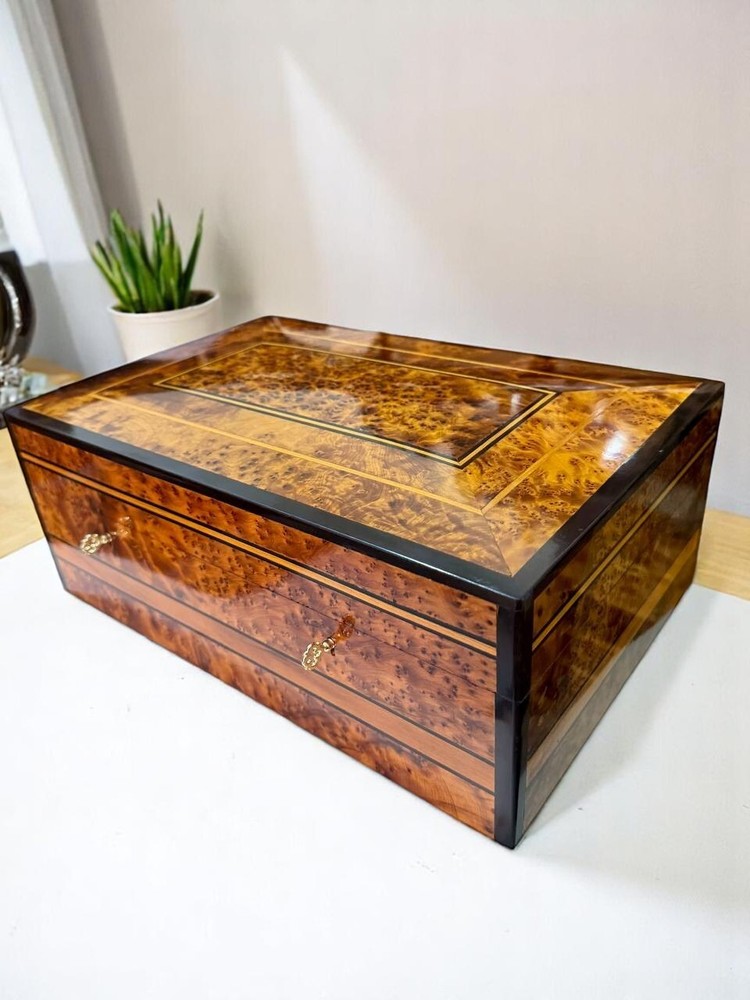 Elevate your storage with this Large Burl Wooden Thuya Jewelry Organizer, expertly handcrafted by Moroccan artisans using rare Thuya root burl. Designed to hold and protect your most cherished items, this statement piece offers both refined beauty and practical functionality. 🌿 Exceptional Thuya Burl Wood This luxurious jewelry box is made from aromatic Thuya wood, known for its rich scent, intricate swirling grain, and deep amber tones. Each box is unique—no two grains are alike—making it a functional work of art. ✨ Key Features: • Large capacity for organizing jewelry, documents, and keepsakes • Lockable with brass key for added security • Premium Thuya burl wood from the Atlas Mountains of Morocco • Velvet or leather interior available (optional) • Ideal as a luxury gift or heirloom-quality personal box 📏 Product Dimensions: • Length: 36 cm (14.2 in) • Width: 23 cm (9.1 in) • Height: 13 cm (5.1 in) 🎁 A Gift of Meaning and Craftsmanship Whether for weddings, anniversaries, or legacy gifting, this large burl Thuya wood jewelry box offers timeless value and unmatched artisan quality. 📩 Need Customization? We can engrave your name, message, or logo on the lid. Feel free to message us to customize your box or view additional patterns and finishes.