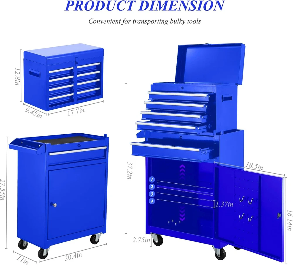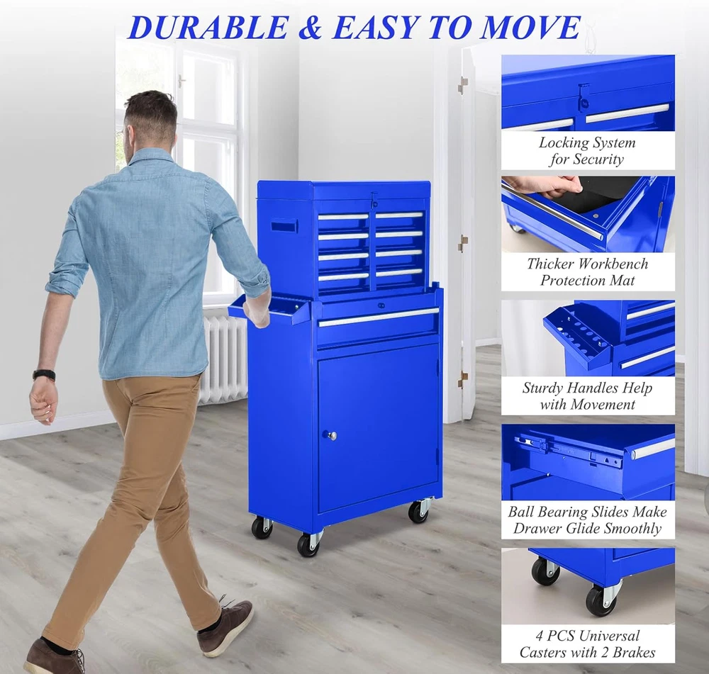 Store New Arrivals Add to Favorite View Feedback Contact Large Tool Box,5 Drawer Blue Rolling Tool Chest on Wheels with Snap on Tool Box Top Chest,Locking Mechanic Tool Cabinets for Garage,Workshop,Repair Shop Description Item model number W110265908 Number of Shelves 1 Assembly Required Yes Color Tool Cart With Top Chest Blue Special Feature Heavy Duty Product Dimensions 22.95"D x 10.98"W x 47.24"H Material Main Metal Country of Origin China Item Weight 46.6 pounds Handle Material Metal Frame Material Metal Caster Type Swivel Number of Wheels 4 Recommended Uses For Product Indoor, Outdoor Target Audience Unisex Adult Weight Limit 15 Kilograms ✔ MULTI-FUNCTIONAL TOOL CHEST WITH DRAWERS:This tool cart on wheels can be disassembled into two:4-drawer tool box top chest and a rolling tool cabinet, which can be used separately or together according to your needs. Besides, the top tool box can also be stored inside the bottom cabinet to save space. ✔ LARGE TOOL CABINETS ON WHEELS:Tool boxes with top tray,5 drawers, large bottom cabinet,side tool rack and 4 removable hooks provide ample storage space for various tools such as screwdrivers, spanners, boxes, etc. And the 3 level adjustable shelf on the bottom cabinet allows you to customize the storage space. ✔ EASY TO MOVE:This rolling tool box has pull handle and 4 universal wheels make it easy to move the rolling tool chest around.Two of the wheels are lockable to ensure that the tool box stays in place.Product assembled dimensions (in.):22.95 x 11x 47.25. ✔ EASY INSTALLATION:The garage tool box easy to install,it come with detailed instructions to help you with the installation. This rolling toolbox is great for home workshops and some professional environments and could be placed in the garage, workshop, warehouse, etc. ✔ PRACTICAL MECHANIC TOOL CART:Locking tool chest with drawers overall bearing capacity is 100KG. The bearing capacity of drawers is 15KG with ball guide rails.whether it is furniture maintenance, garage maintenance tools storage, automobile machinery or DIY anything you want, it can meet the requirements. Product Description MULTI COLOR OPTIONS Black Blue Orange ABOUT US We offer the best prices around on high quality products. Our E-store includes media such as books, movies, music and games while offering electronics, toys, sporting apparel, clothing, tools, general home, garden items and more. SHIPPING We are always working hard to ensure your package arrives as soon as possible. Please understand that some factors like weather, high postal traffic, and the performance of shipping companies are outside of our control. We offer free shipping to the lower 48 states and ship within 2 business days of payment, usually sooner. We do not accept P.O. Boxes. Please provide a physical address. For shipping outside of the continental USA, we only use eBay's Global Shipping Program.The item is shipped to KY and then sent to the rest of the world. International customers are responsible for all duties and taxes. Continue to check out in order to calculate costs for shipping the item to your country. Messages regarding eBay's Global Shipping Program MUST be directed at eBay EXCLUSIVELY. RETURNS We offer a 30-Day Return Policy on items which you are not completely satisfied with. You have the option for a full-refund or an exchange of the item. No returns are available on items shipped outside of the USA. PAYMENT We accept PayPal. CONTACT US This page content is yet to come Please ad us to your favorite seller and visit again later Thank You CUSTOMER SATISFACTION We try our very best to make sure every customer is completely satisfied. If there's a problem, message us! We're happy to help. WE ACCEPT Copyright © 2021 AutoDS. | All Rights Reserved
