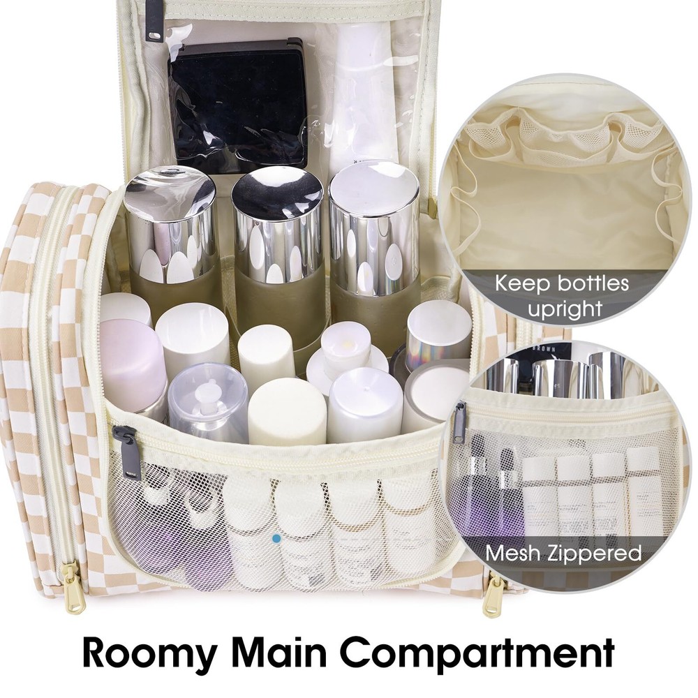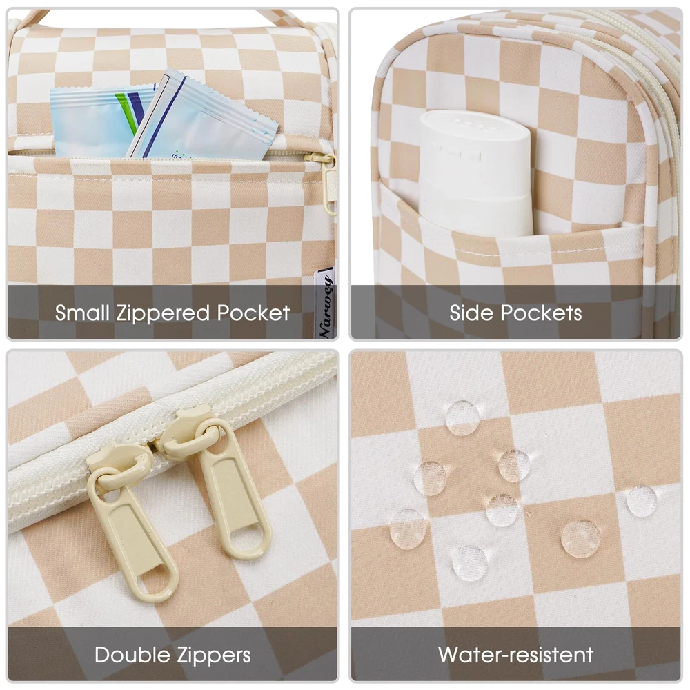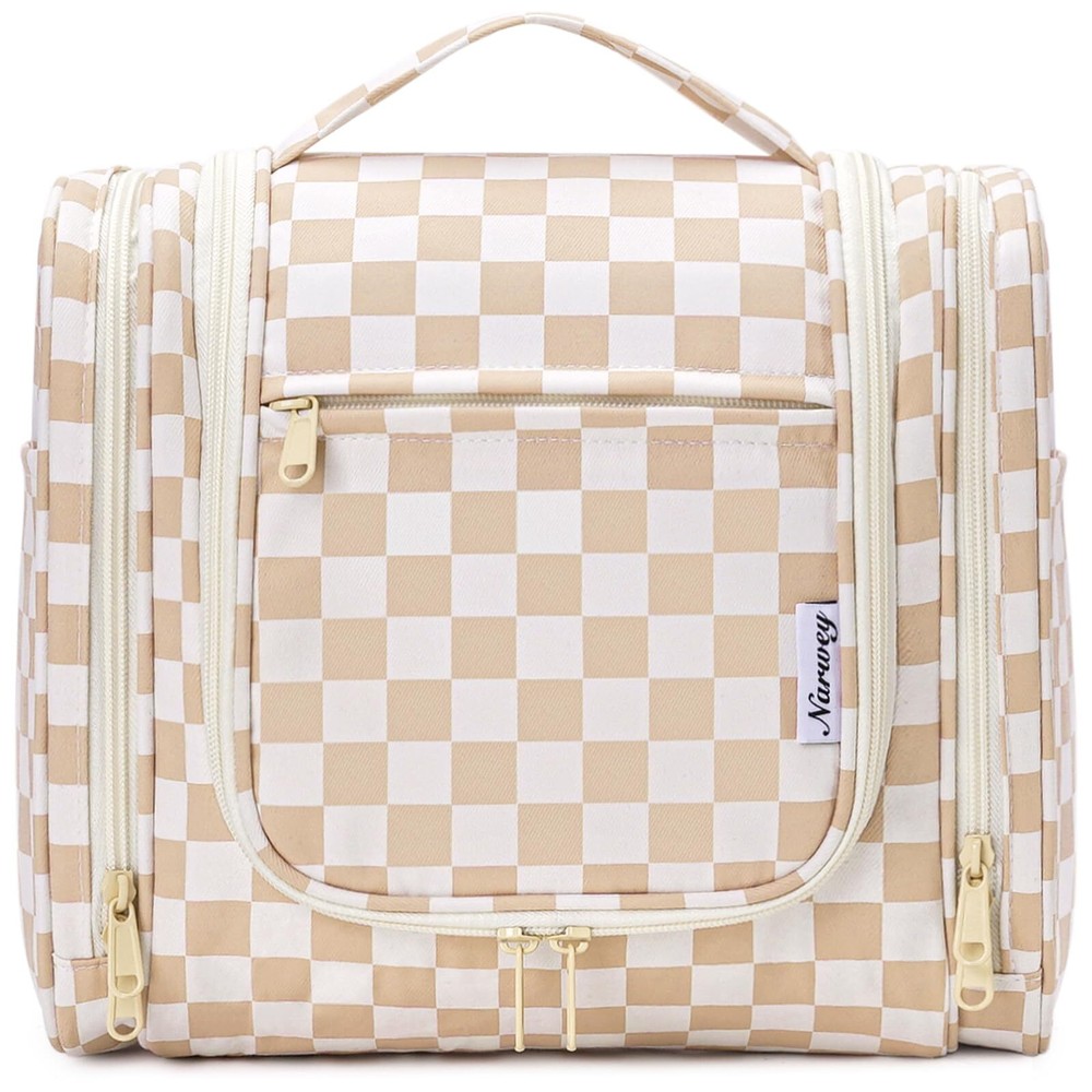 Narwey Large Hanging Toiletry Bag for Women Travel Makeup Bag Organizer Toiletries Bag Dry Wet Separation (Light Brown Checkerboard) Practical 10.2" Tall. Dimension:11"x10.2"x5”/28x26x13cm. The main compartment featured with several mesh pockets and elastic bands has a practical height of 26cm (10.2") which could easily well organize travel-size toiletries as well as makeup like shampoo, conditioner, lotion, toothpaste, toothbrushes, hair brush, shaving kit and a few extra items Dry Wet Separated Side Pockets. PVC-lined compartments on both sides are dustproof and enable effective wet-dry separation. The left side features 4 elastic bands and a mesh pocket for makeup tools, while the right side has 2 wider elastic bands and a mesh pocket for toothpaste, toothbrushes, and wet towels Not Bulky Design. Large capacity yet compact design, weighs merely 14 ounces. Pack-it-flat design ensures it doesn't occupy much space in your suitcase Details Oriented. Built-in large metal hook allows hanging the toiletry case from towel rack, coat hook or wherever is available, making your toiletries and cosmetics displayed well for easy access, saving bathroom counter space as well. Water-resistant and durable fabric protects your gear from spills. Soft fabric and reliable zippers ensure durability. Wide opening and rectangle shape makes it easy to stand on its own Versatile. Compact, sturdy, portable, lightweight, which makes it a good for business trips, travel, gym, camping, home use and more SHIPPING Domestic Buyers - We have confidence in our products, but if you are not fully satisfied please contact us within 30 days of purchase and you will get full refund. - We ship within 3 business days of payment, usually sooner - We offer FREE shipping on all orders! - We only ship to the lower 48 states, no APO/FPO addresses or PO Boxes allowed International buyers – please note: Import duties, taxes, and charges aren't included in the item price or postage cost. These charges are the buyer's responsibility. - Please check with your country's customs office to determine what these additional costs will be prior to bidding or buying. * Order Cancellation Policy ** You can return a product for up to 30 days from the date you purchased it. 1. The seller reserves the right to cancel the special case only due to eBay cancellation fee. 2. The decision of seller is the final. 3. The seller will respond to the cancellation request within 2 business days. Please wait for the result of cancellation. 4. In case the cancellation is not completed by some reasons, the buyer can follow the options below to get the refund. 4.1 The buyer can reject the item when it arrives. 4.2 The buyer can send the item back to the seller within 30 days If the buyer receives item (USA Shipment ONLY). The seller will provide the FREE return label to the buyer when the buyer opens " Return Item" case on eBay by using the reason as "Change my mind" ONLY. 5. When buyer has placed the order. The order will be processed and completed by automatic warehouse system within 5 minutes. In case that buyer sends the cancellation request after 5 minutes of placing the order, the request will be rejected. **Sending direct message to cancel the order is not allowed for every case.* Return Policy For the return case - If buyer would like to return the items for refund or replacement, please CONTACT SELLER to receive the free return label from seller. The refund or replacement will be processed with the tracking number of return label which is provided by seller only. The other ways of return which are not approved by seller will not be processed for the refund or replacement.