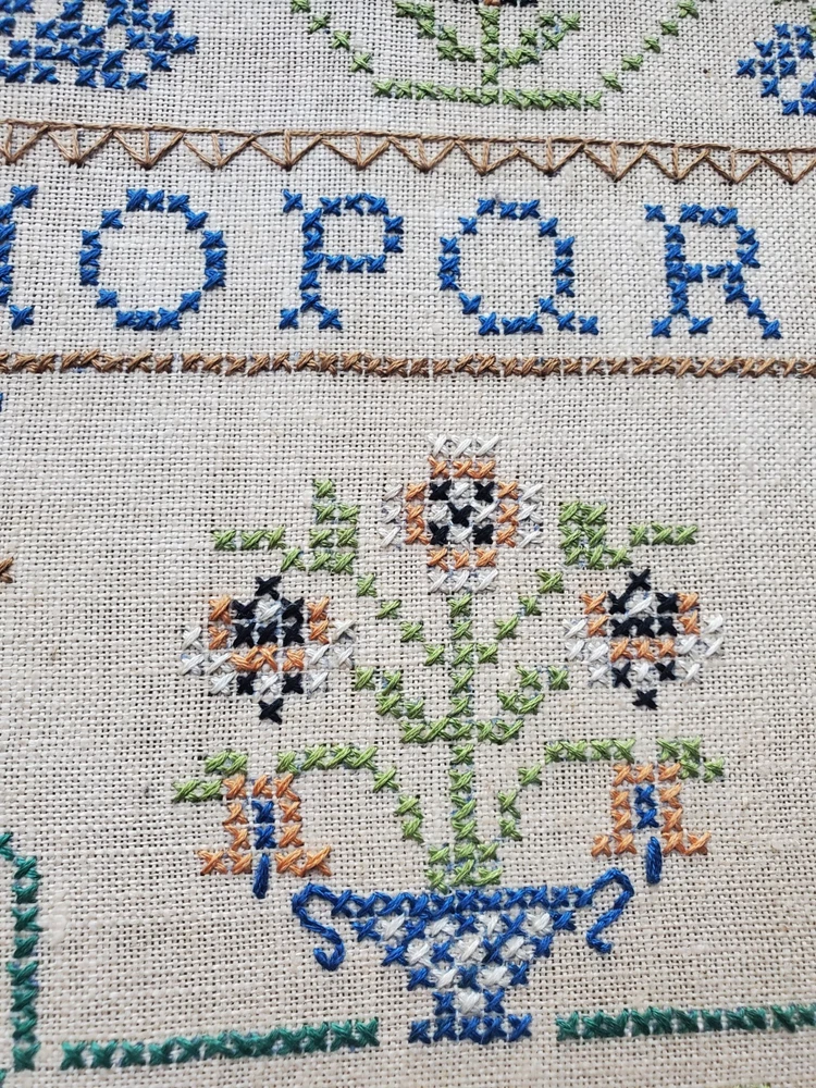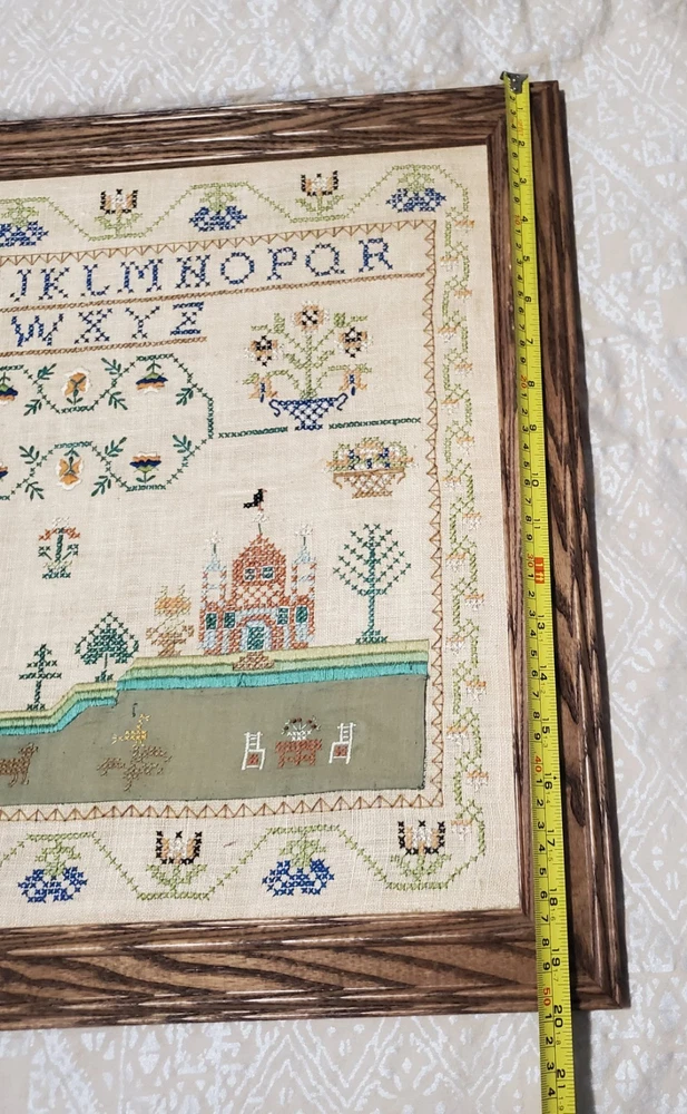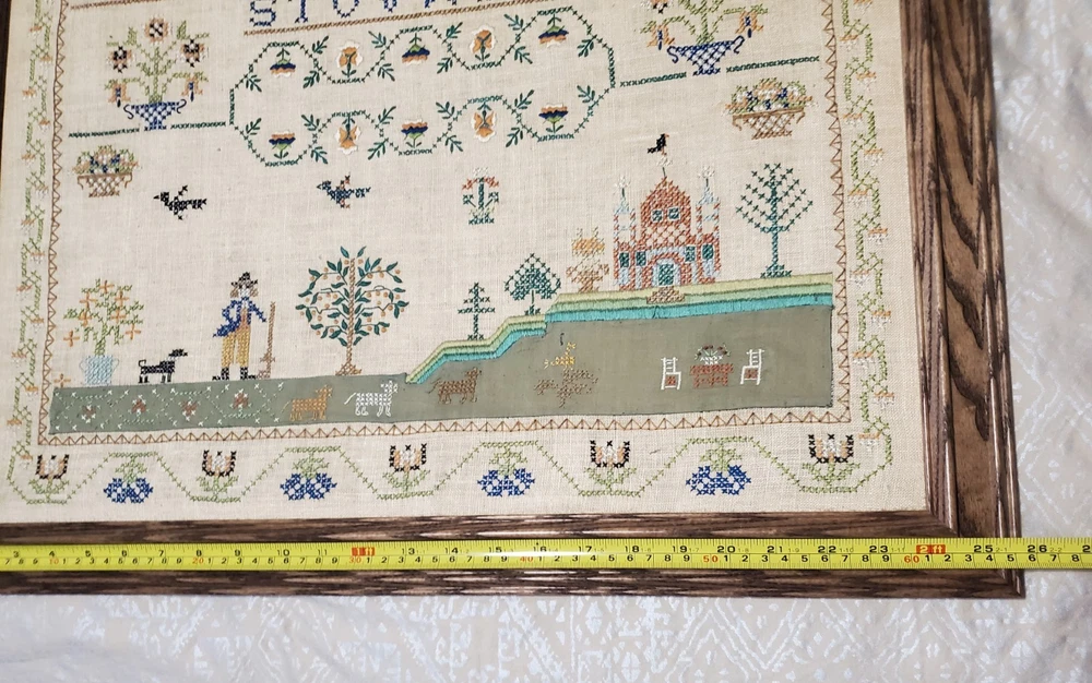 This listing is for a beautiful, large vintage cross-stitch sampler in a dark wood frame. This piece of handmade folk art features a classic layout with the complete alphabet, decorative floral borders, and a charming pastoral farm scene. Features: Dimensions: Measures approximately 25.5" W x 20" H (including frame). Design: Traditional sampler motifs including an alphabet, flowers, birds, a man with a dog, trees, and a house/church building. Condition: The cross-stitching and the wooden frame are in very good vintage condition. The paper backing on the reverse side of the frame is torn, which is typical for vintage pieces (see photos). The front of the piece displays beautifully. Handmade & Unique: A one-of-a-kind, hand-stitched piece perfect for farmhouse or country-style decor. Please review all photos carefully as they are part of the item description.