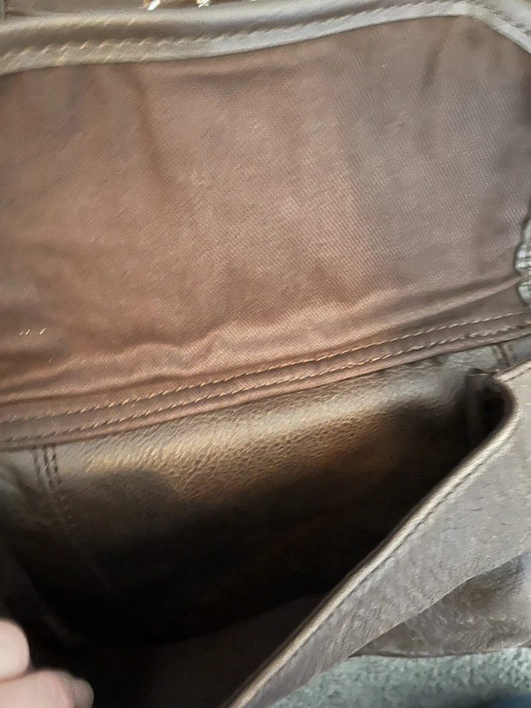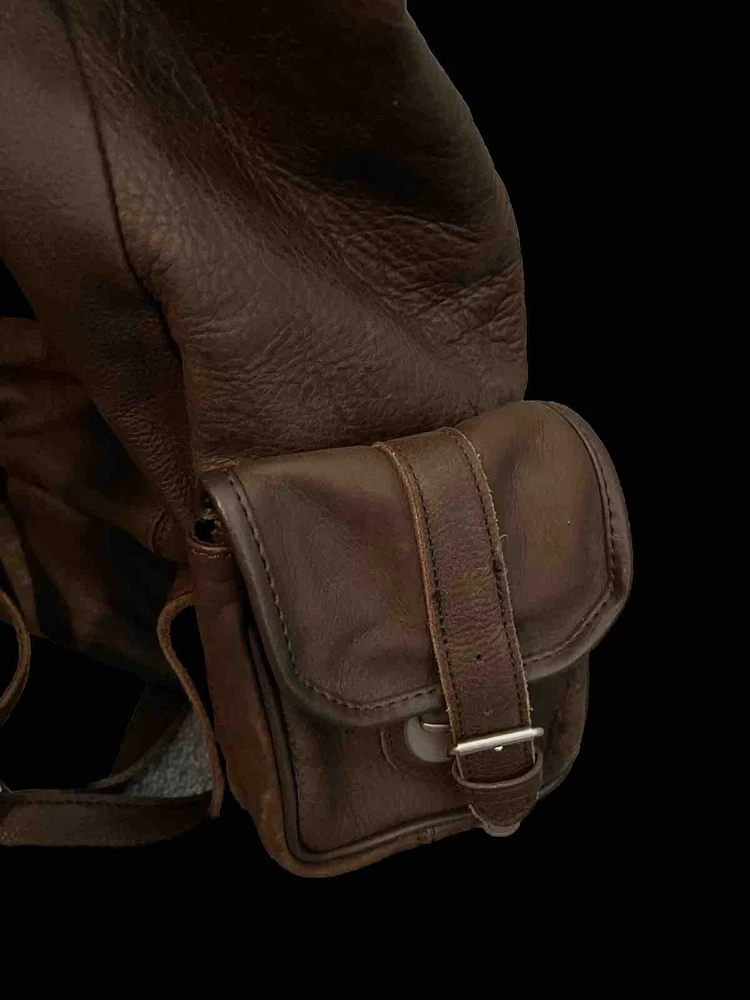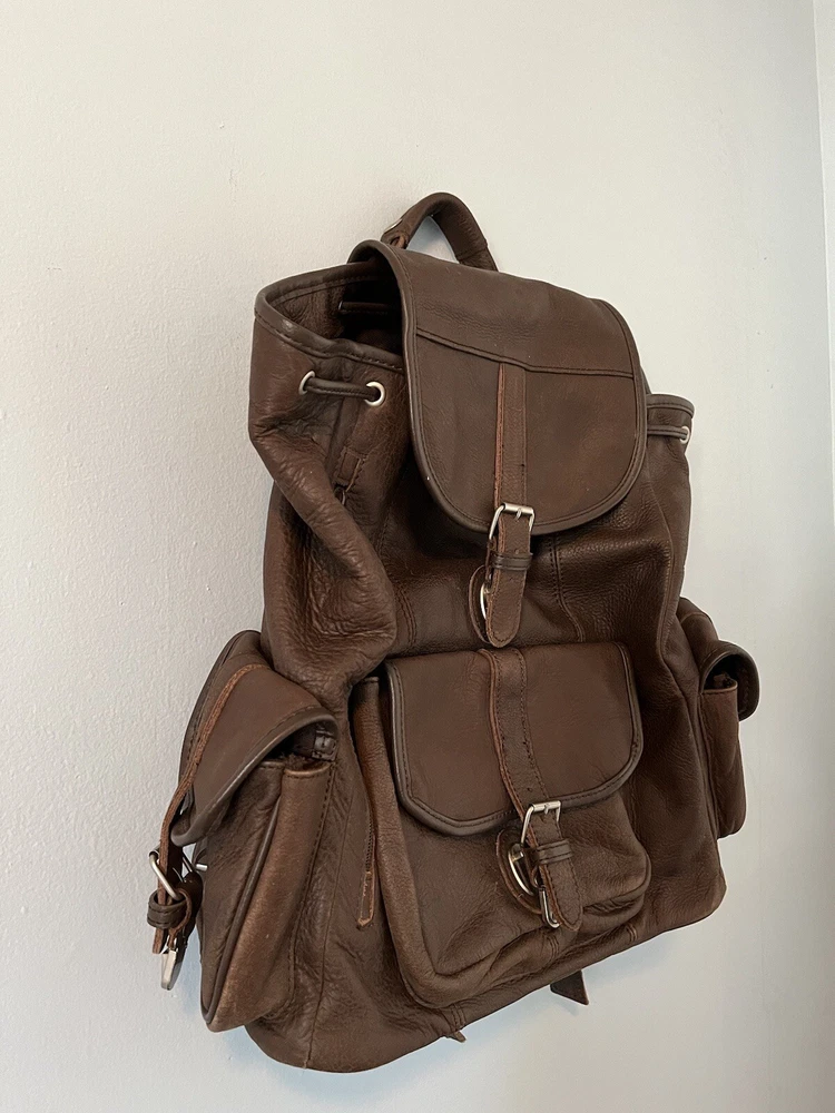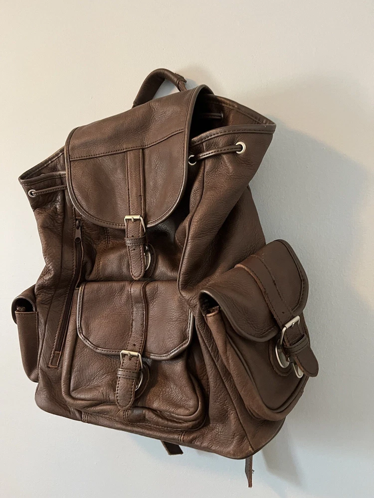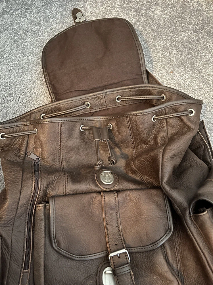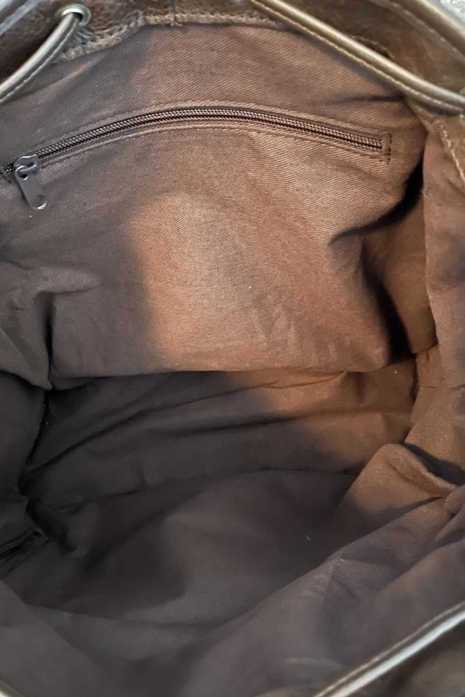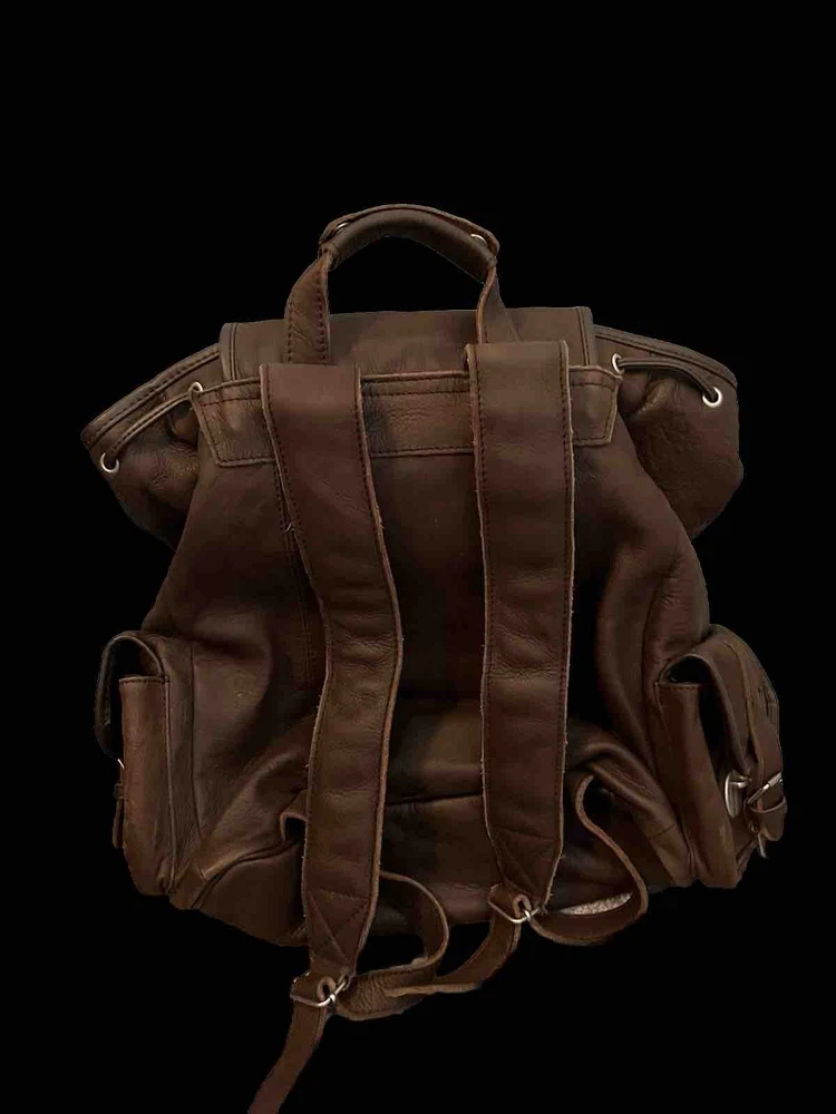 This is a large vintage brown leather drawstring backpack designed for casual use. Made from genuine leather with a solid pattern, it features a rugged style suitable for travel. The backpack has a drawstring closure, leather lining and silver hardware. Ideal for men, it exudes a classic and durable appeal for everyday use or outdoor adventures.