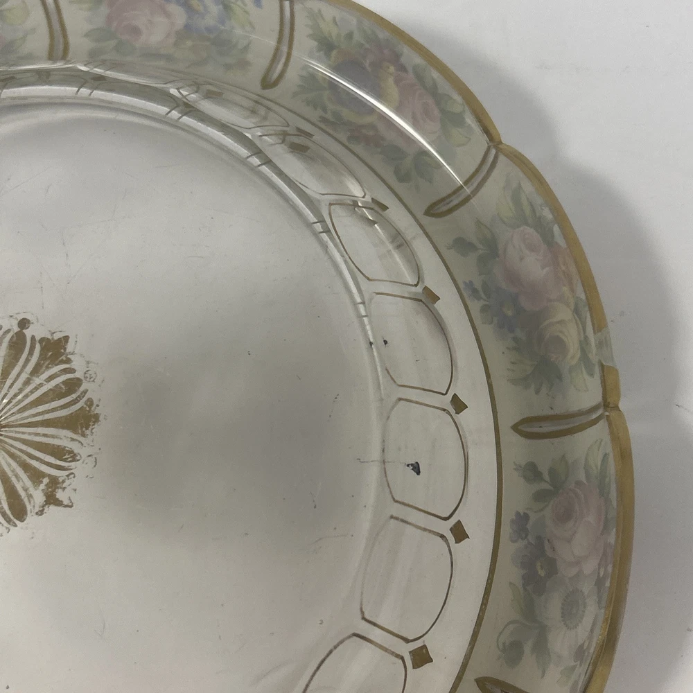 Large Vintage Glass Shallow TRINKET DISH w/Gold Detail Rim w/ Flowers Pink Blue