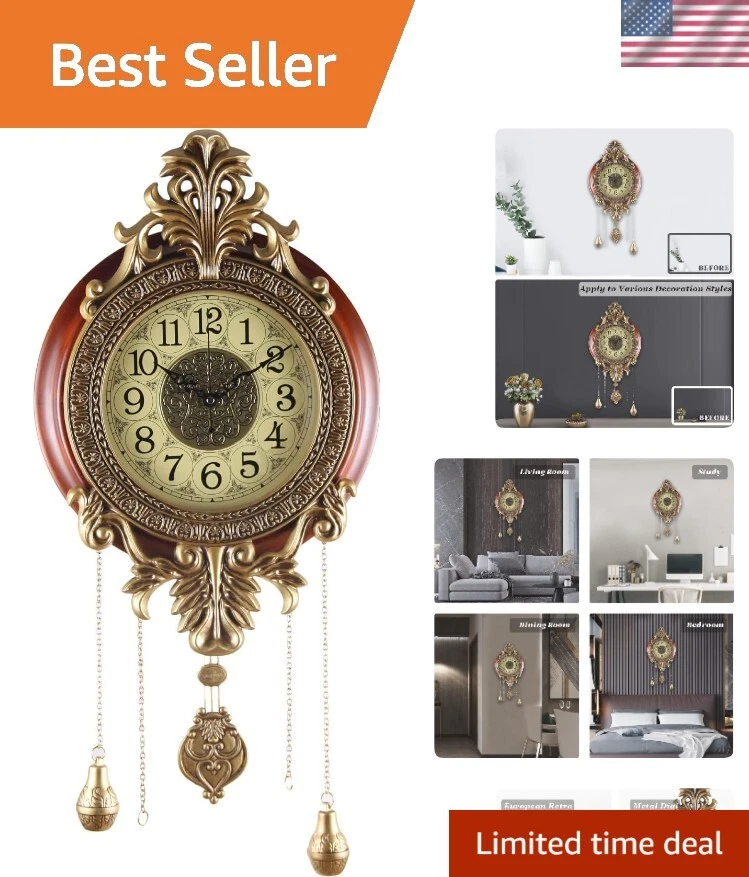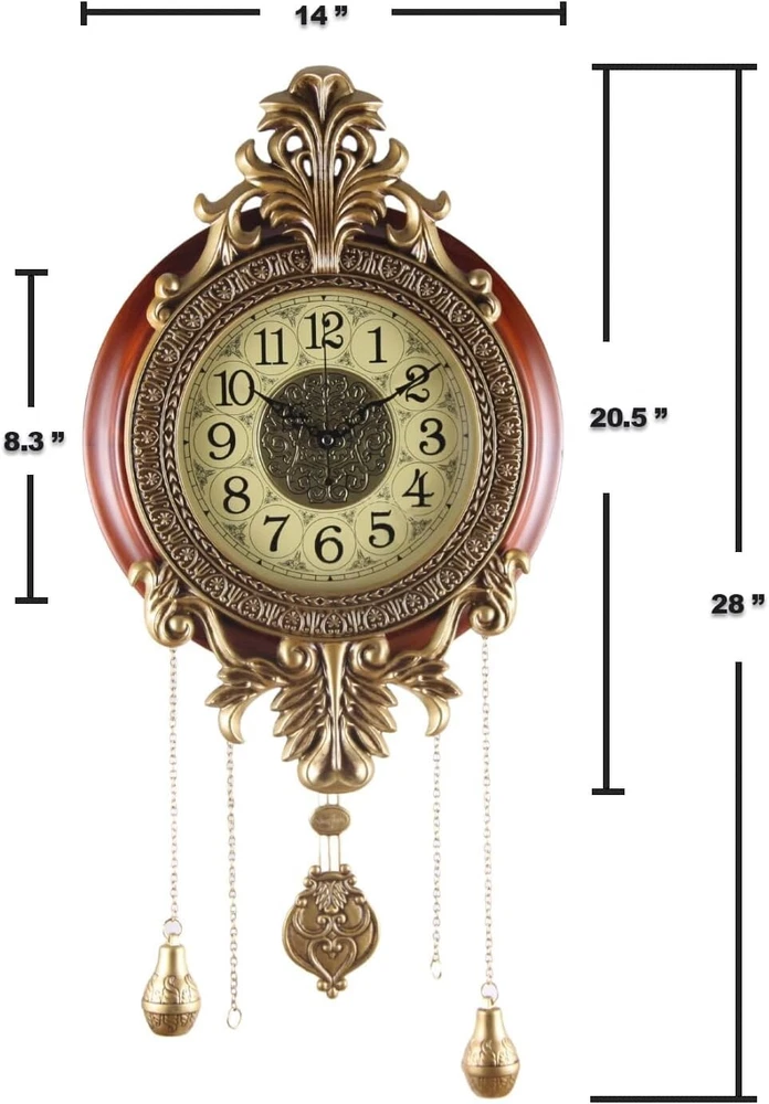 Large Wall Clock with Pendulum, Real Wood Retro Style, Battery Operated, Vintage Royal Decor for Home Living Bedroom DECORATION: You'll Get Many Compliments for This Piece of Art, Elegant and Sturdy, Large Size, Metal Carved Decoration, Finished in Victoria Retro Metal Flower Workmanship with Real Wood Circle to Complement Your Home Decor. MATERIAL: Made of Real Solid Wood and Wrought Iron, Analog Time Display, Swinging Pendulum, Scanning Second hands, Imported Mechanism, Long Lasting SATISFACTION GUARANTEEd Life. Silent, for a Quiet Environment. DIMENSIONS: Dial 14", Top to Bottom without Pendulum ", Top to Bottom with Pendulum 28"; DESIGN: Quartz Movement, Battery Operated. Two-Battery Independent Design, one for time, the other for the pendulum. You can un-install the pendulum battery if the pendulum makes you feel dizzy (For the safety of air transportation, 2*AA Batteries Not Included). satisfaction - 12 s of satisfaction included, please contact me if any question. We Strive to Offer Customers Amazing Service.