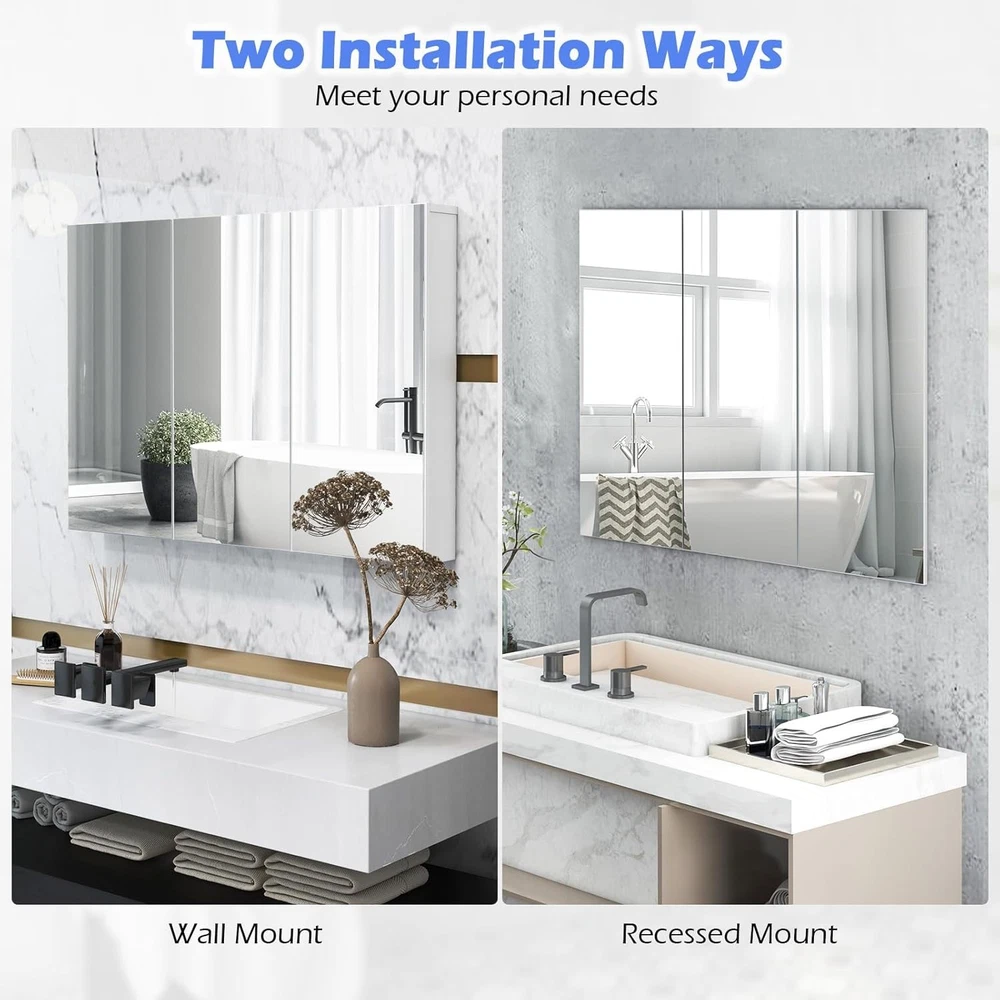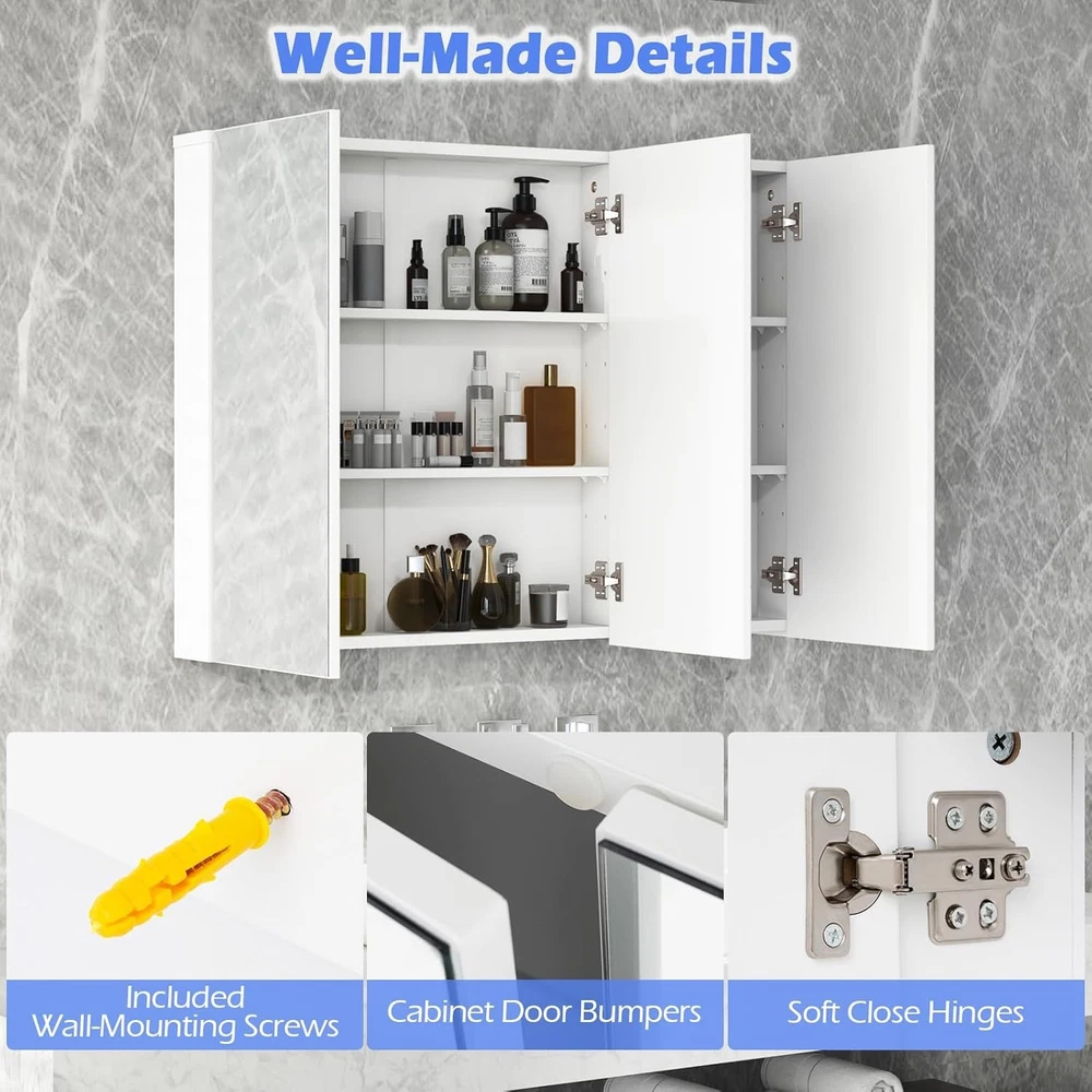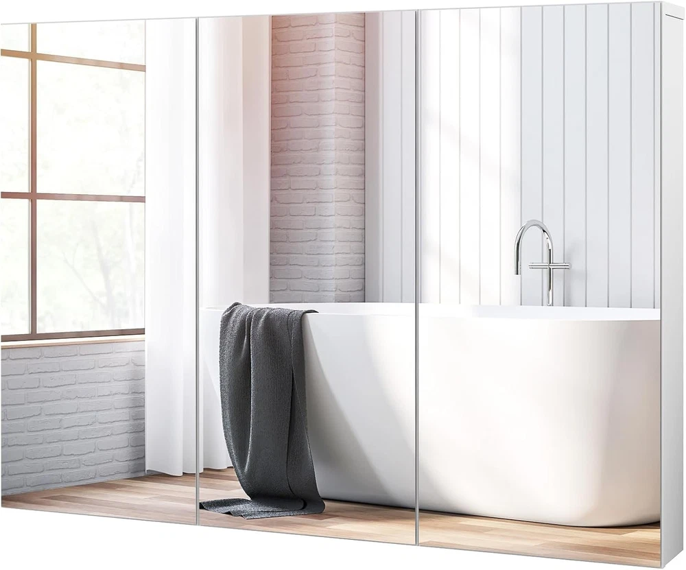 Product Description Specification Color: White Net Weight: 40lbs Shelf Adjustable Height:1" Material: MDF wood, stainless steel, glass Product Dimensions: 36” x 4.5” x 25.5” (L x W x H) Package includes: 1 x Bathroom cabinet 1 x User manual Bathroom Cabinet Wall Mounted Our Medicine Cabinet is suitable for bathroom, living room and any other rooms to store items. 3 mirrors on the cabinet look more bright and spacious, which perfectly add modern feeling to your bathroom or other space. If you are tired of organizing your items over your bathroom counter, then upgrade to this organized and durable wall-mounted storage cabinet.