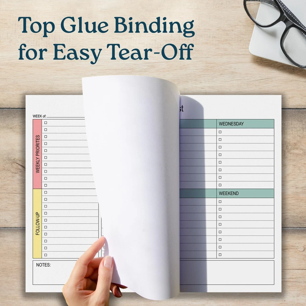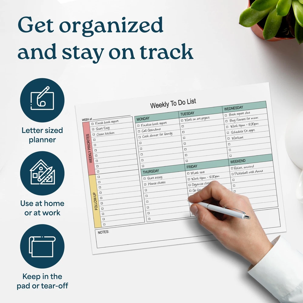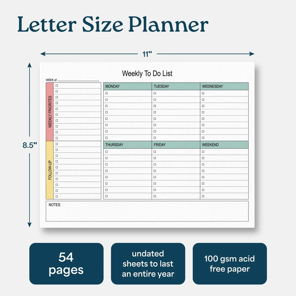 Large Weekly Planning Pad and Matching Notepad, 52 Letter Size Tear-Off Sheets, 8.5” x 11” Undated Weekly Desk Planner Pad, Daily Schedule, Weekly Priorities To Do List,for Work and Home INCREASE YOUR PRODUCTIVITY. Weekly planner with matching notepad . This undated weekly planner pad with 54 tear-off sheets will have you more focused and productive than ever. A perfect size for a desk planner, the weekly notepad is 8.5 x 11 inches, providing plenty of room to track, organize and manage your schedule and weekly tasks. Matching 54 sheet notepad. STAY ORGANIZED AND ON TASK - No more missed deadlines, appointments or forgotten tasks! Keep track of everything with space for a daily schedule, tasks and to-do lists that you can check off as you go. Great for home, work, teachers, students and anyone who wants to be more organized and productive. FLEXIBILTY AND FREEDOM - Embrace the freedom of an undated weekly planner with 54 weeks of undated planning pages. Start, stop and restart anytime! No more wasted spaces or skipped dates. This versatile planner allows you to stay organized in 2024, 2025, 2026 and beyond. HIGH QUALITY MATERIALS AND CONSTRUCTION. Weekly planner and matching notepad are made of 100 GSM smooth & acid-free paper for a smooth writing experience without bleeding. Thick cardboard backing ensures that you can write on the go. High quality glue binding keeps pages securely attached to planner and notepad until you are ready to tear off. PROFESSIONAL DESIGN. Minimalist design to maximize the space for writing down schedules, appointments, tasks, meeting or class notes, reminders and to do lists. INCREASE YOUR PRODUCTIVITY. Weekly planner with matching notepad . This undated weekly planner pad with 54 tear-off sheets will have you more focused and productive than ever. A perfect size for a desk planner, the weekly notepad is 8.5 x 11 inches, providing plenty of room to track, organize and manage your schedule and weekly tasks. Matching 54 sheet notepad. STAY ORGANIZED AND ON TASK - No more missed deadlines, appointments or forgotten tasks! Keep track of everything with space for a daily schedule, tasks and to-do lists that you can check off as you go. Great for home, work, teachers, students and anyone who wants to be more organized and productive. FLEXIBILTY AND FREEDOM - Embrace the freedom of an undated weekly planner with 54 weeks of undated planning pages. Start, stop and restart anytime! No more wasted spaces or skipped dates. This versatile planner allows you to stay organized in 2024, 2025, 2026 and beyond. HIGH QUALITY MATERIALS AND CONSTRUCTION. Weekly planner and matching notepad are made of 100 GSM smooth & acid-free paper for a smooth writing experience without bleeding. Thick cardboard backing ensures that you can write on the go. High quality glue binding keeps pages securely attached to planner and notepad until you are ready to tear off. PROFESSIONAL DESIGN. Minimalist design to maximize the space for writing down schedules, appointments, tasks, meeting or class notes, reminders and to do lists. Shipping from the USA All of our products are shipped from the USA, ensuring quick delivery to your destination. Payment We offer the following payment methods: PayPal, credit card, bank transfer, and eBay's secure payment system. Free Shipping & Free Returns Shipping within the USA is FREE. Additionally, any return is absolutely free for you. Risk-Free Purchase You have the option to return an item within 30 days without any justification. We cover the return shipping costs! Fast Shipping We ship immediately upon receipt of payment. Generally, the package is delivered within 2-3 days in the USA. If it takes longer, we will contact you. Quality and Costs Made in Europe, USA, China No customs fees or additional charges Total satisfaction guarantee Invoice with declared VAT available upon request in .pdf format Feedback Your feedback is very important to us. After you pay for your purchase, you will automatically receive positive feedback from us.